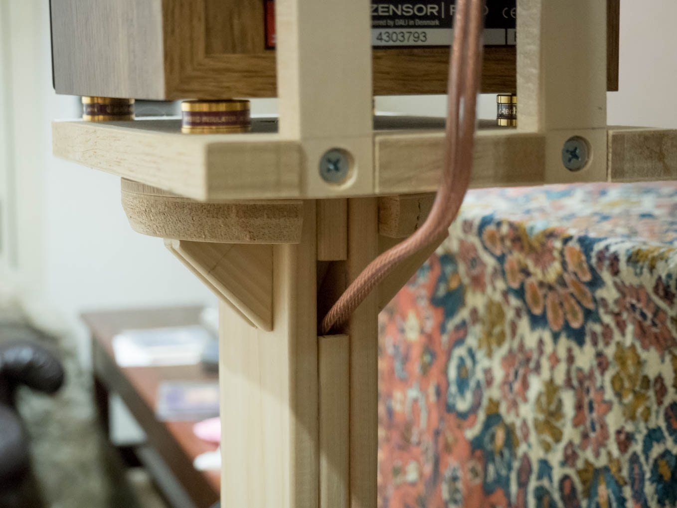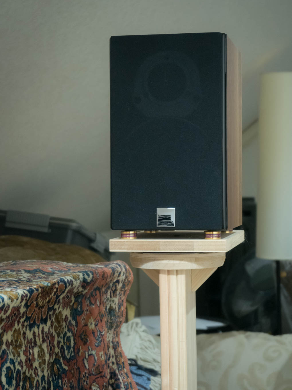 よし、それならスタンドに載せてかっこよく使おうと、写真のようなスピーカスタンドを自作しました。面倒なので塗装せずに使っていますが、木肌のままも趣があってよいものです。