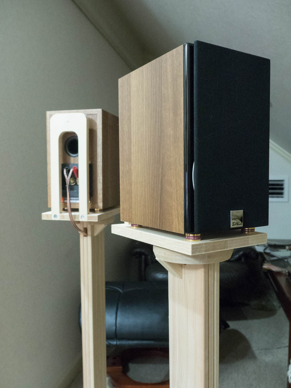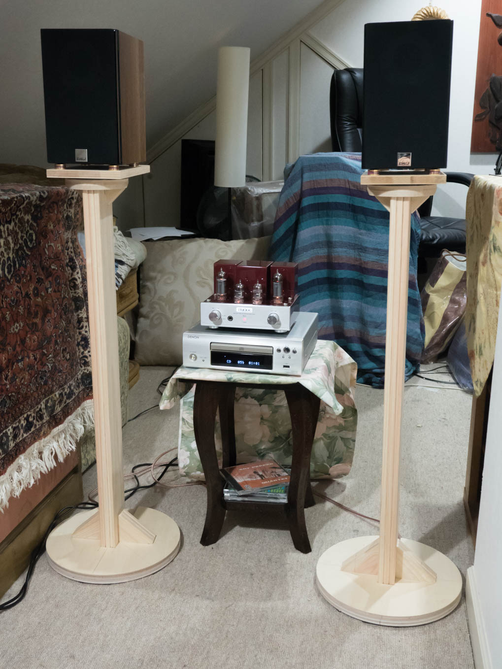 全製作過程をギャラリーに上げてありますのでご興味のある方は参考にしてください。 実際の使用環境は2m前後のニアフィールドで、リクライニング椅子に座って聴くので、スタンドの高さは80cmとしました。目線よりちょっと上にスピーカが来るようになっています。機材は、トライオードの真空管アンプRubyにDENONの普及型CDプレーヤをつないでいます。