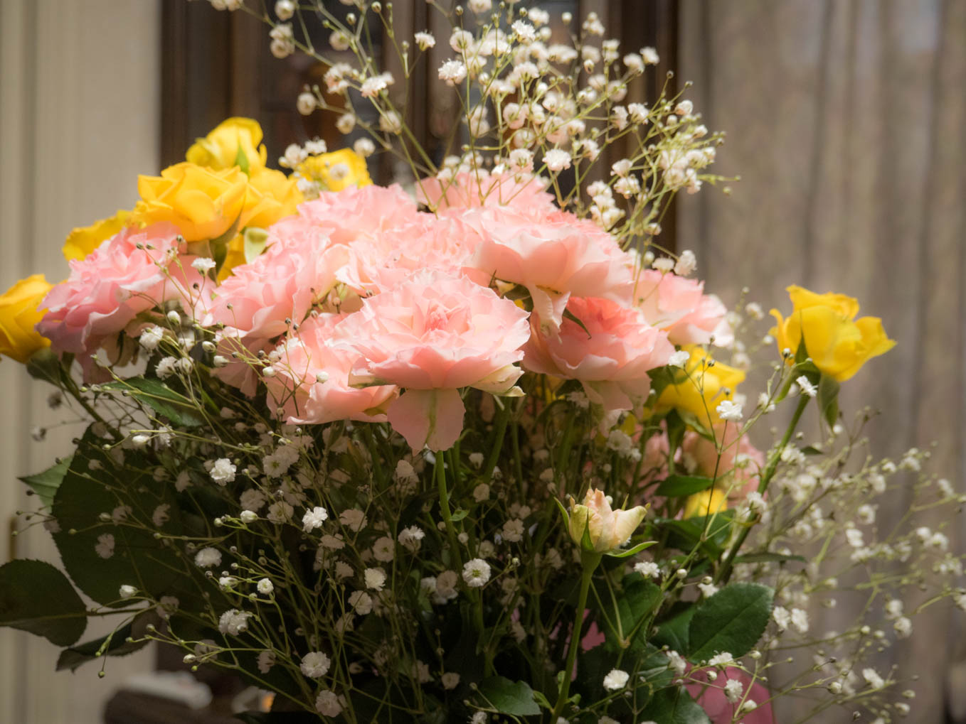 元の勤務先の近くだったので、朝寄って頼んでおくと帰りに受け取れて便利でした。そんなに洒落たお店ではなく市場の中の庶民的なお花屋さんですが、切り花から枝もの鉢ものなど、いつも沢山の種類がおいてあるので花束を作るには困らないし、ついでに季節ものの一枝や鉢も買ってしまいます。そんなわけで、今でも車を飛ばして花束を作ってもらいに出かけています。
