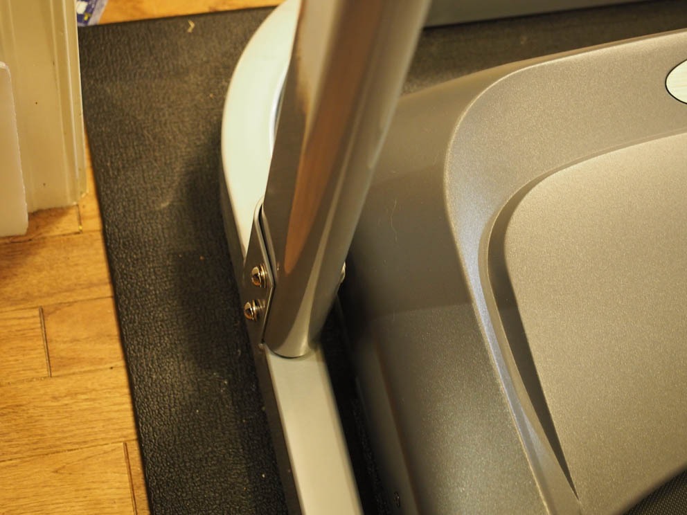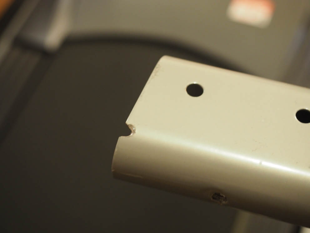 操作パネルを支える脚を本体にはめ込むのですが、はめ込まれる側の内側に、溶接の大きなバリが出ていて脚が最後まで入りません。バリは奥の方にあるし固いのでとても削り落とせる状況ではありません。仕方ないので、上記右の写真のように、差し込む脚の先っぽのバリの当たる個所を削ることにしました。鋼鉄用のビットを使ってドリルで小さな穴をあけそれをヤスリで広げました。これで脚はきっちりとはめ込めるようになりました。こういった作業は、一般的に工具のないお家では無理ですので、修理業者に頼むことになるのでしょう。このような作りの雑なところはやっぱり**製ですね。