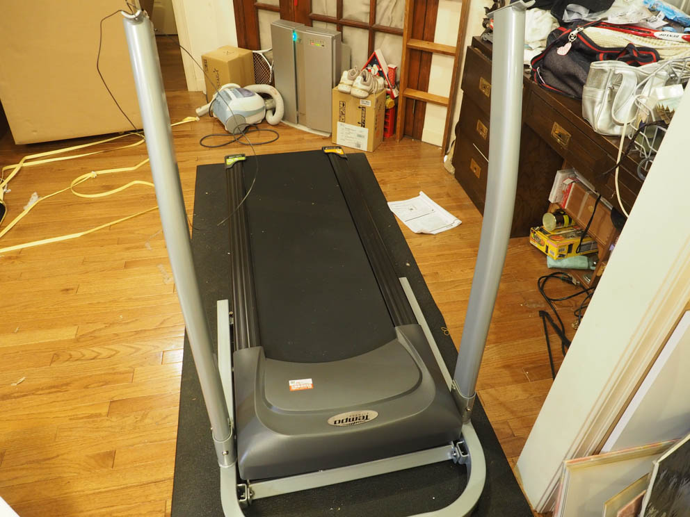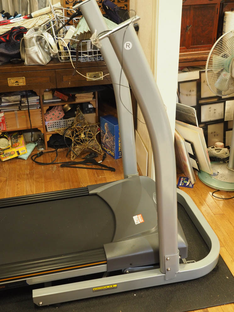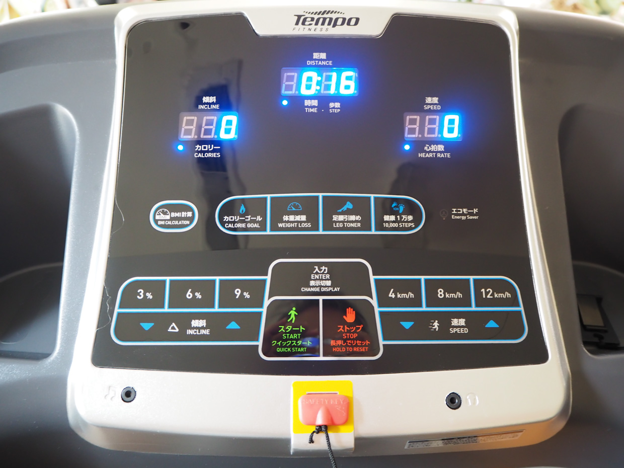さて、上記の難所以外は、問題なく組みあがりました。コンセントを差し込み、スタートボタンを押すと、3,2,1と表示が出て、足元のベルトがゆっくりと動き始めました。私にとっての歩行速度は2km/hぐらいが丁度よくスタスタと歩くことができました。機械の音は驚くほど静かで、スースー とベルトが回っているだけです。ベルトに足を下すときに出る音は仕方ないのですが、これも靴を履かずに使えばたいへん静かなので夜でも使えます。ベルトの速度は最高15km/hまで上げられ、相当なスピードのランニングまで可能です。私はよろけてしまうので5km/h以上は無理かな。歩行面の傾斜角度は0度から10度まで電動で変えられます。傾斜3度の状態で、通常の平らな道を歩く運動量になるそうです。その他、カロリーや歩行数なども計測できるし、自動的にベルトの速度が変化してインターバルでトレーニングのできるモードなどがあって結構楽しめそうです。