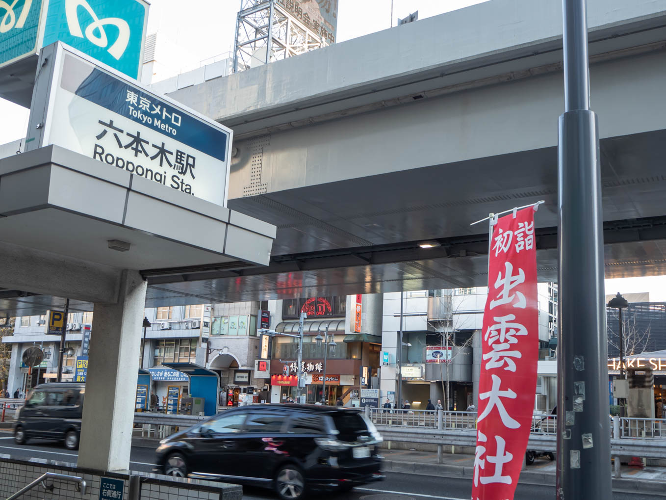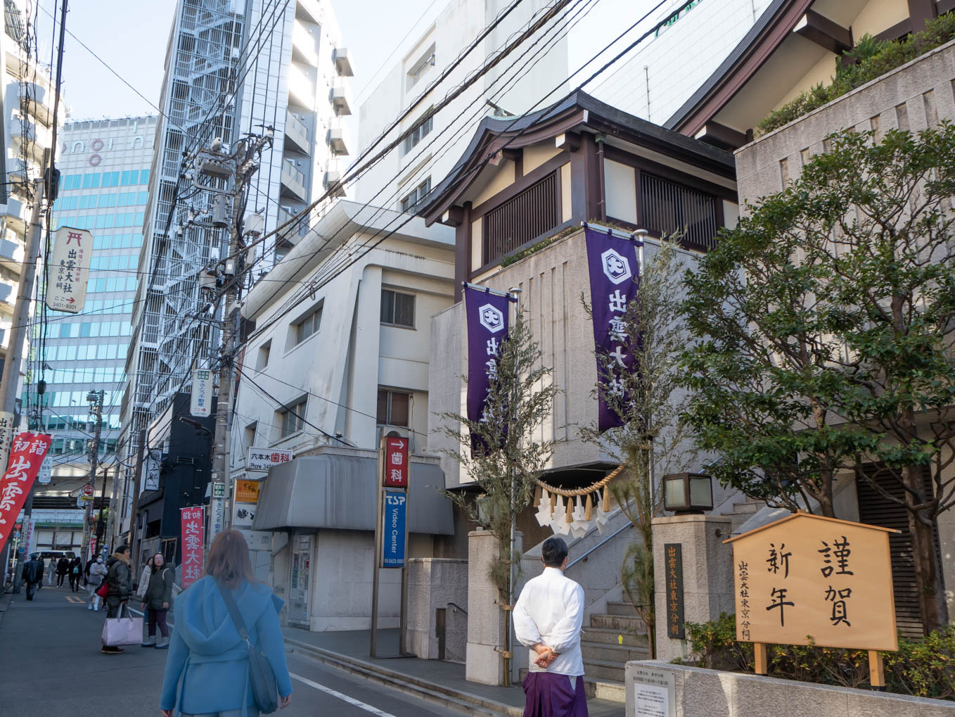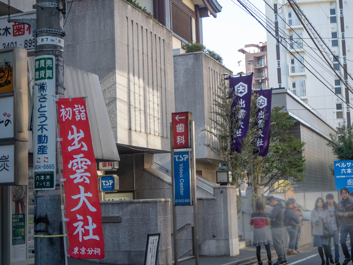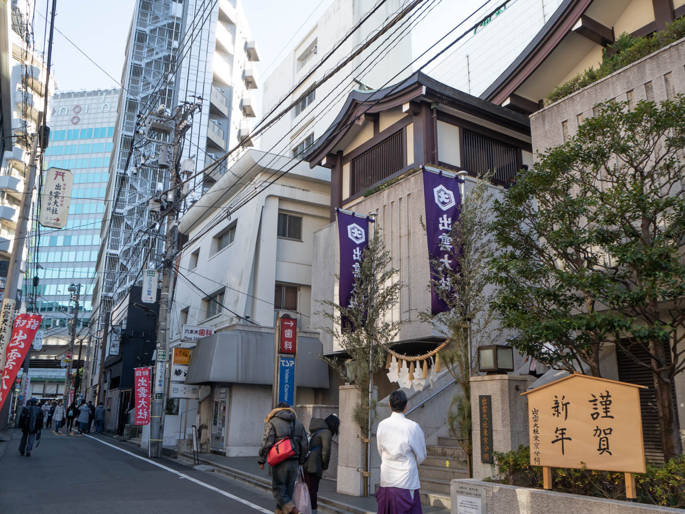 地下鉄日比谷線の六本木駅を高樹町寄りの出口から地上に出ると出雲大社の文字が大きく書かれた赤いのぼりに驚かされます。左手先には六本木ヒルズがそびえ立っています。そのまま100mほど行ったところ、コンビニの手前を右へ曲がればまた赤いのぼりに大きく書かれた出雲大社の文字が目に飛び込んできます。