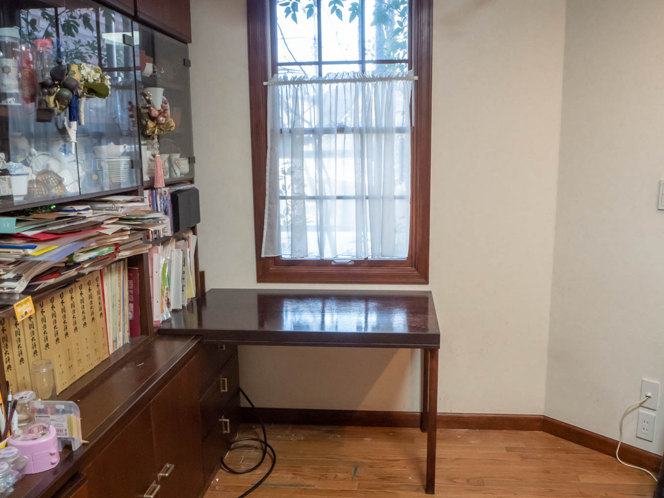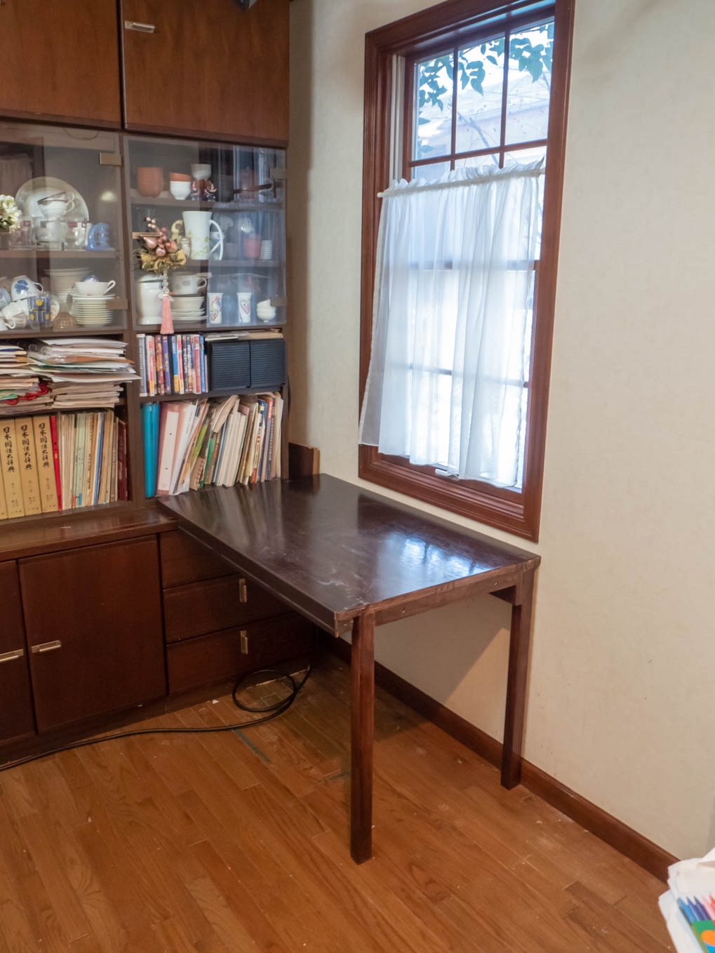 窓にかからない高さでなるべく高いテーブルとします。それによってテーブルの下に移動テーブルや椅子を収納できるからです。収納棚も窓を避けて設置しなければなりません。