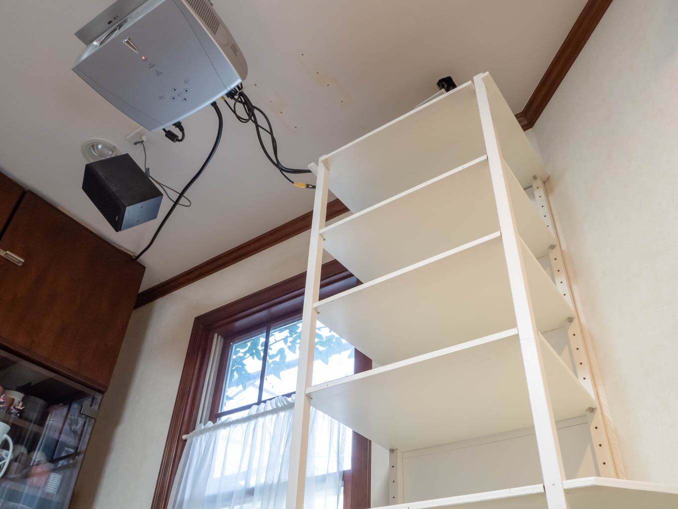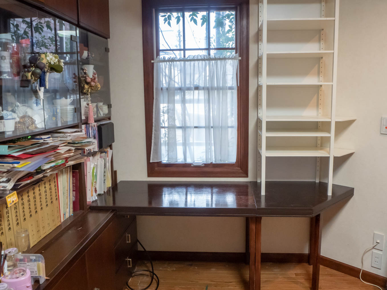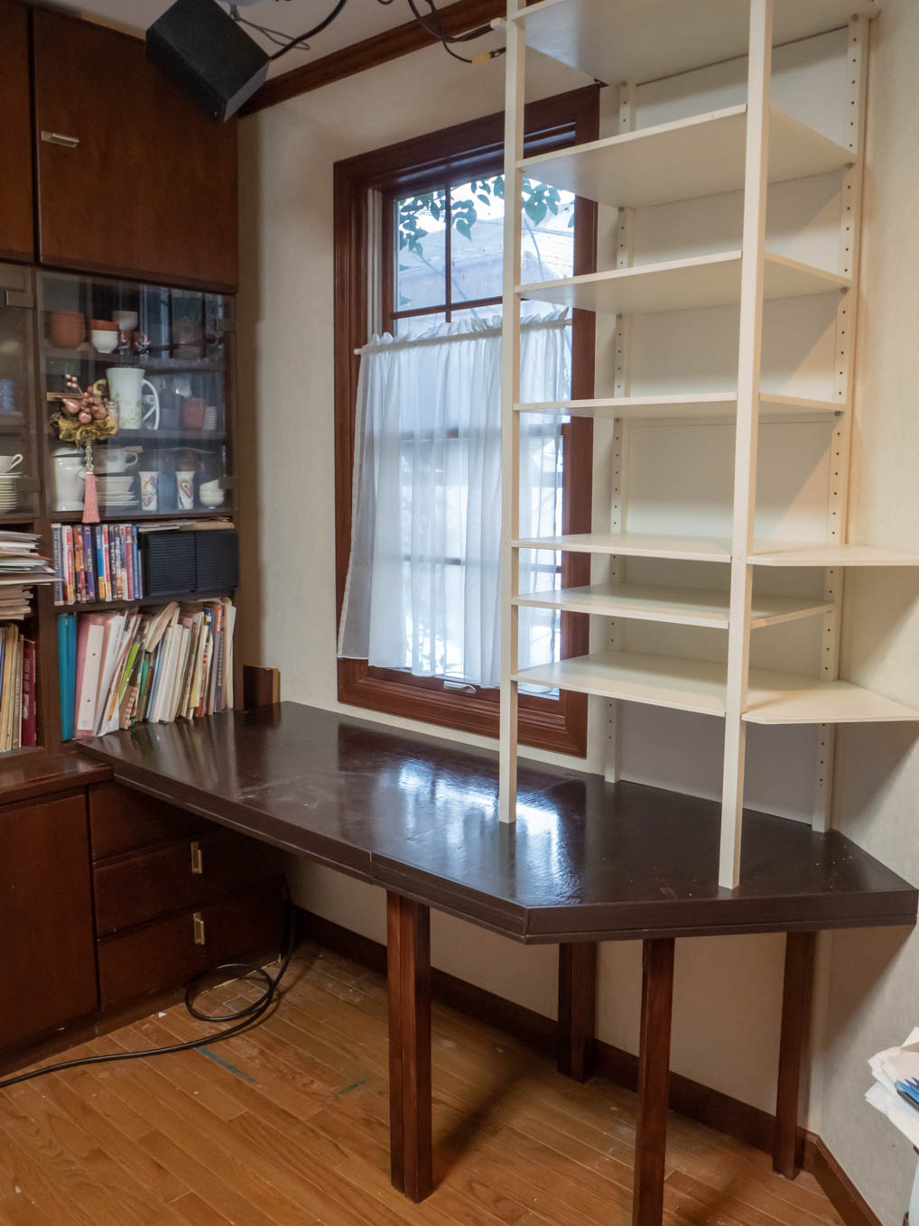 既存の家具(YAMAHA)と直角に、窓際にサイドテーブルを拡張し、その上に天井までの棚を設置することとしました。