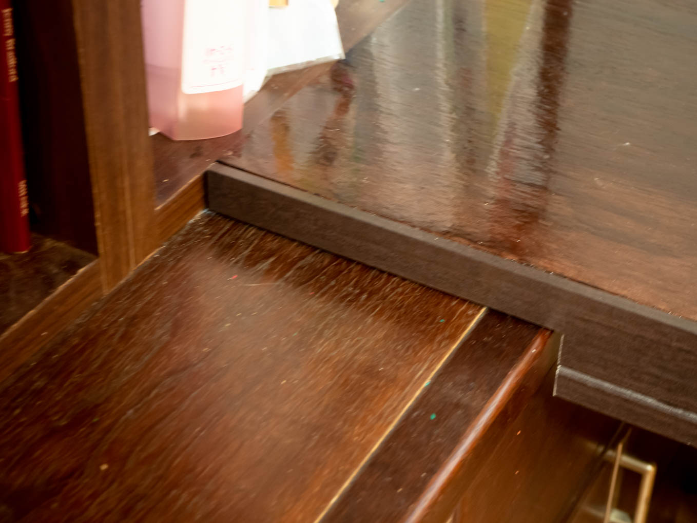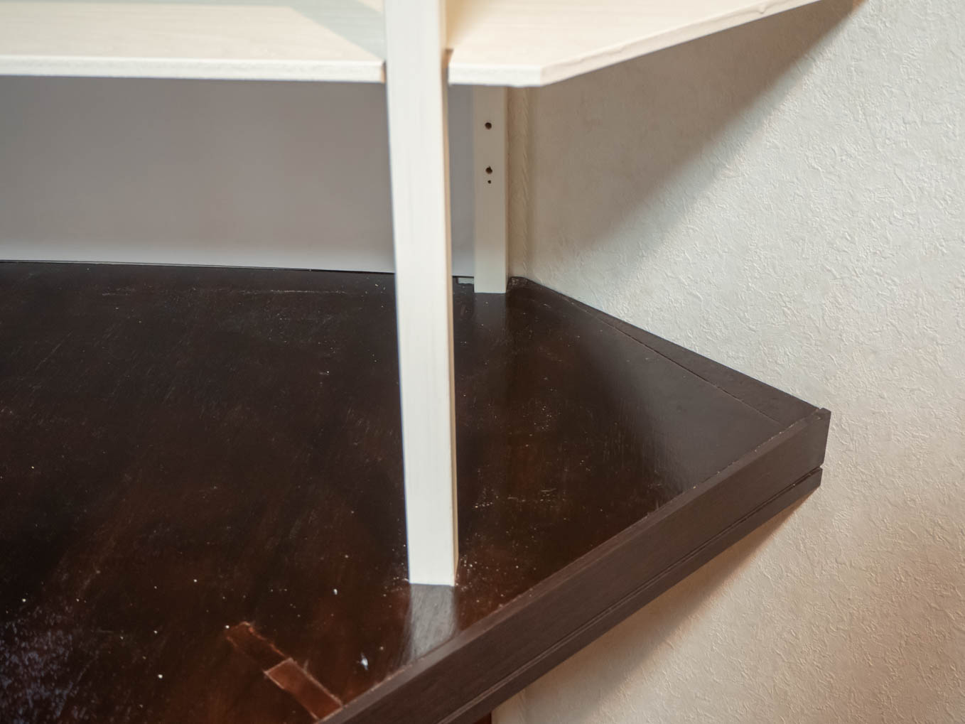 袖テーブルは片袖を既存の家具にしっかり載せています。二つのテーブルは裏側にジョイントを設けてしっかりと繋いでいます。部屋の形が変則的で5角形なので、棚の乗るテーブルの角を部屋の壁に合わせるのに苦労しました。基本的には型紙を取って天板の荒取りをしましたが、最終的には現物合わせでカットを繰り返すこととなりました。
