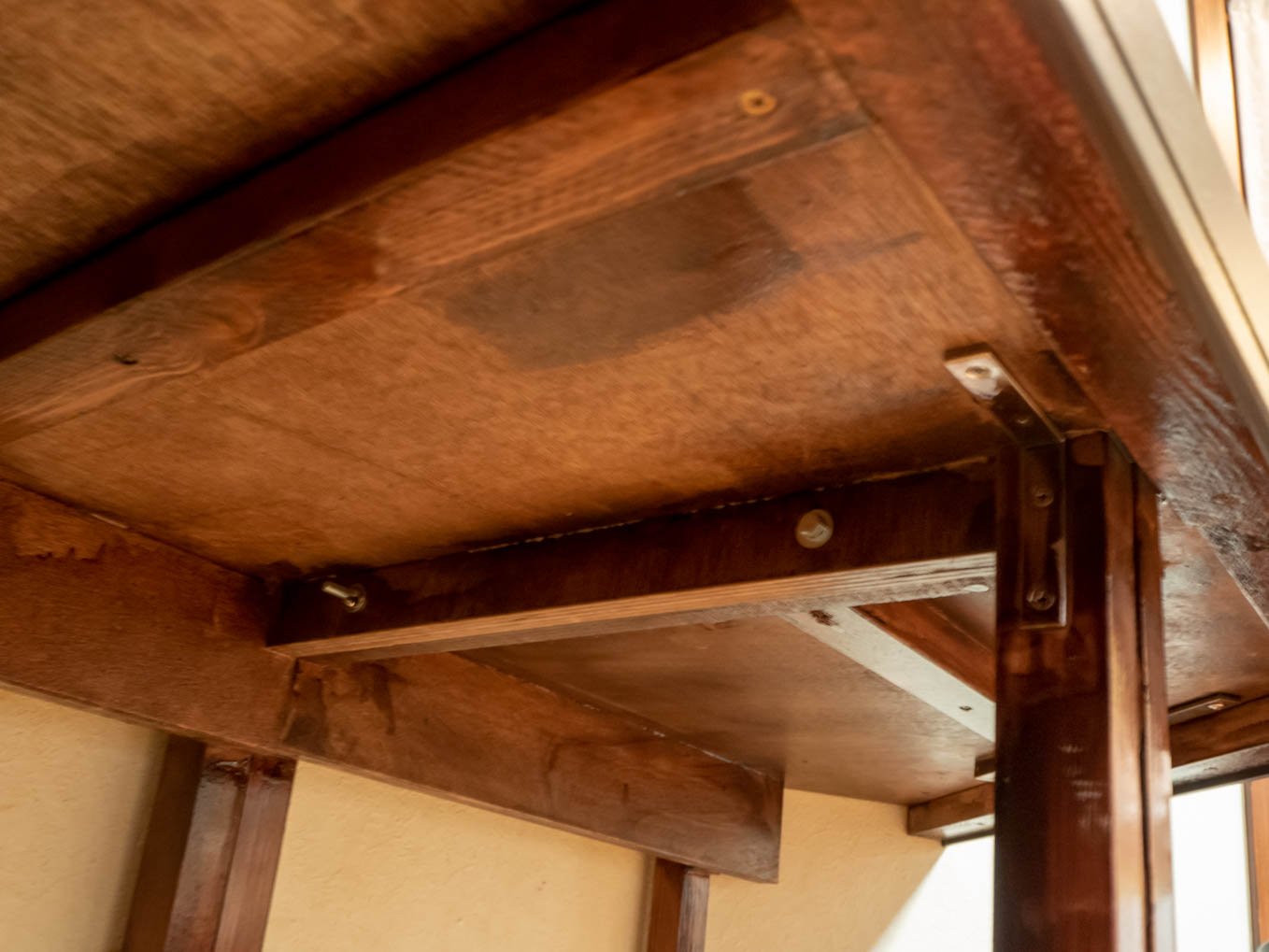 テーブルは袖テーブルの部分と、棚の乗る部分にわけて作りました。テーブルを二つに分けて作った理由は、第一に工房が狭くてこれ以上大きい造作は、作ったはいいのですが出せなくなります。第2の理由は、二つ繋いだテーブル全体の長さが1820mmを超えるので、天板用の合板の購入が面倒になるからです。天板にはコストを考えてラワン合板24mm厚を使い、棚板には14㎜厚のシナ合板を使いました。足は欅の角材をそのまま使っています。テーブルの表面はサンダーで磨いてニスを3回塗ったのでしっかりと艶が出ました。既存の家具に合わせて色味を調節しました。赤みの強いウォールナット系と黒いオーク系のニスを混ぜましたが、オーク系が多すぎて少し色が濃くなりすぎましたがご愛敬です。