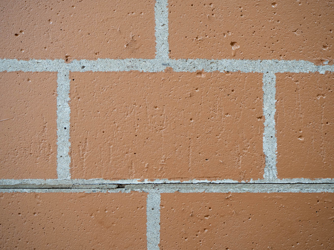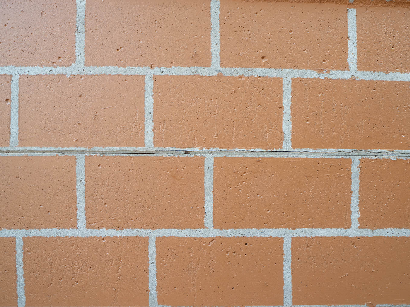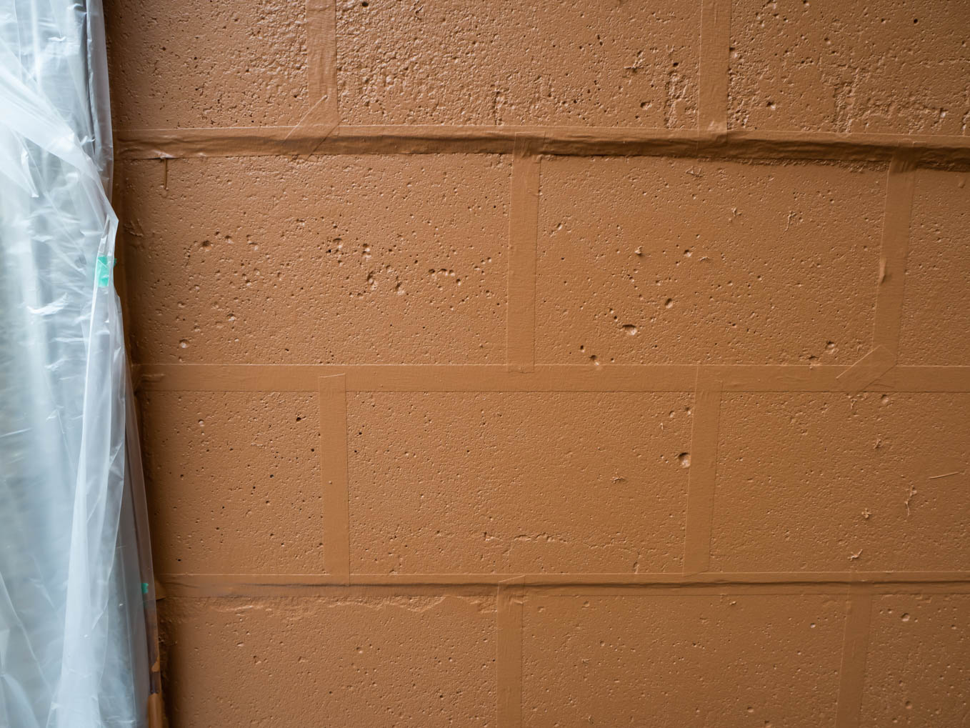 いよいよマスキングテープを剥がす時がきました。ドキドキしながら数センチだけ剥がしてみたら、どうにか目地らしい雰囲気が出てきました。よし、ということで一気に全面剥がしました。近くで見ると目地の見切りも崩れているところも多くありますが、これがかえってブロックの凸凹感を出しているのではないでしょうか。
