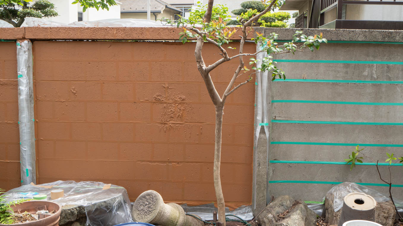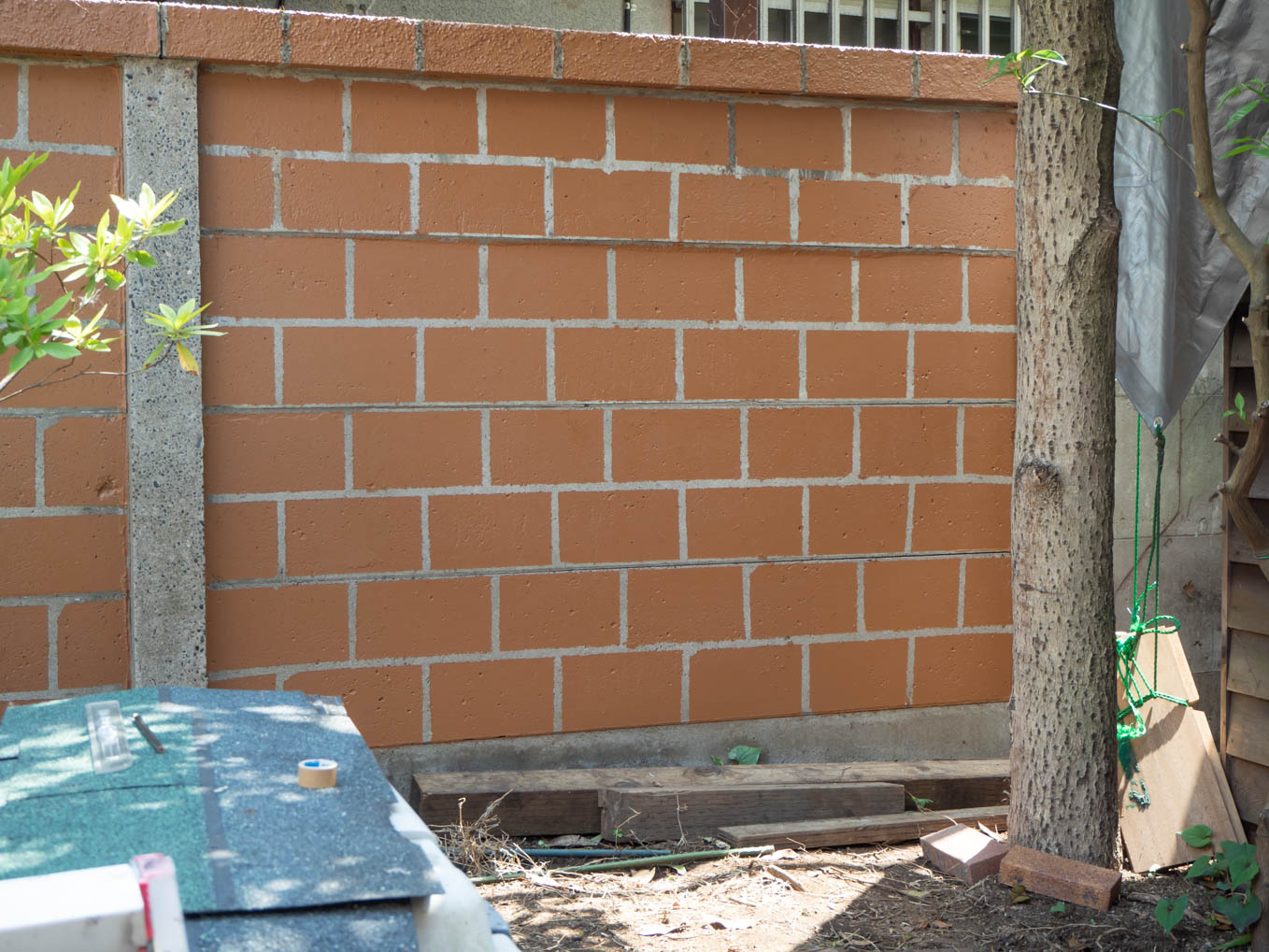出来栄えは下の写真の通りです。左の写真がbefore、中央がマスキングを剥がす前、右がafter ということになりました。庭の雰囲気は一変しました。これから植栽が成長して、緑の葉や花がレンガ模様の壁を少しずつ覆っていくのを楽しみにしています。