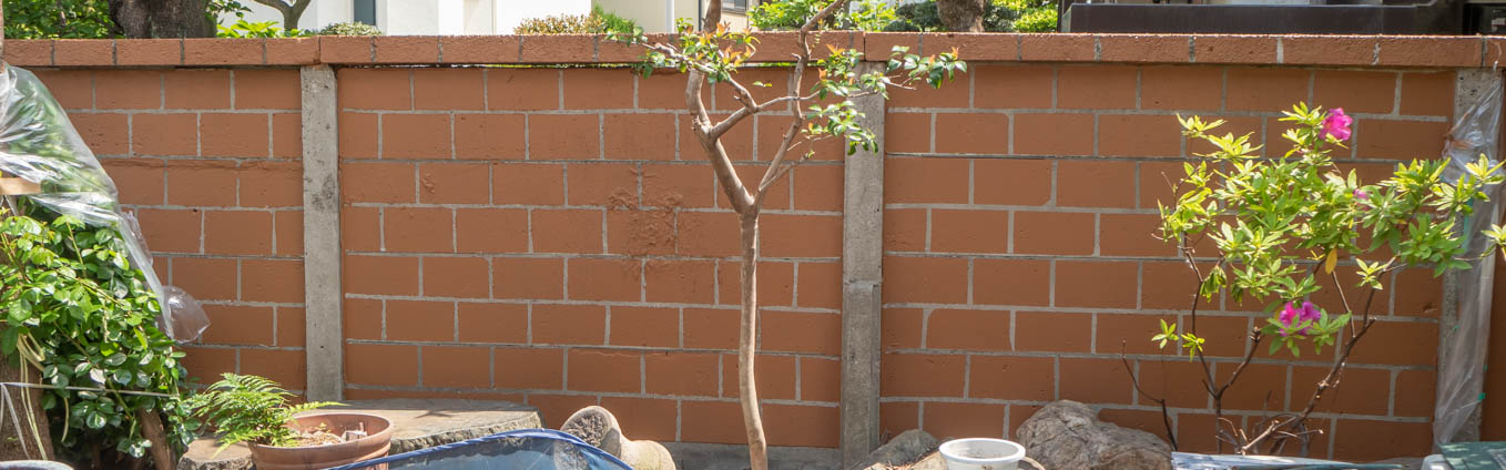 薄汚れてそっ気のない万年塀を隠すために、ガーデニング用のラティスを張っていたのですが、十年以上ほったらかしていたらボロボロに朽ちてしまい塀よりもみっともなくなっていました。朽ちたラティスを片づけたらやっぱりなんだか雰囲気がさみしいので、どうしようかと悩んでいたら、妻がネットで面白い記事を見つけてきました。コンクリートの塀を、レンガで積み上げたような模様に塗り上げるという記事ですが、レンガの目地のところをマスキングテープで隠すことで、一気に塗り上げてしまうというDIY向けのアイディアです。早速、これを真似してみることにしました。