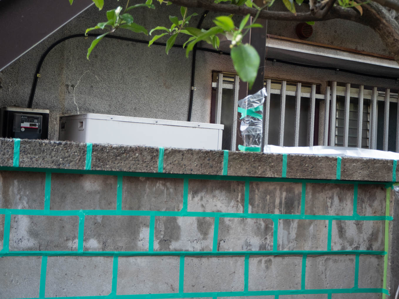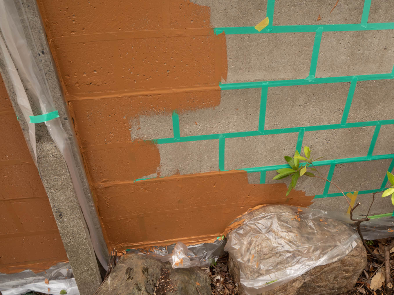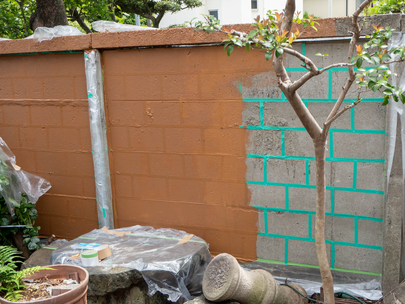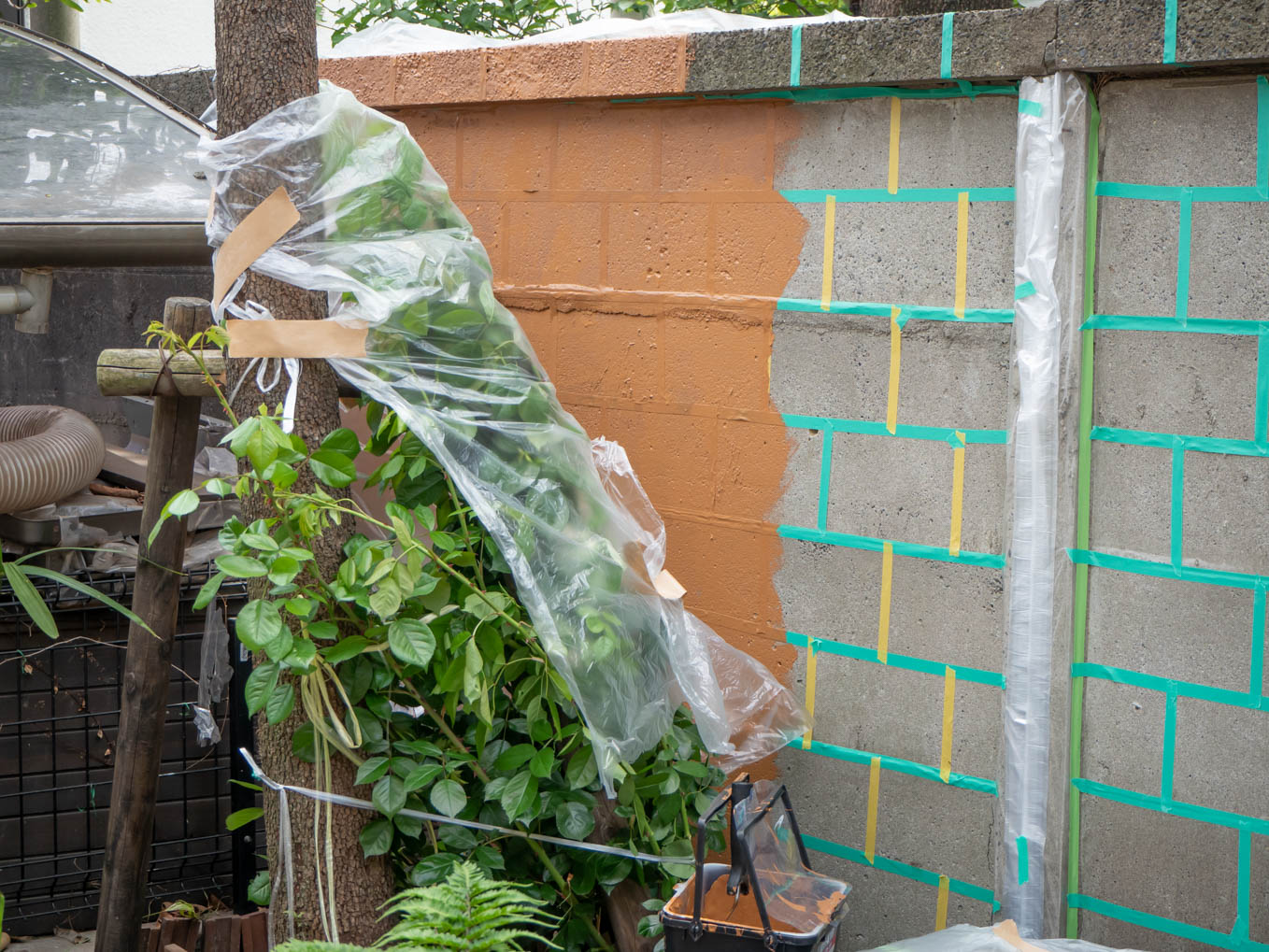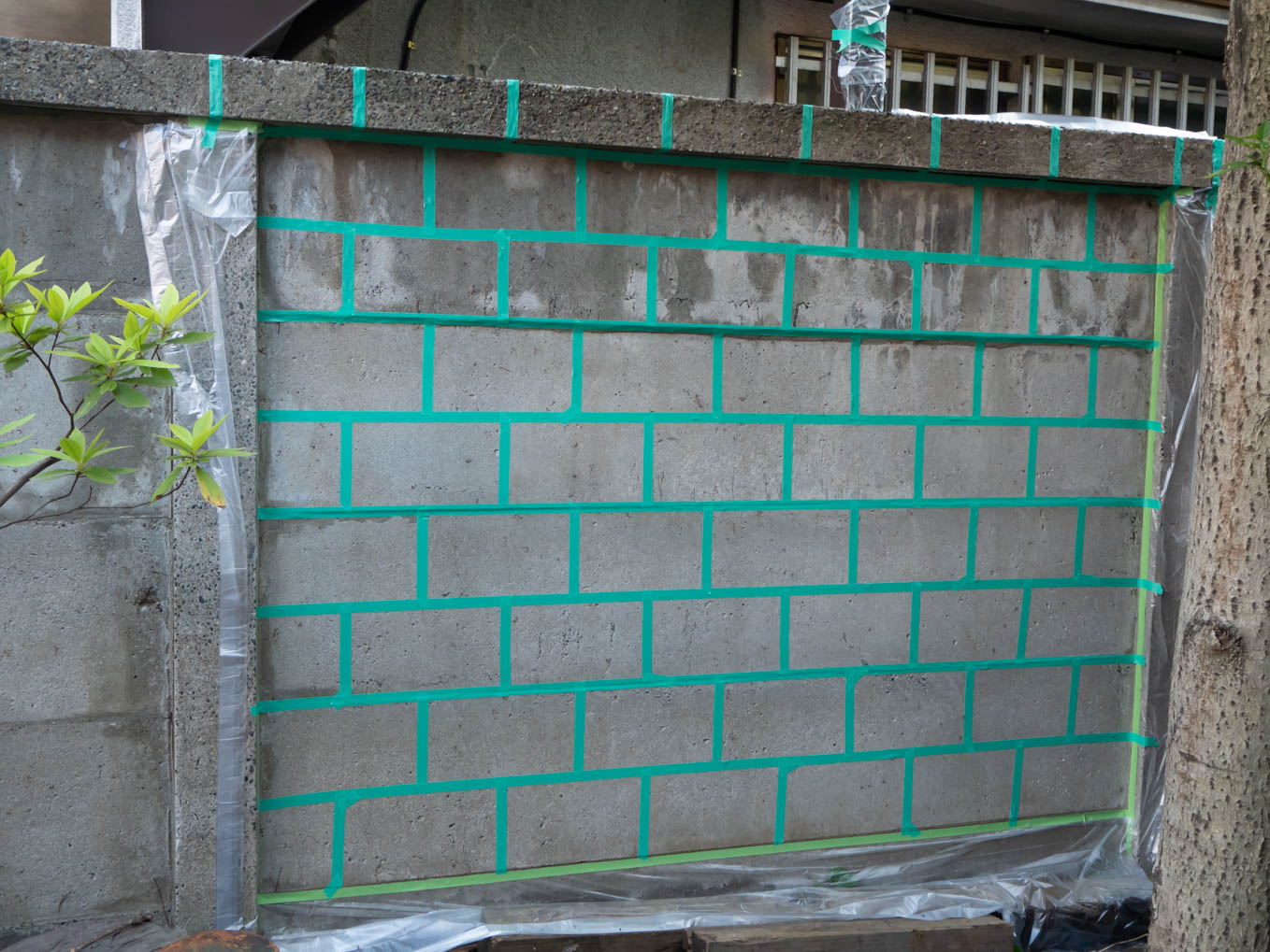 目地のラインを作るためのマスキングテープは、粗面用のものがホームセンタで手に入りました。普段使っている木工用のテープでは荒い壁面との間に隙間ができたり剥がれやすくてだめでした。マスキングテープを水平(横)は一直線に貼り、垂直(縦)はブロックが交互に積み重なったようにするためにブロックの幅の半分ずつずらして貼ります。これが結構めんどうな作業でしたが、横は私、縦は妻の分担で「ターテの糸はあなたー、ヨーコの糸はわたしー、」なんて中島みゆきの歌を心の中で口ずさみながら貼り終えました。目地以外のところや近くの植木も不用意にペンキで汚してしまわないように適当に養生をしました。
