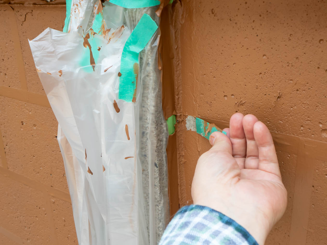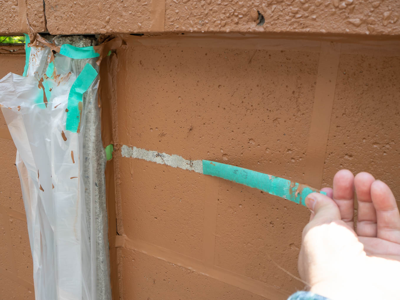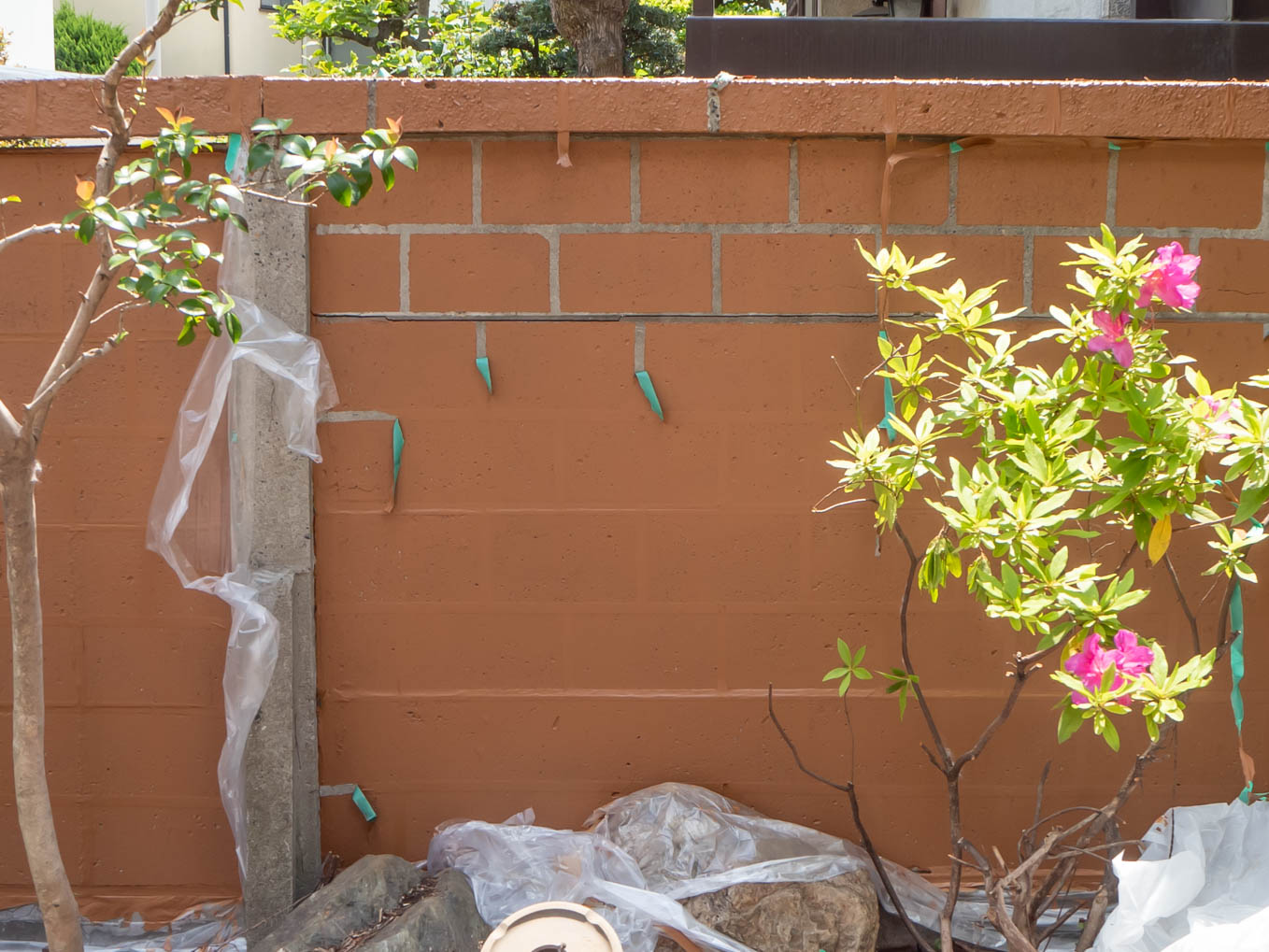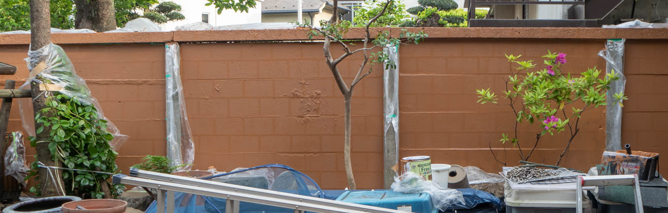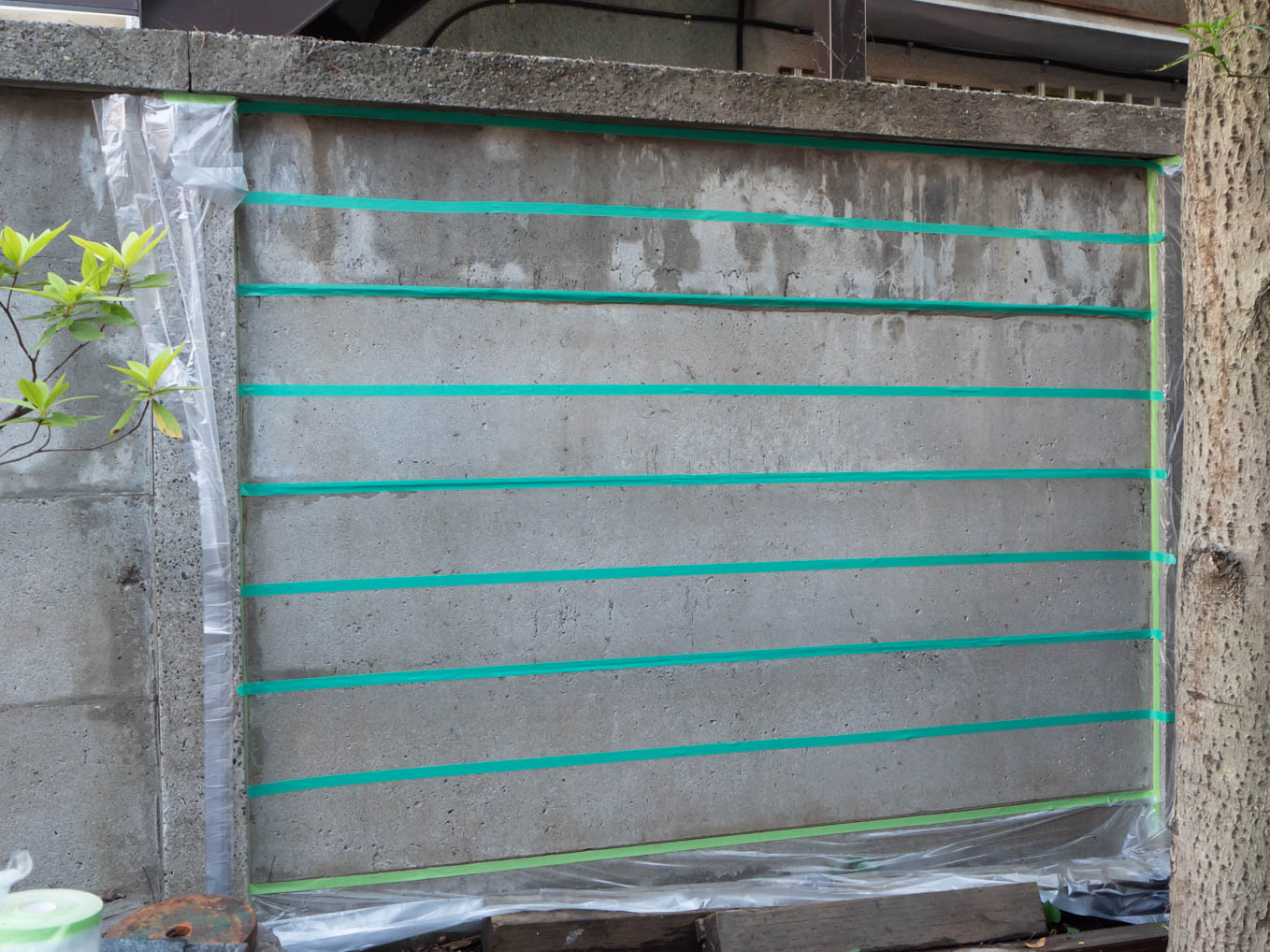 目地のラインを作るためのマスキングテープは、粗面用のものがホームセンタで手に入りました。普段使っている木工用のテープでは荒い壁面との間に隙間ができたり剥がれやすくてだめでした。マスキングテープを水平(横)は一直線に貼り、垂直(縦)はブロックが交互に積み重なったようにするためにブロックの幅の半分ずつずらして貼ります。これが結構めんどうな作業でしたが、横は私、縦は妻の分担で「ターテの糸はあなたー、ヨーコの糸はわたしー、」なんて中島みゆきの歌を心の中で口ずさみながら貼り終えました。目地以外のところや近くの植木も不用意にペンキで汚してしまわないように適当に養生をしました。