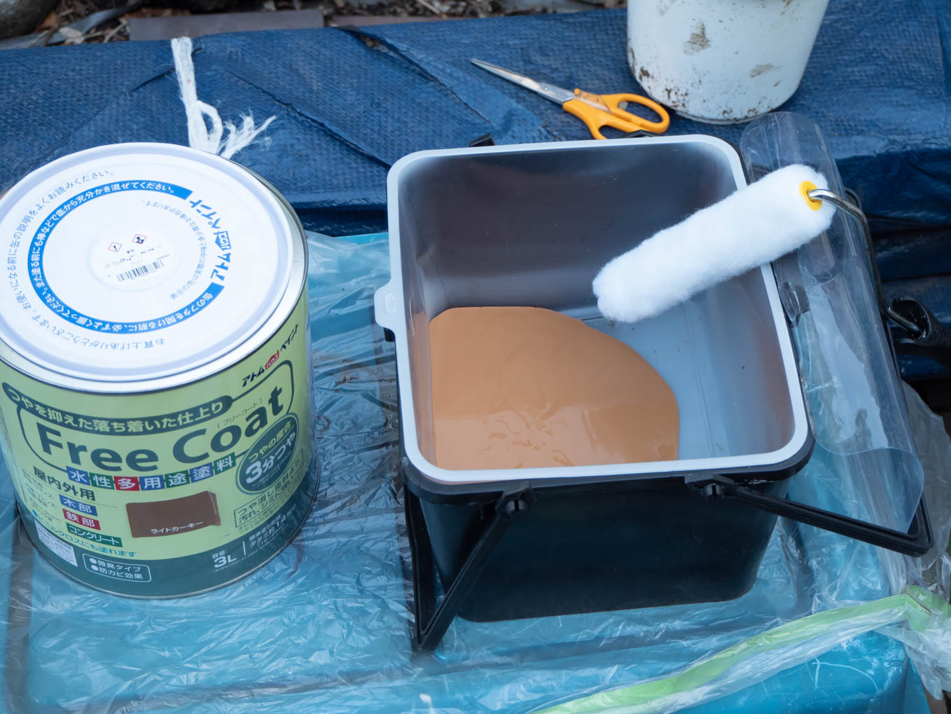 さて、問題は上塗りの色です。妻と近くのホームセンターに何度も通い、塗料の缶を眺めながら悩みました。また、レンガ模様の壁紙や色紙を実際に万年塀に貼りつけて、すこし離れて眺めた時のイメージを確認しました。その結果、候補を、ライトカーキーとブラウン(ちゃいろ)に絞りました。確信を持って“これだ”というわけではないのですが、すこし明るい雰囲気がよいかなぁということになって、とりあえず、ライトカーキーにしました。アトムペイントのFree Coat(水性多用途塗料)です。