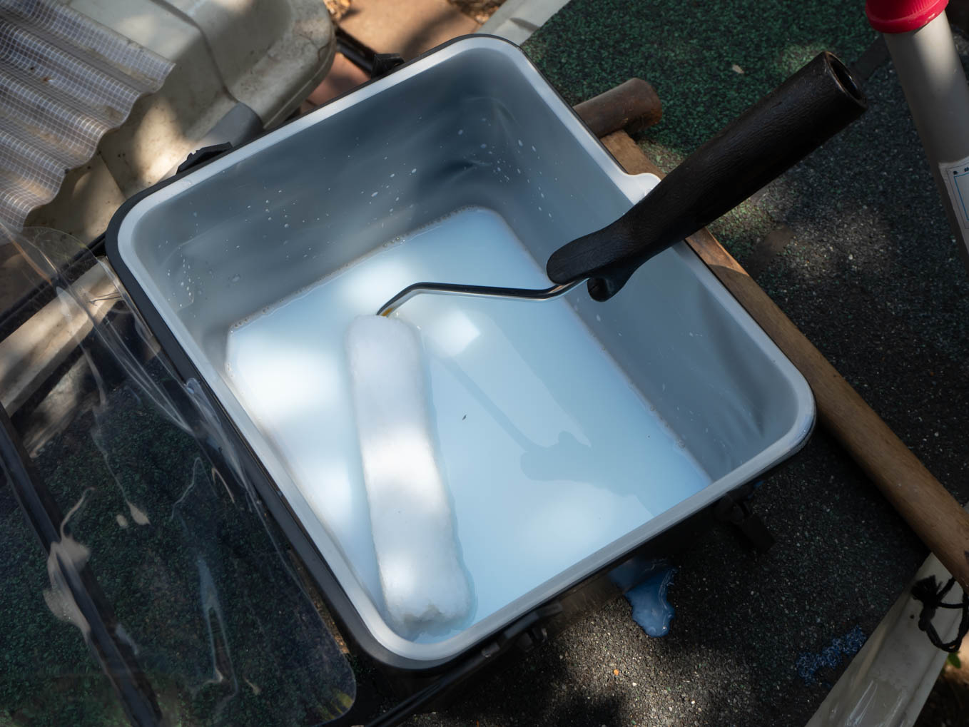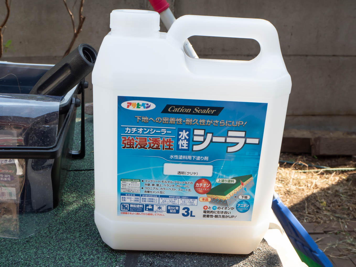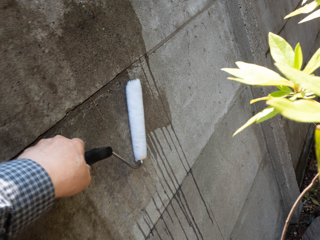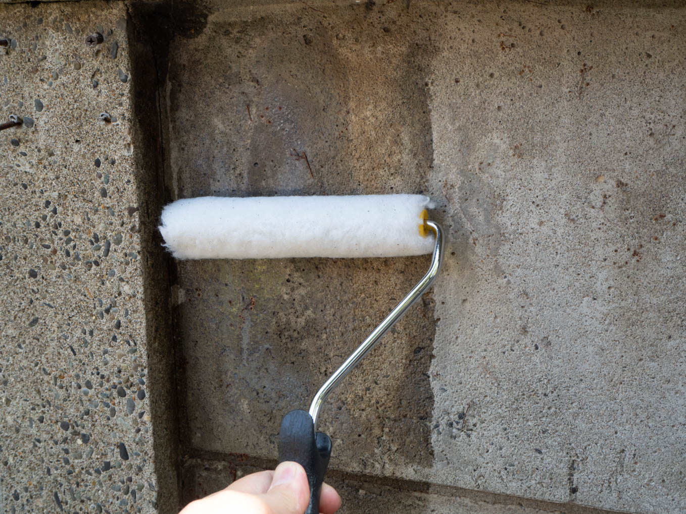 まず、シーラーによる下塗りです。これは既に2週間ほど前に塗り終えていました。シーラーは上塗り塗料の密着性を高めるための接着剤としての機能を持っているそうです。またコンクリートやブロックの表面が塗料を吸い込み過ぎて仕上がりにむらができるのも防げるそうです。色は透明なので、写真のように塗った後も乾いてしまえば外壁の雰囲気は何も変わりません。