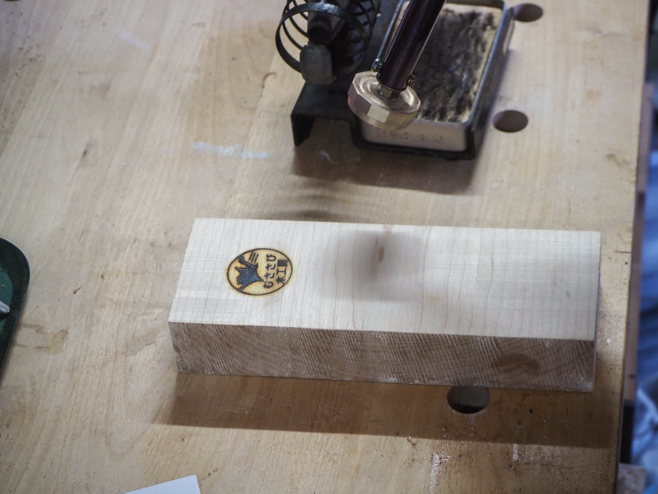 原画のファイルをメールで送ったところ、多少のアドバイスはありましたが、ほぼそのままでOKとなり、制作していただきました。発注して5日ほどで出来上がってきました。原画をメールで送ればよいので便利ですね。今回は最初なので電気ごて(80W)も一緒に注文しましたが、次回からは焼き印のみの制作で済むということです。
