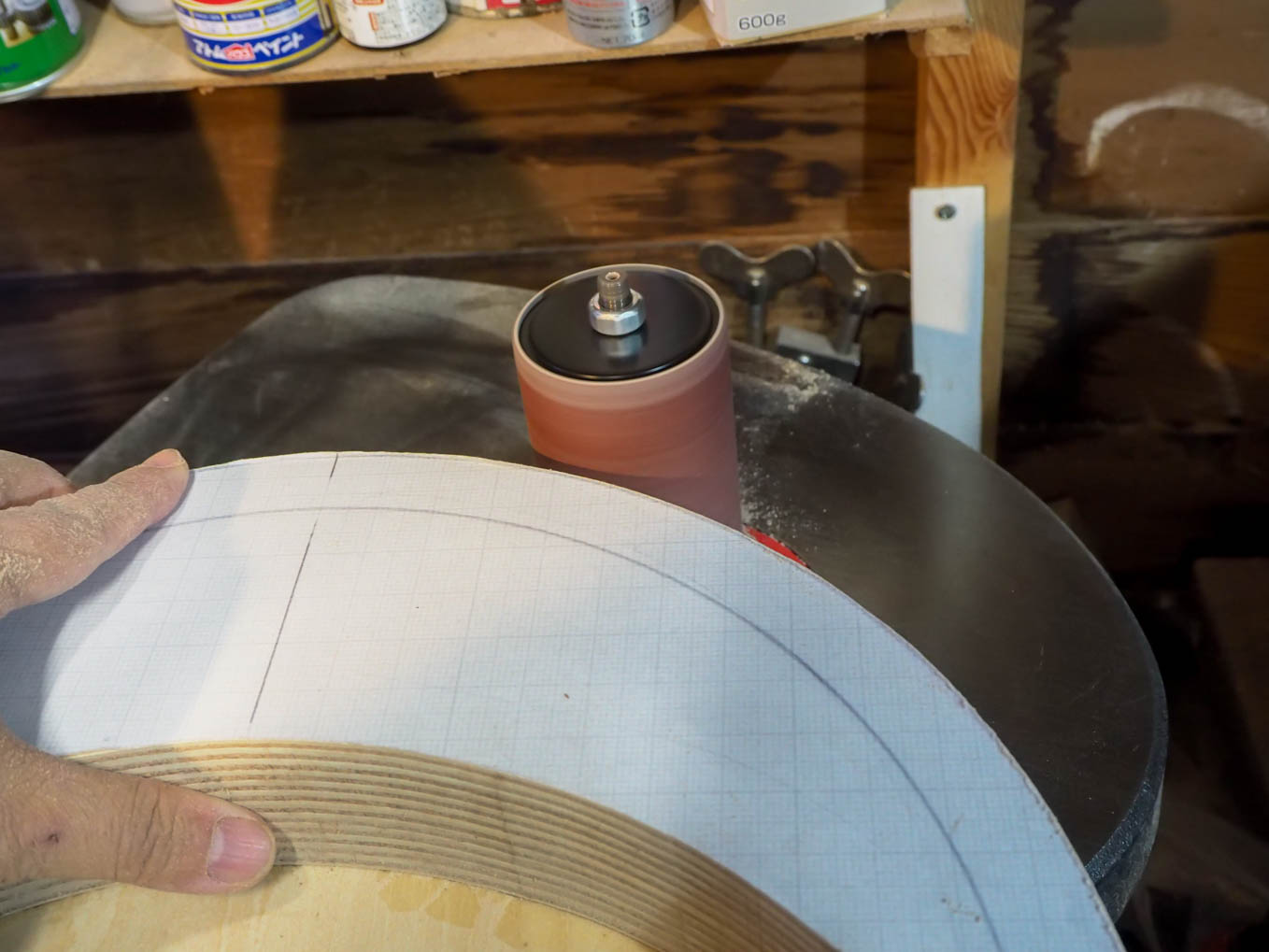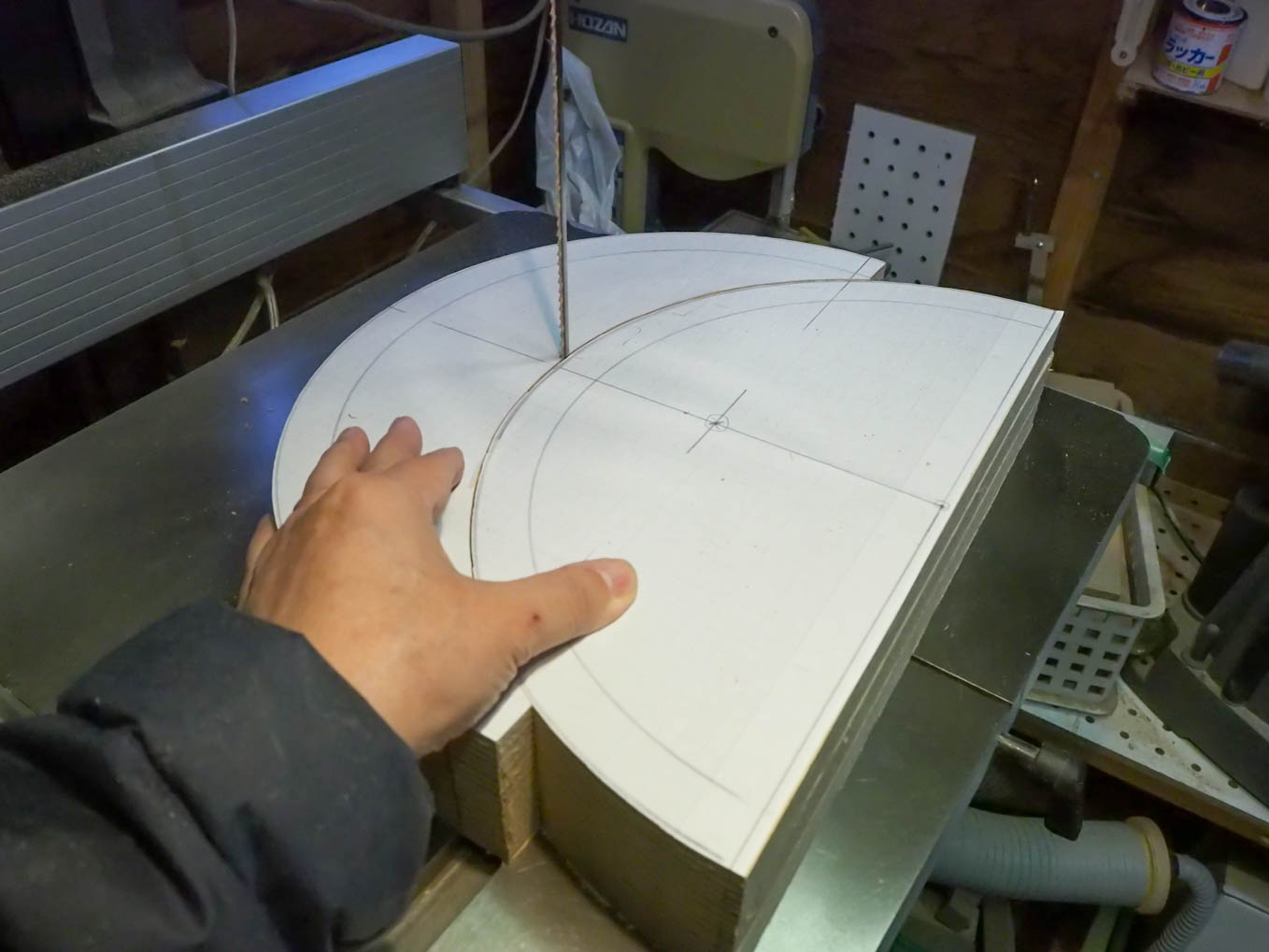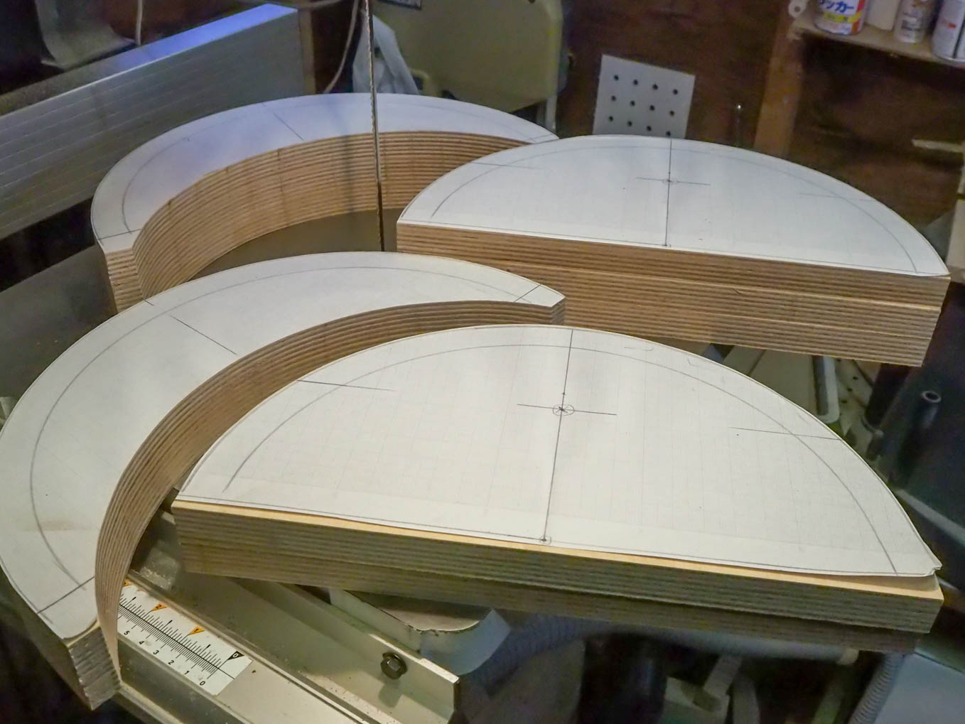 チューニングのバーニアダイヤルを中央に配置して年代感出すことにしました。天板の直径と側板の高さが決まったら、実寸大の型紙を作り、それを使って、手持ちの600×900の材から最も経済的に切り出す手順を探しました。