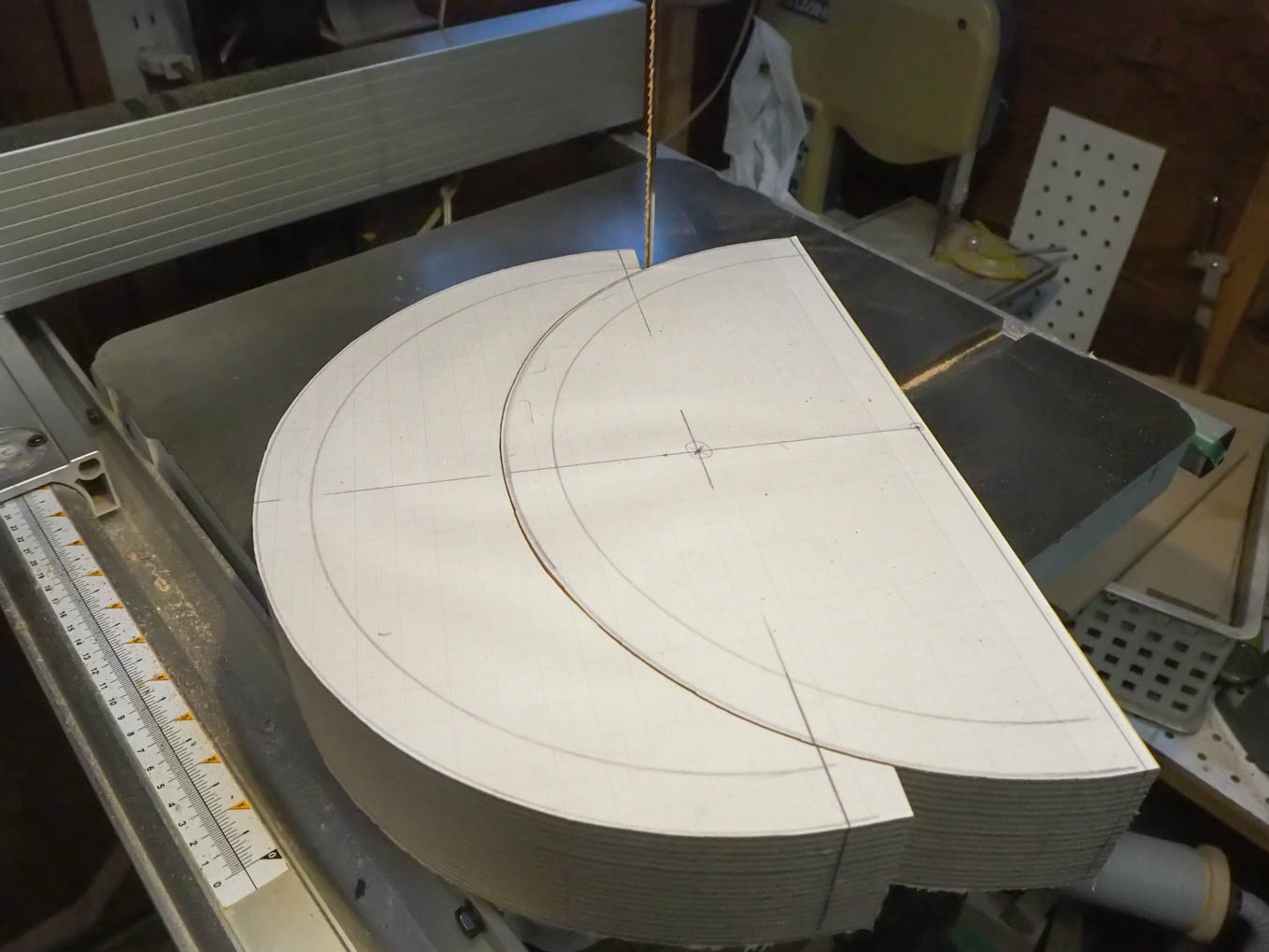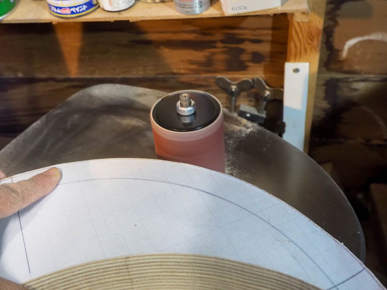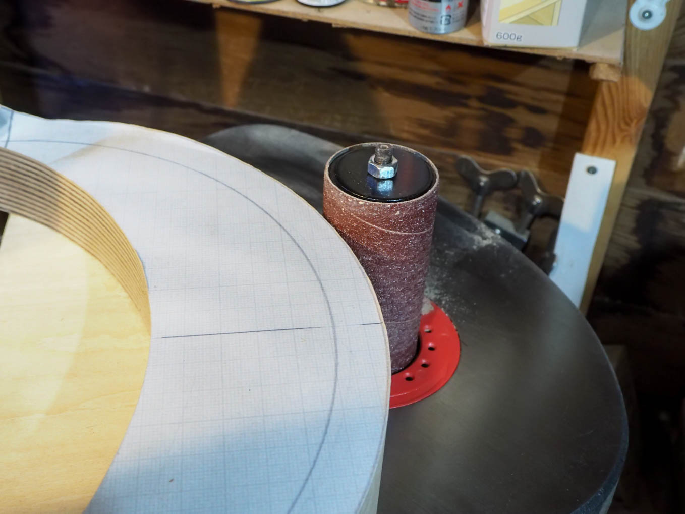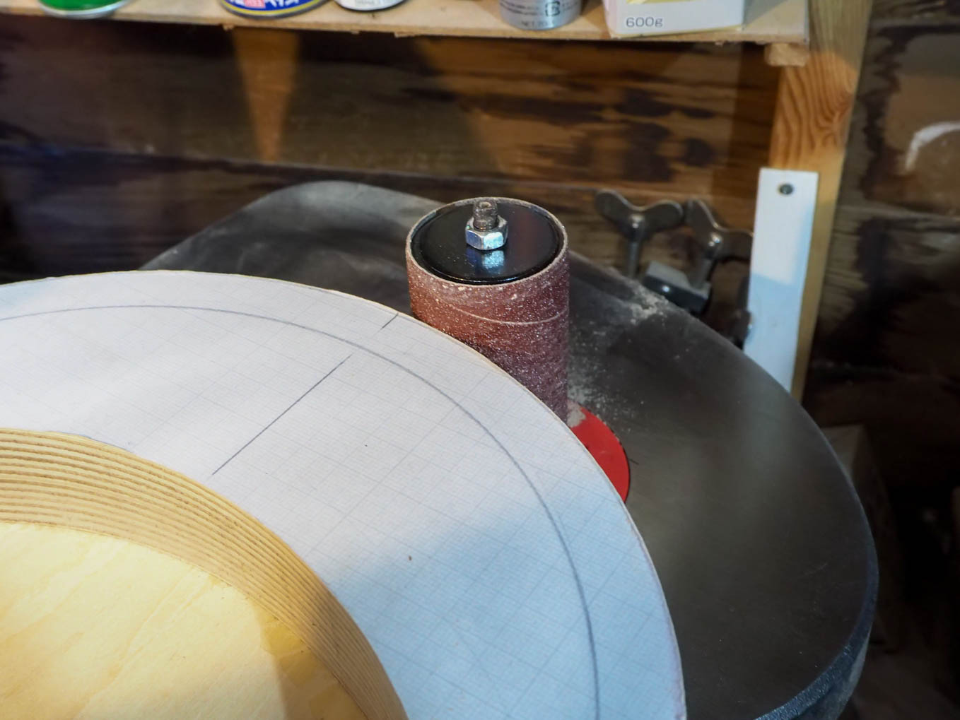 チューニングのバーニアダイヤルを中央に配置して年代感出すことにしました。天板の直径と側板の高さが決まったら、実寸大の型紙を作り、それを使って、手持ちの600×900の材から最も経済的に切り出す手順を探しました。
