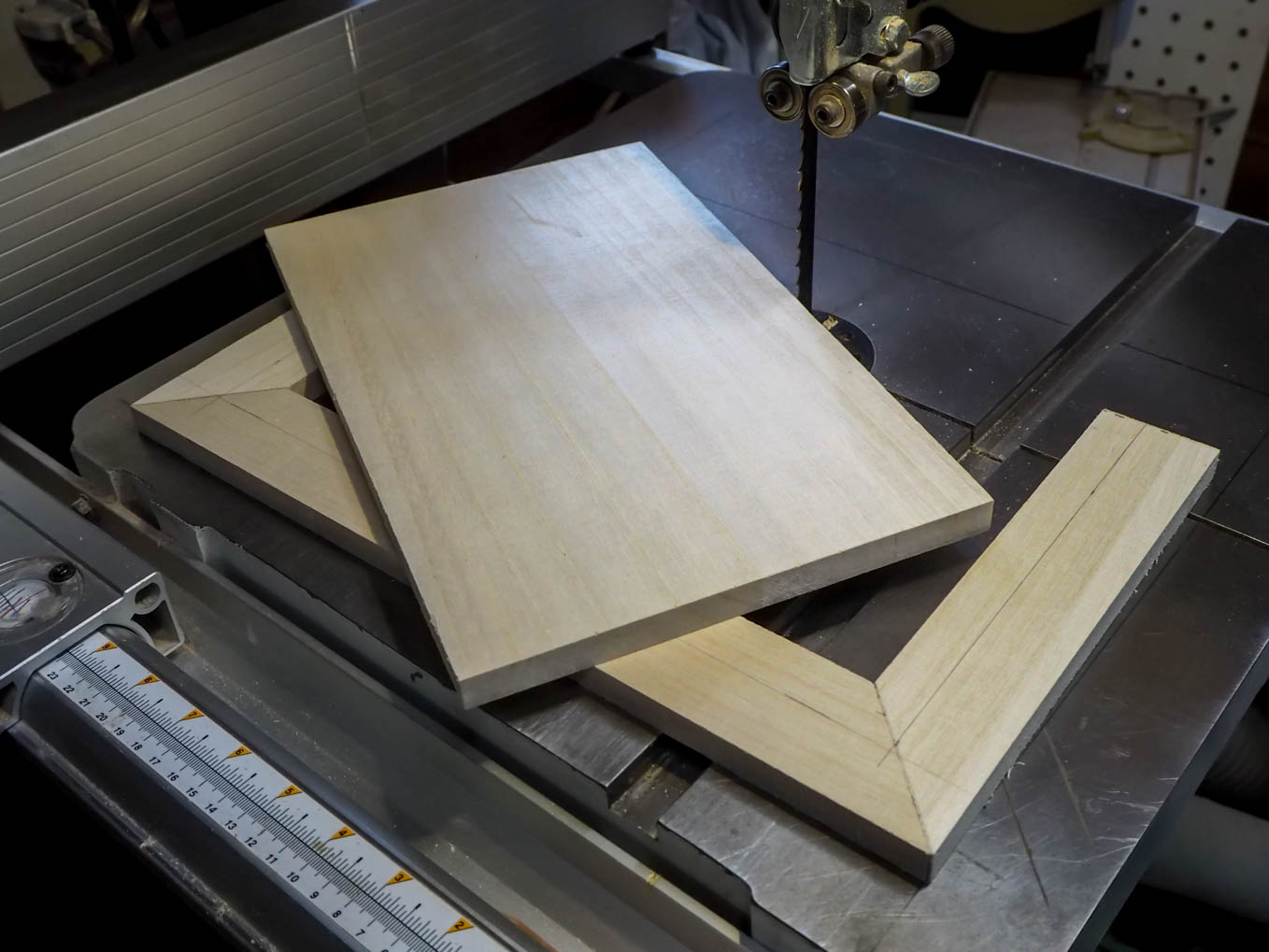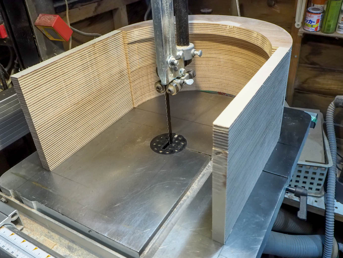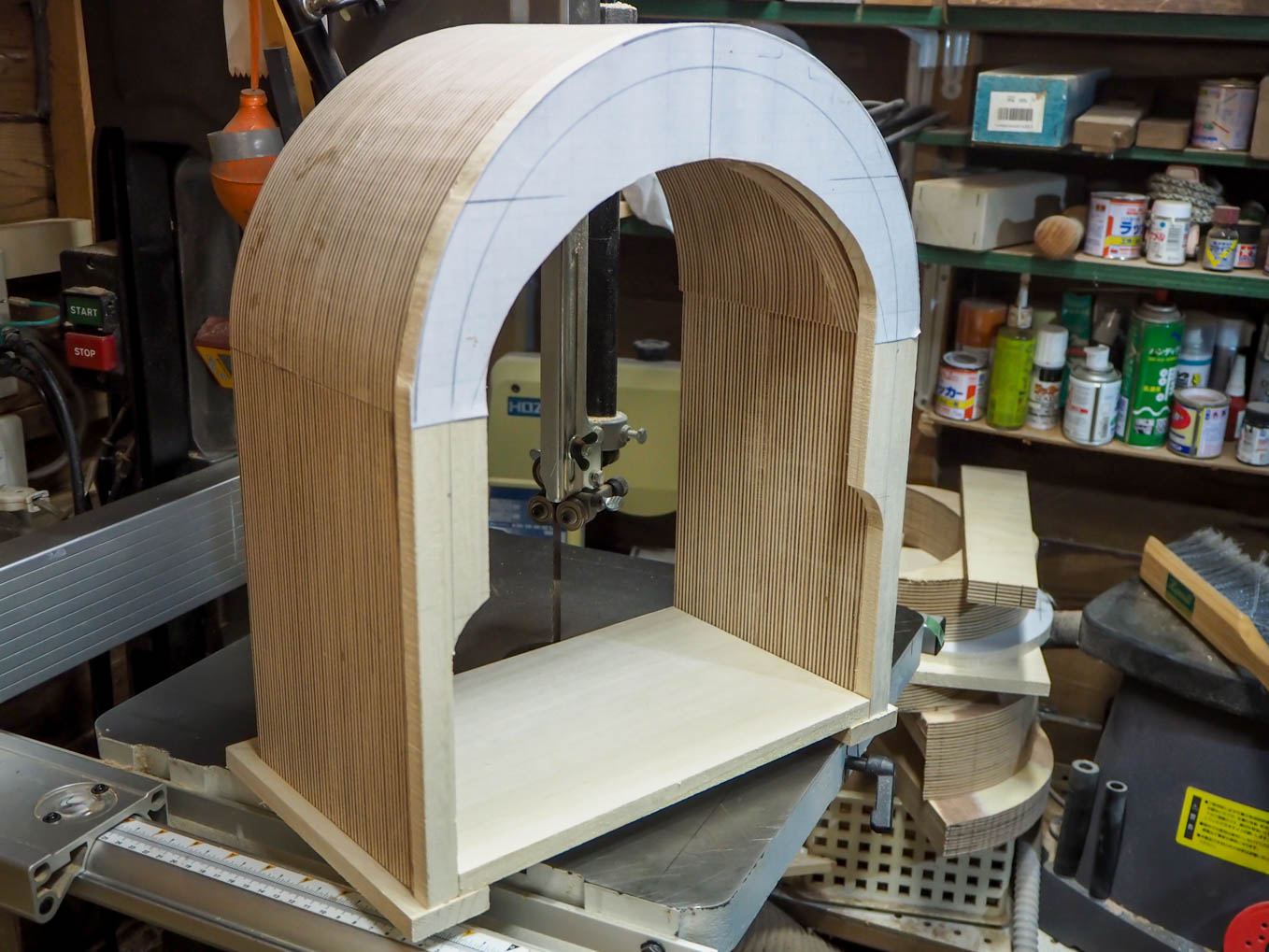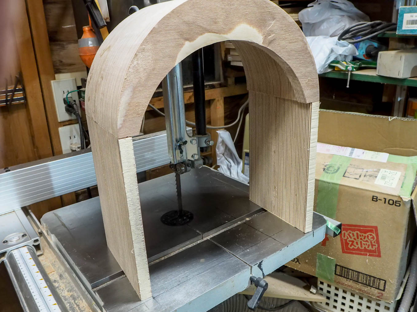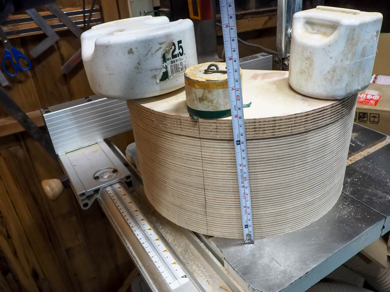 ラジオの奥行きは大よそ200mmなので21mm厚の合板を10枚重ねる必要があります。直接200mm前後の厚さから私のバンドソーで切り出すのは無理だったので3つに分割して切り出して接合することにしました。