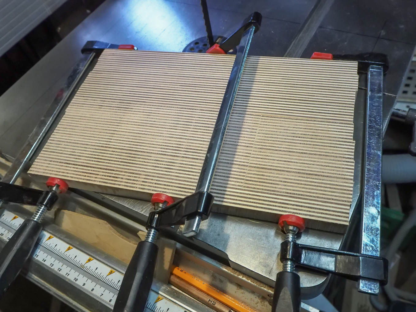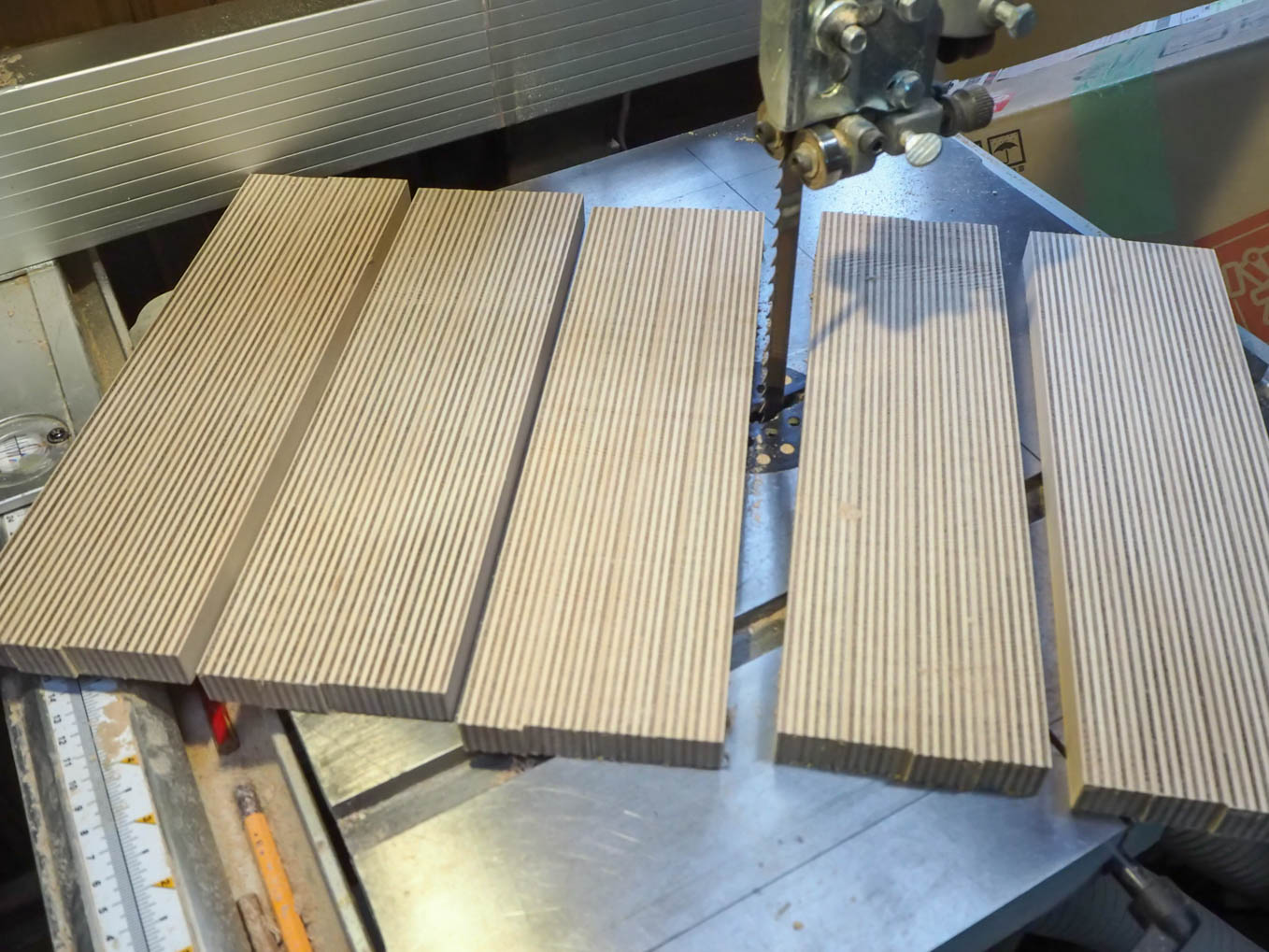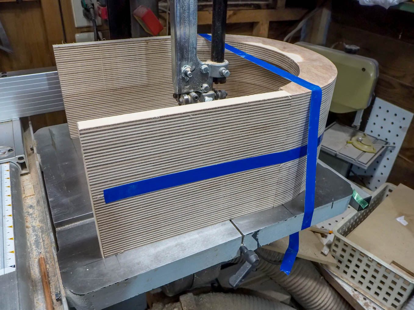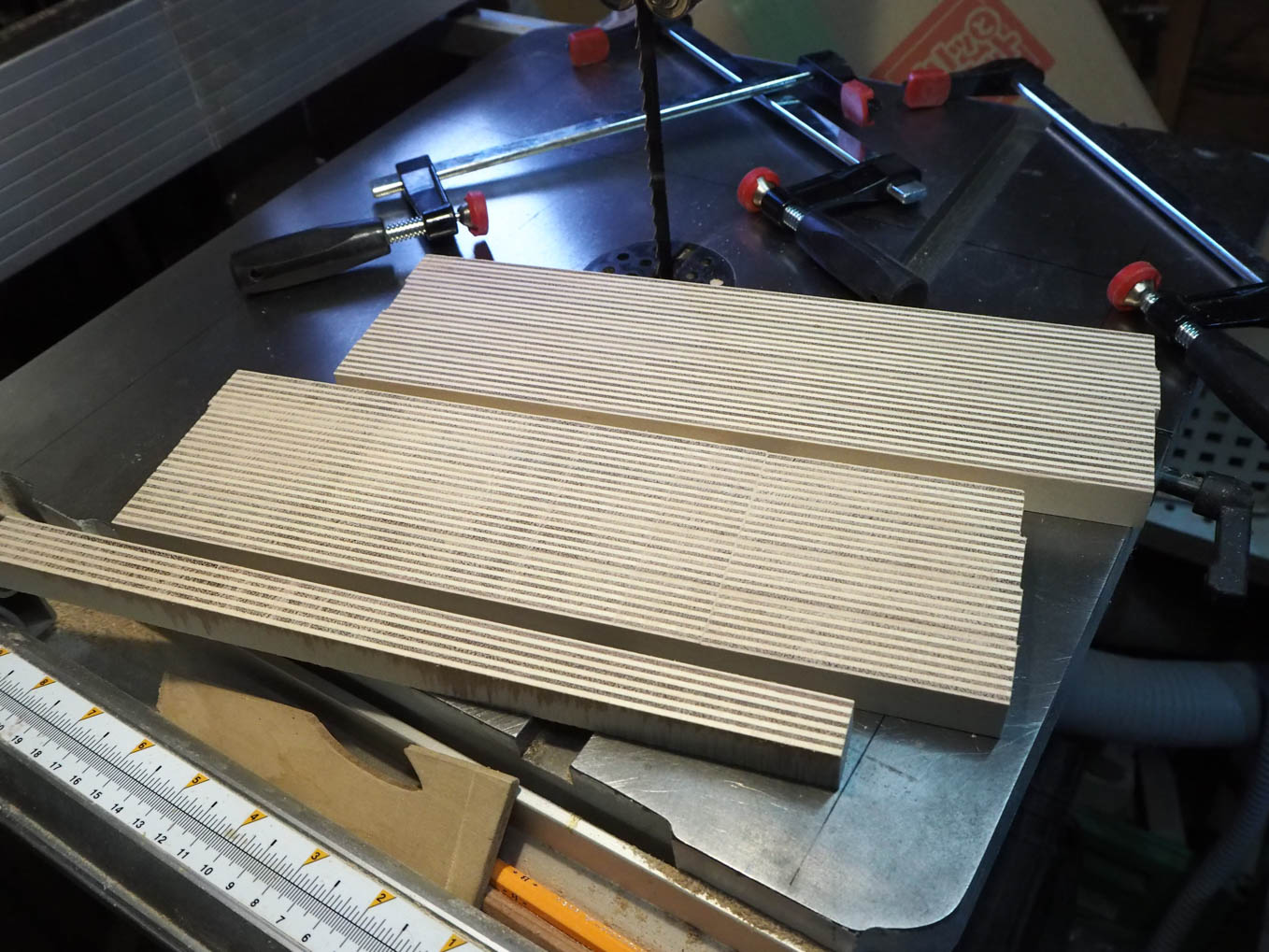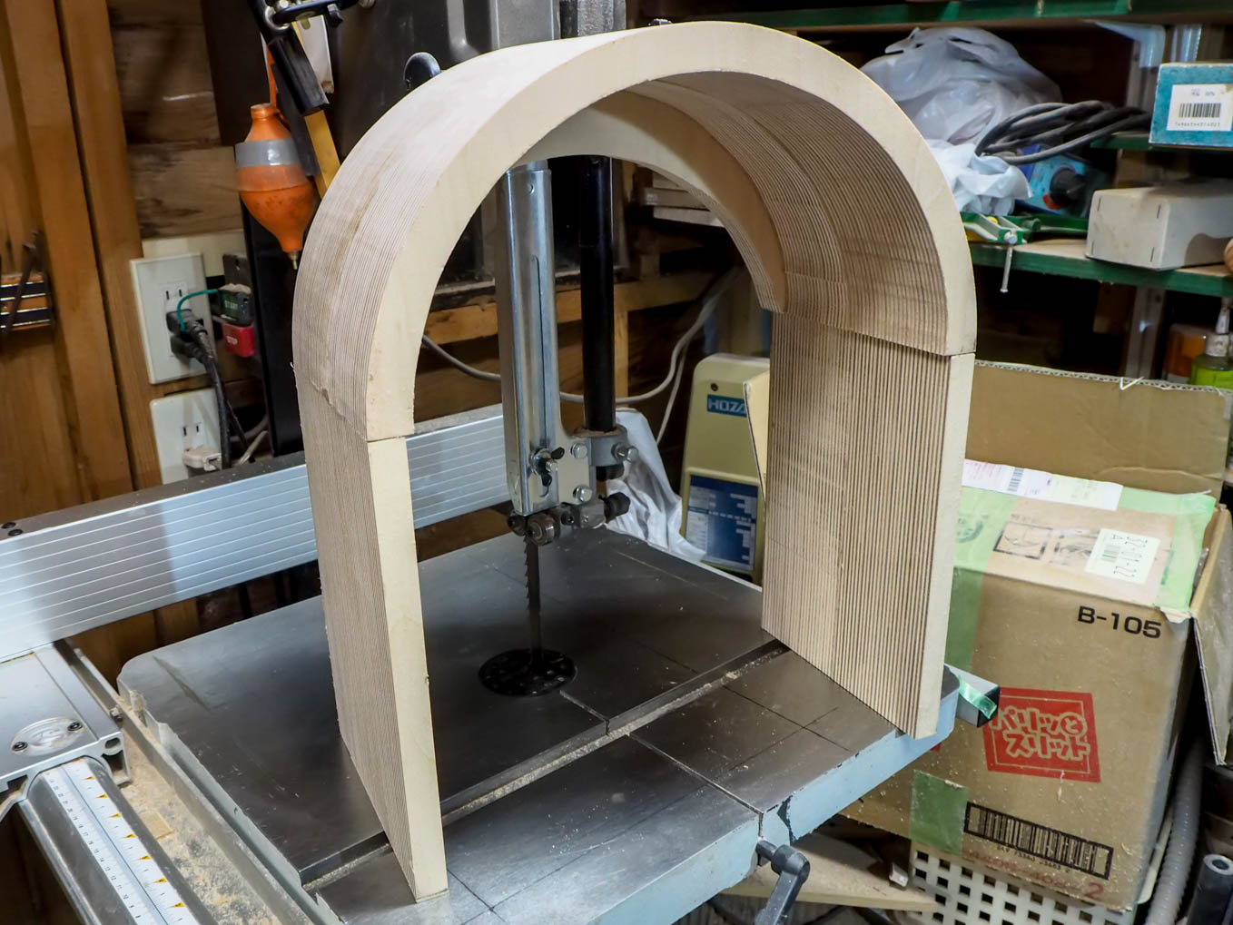 ラジオの奥行きは大よそ200mmなので21mm厚の合板を10枚重ねる必要があります。直接200mm前後の厚さから私のバンドソーで切り出すのは無理だったので3つに分割して切り出して接合することにしました。