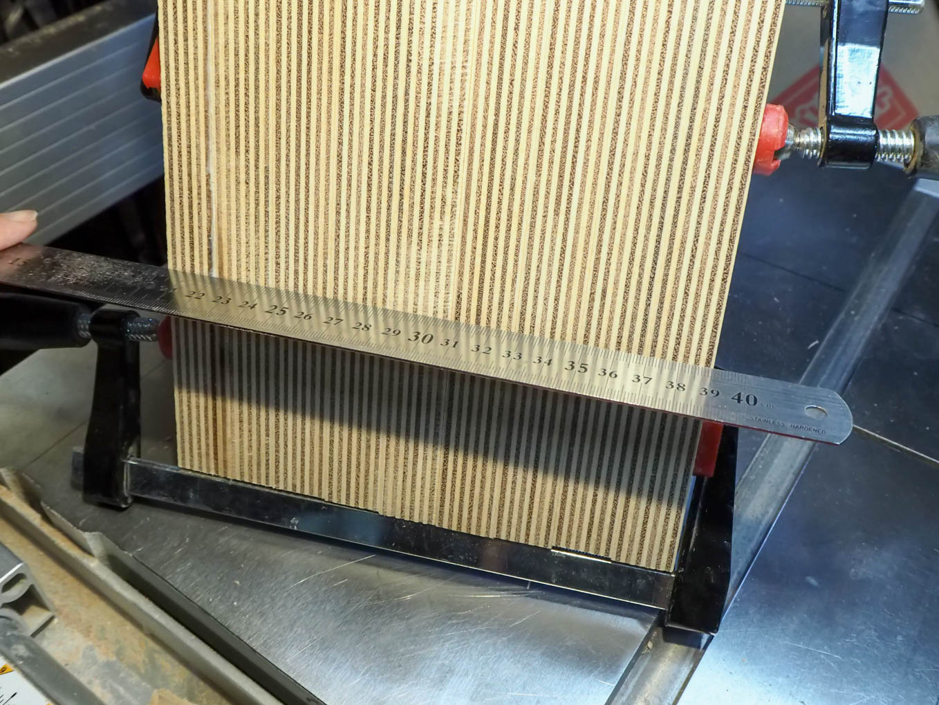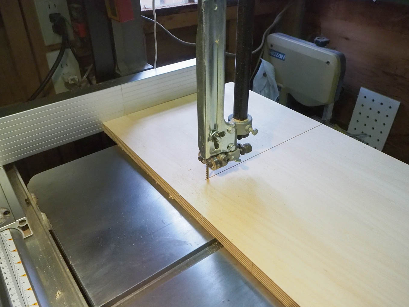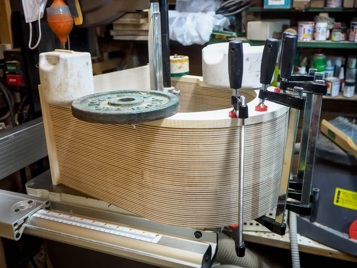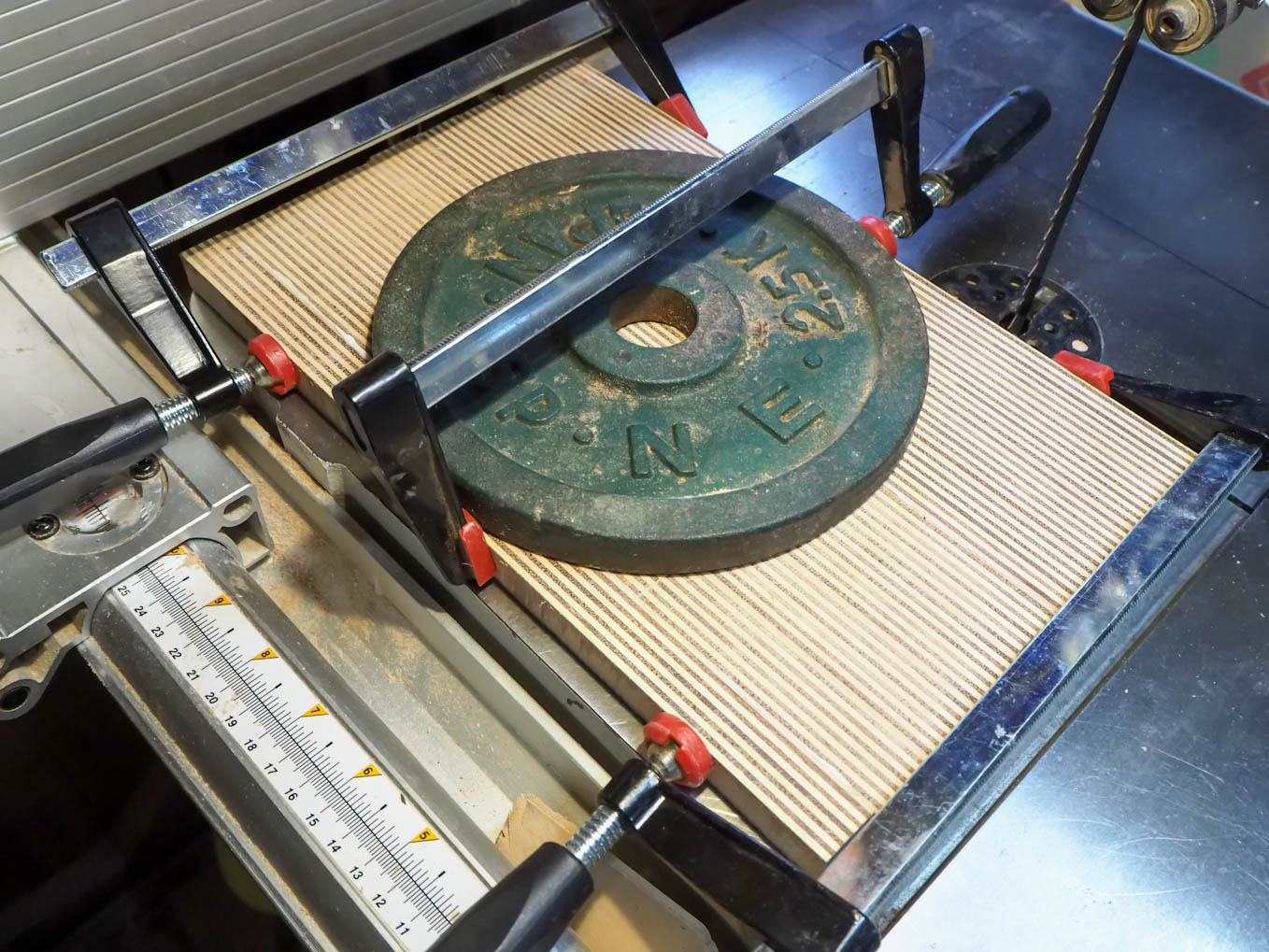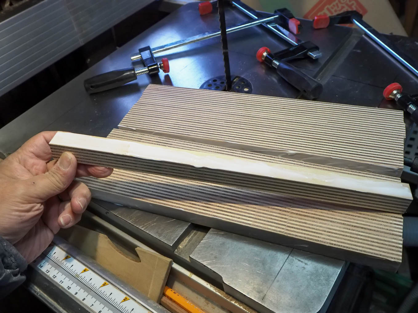 ラジオの奥行きは大よそ200mmなので21mm厚の合板を10枚重ねる必要があります。直接200mm前後の厚さから私のバンドソーで切り出すのは無理だったので3つに分割して切り出して接合することにしました。