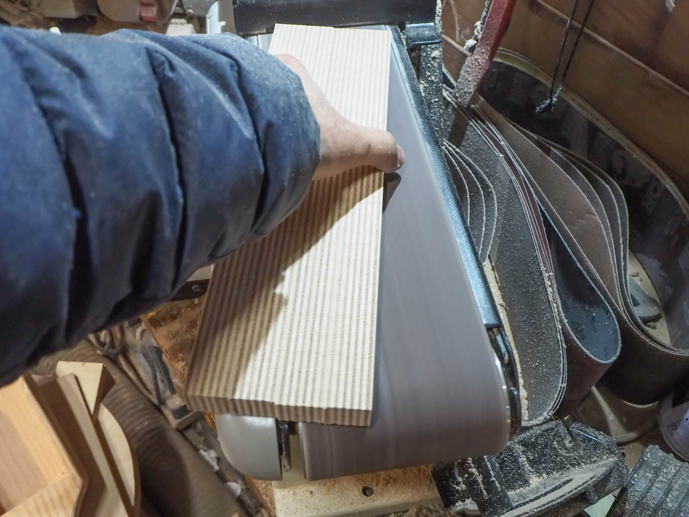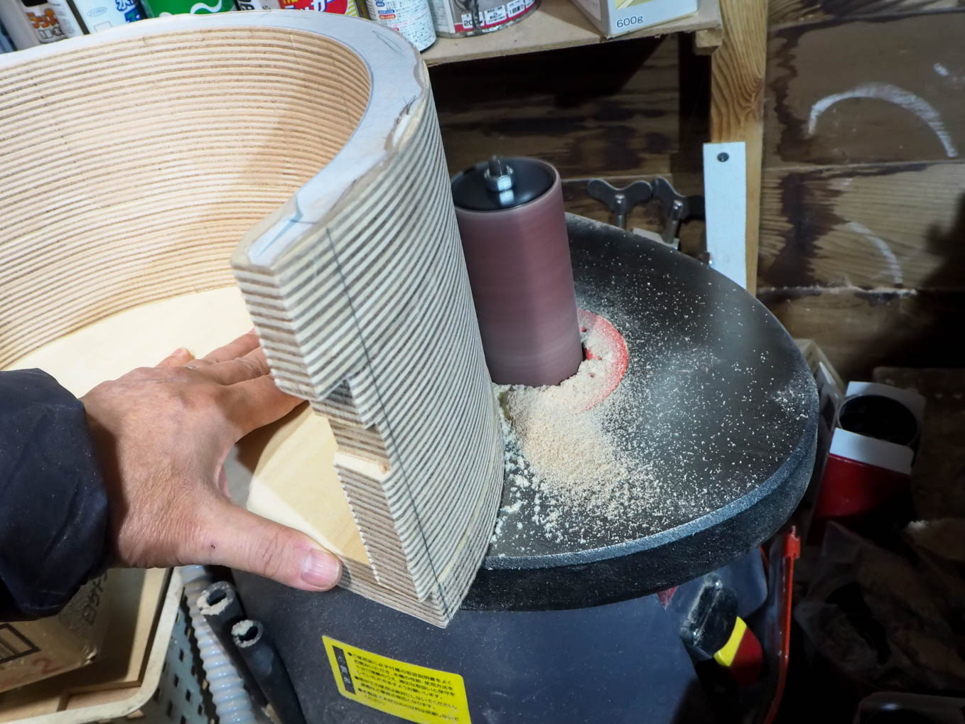 天板の面、特に分割して切り出したブロックをつないだ面は入念にサンディングして、塗装後につなぎ目がわからないようにします。こういう作業にはスピンドルサンダーが大活躍です。一応サンディングした各ブロックを重ねて接着します。接着後につなぎ目がわからなくなるよう再度入念にサンディングします。