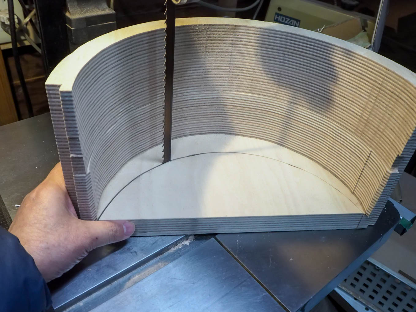 この砲弾型はエレガントで、アンティークとしても見栄えのするデザインですが、いざ作るとなると天板の丸い曲面の作りが難題です。おそらく実際に使われた製作方法は、薄い板に熱を加えて柔らかくしてから型にはめて丸める、いわゆる“曲げ木”の方法だったと思われます。でもこの方法は、なかなか難しそうだし、道具(ベンディングアイロンなど)もないので断念しました。いろいろと考えましたが、いつものようにバンドソーを使いたかったので、天板を木の塊からくりぬくことにしました。木の塊といっても合板を重ねて作ることにしました。切り抜いた面の模様(木口)が均一にそろうようにするために、ちょっと費用が掛かりましたがシナ合板の共芯を使いました。
