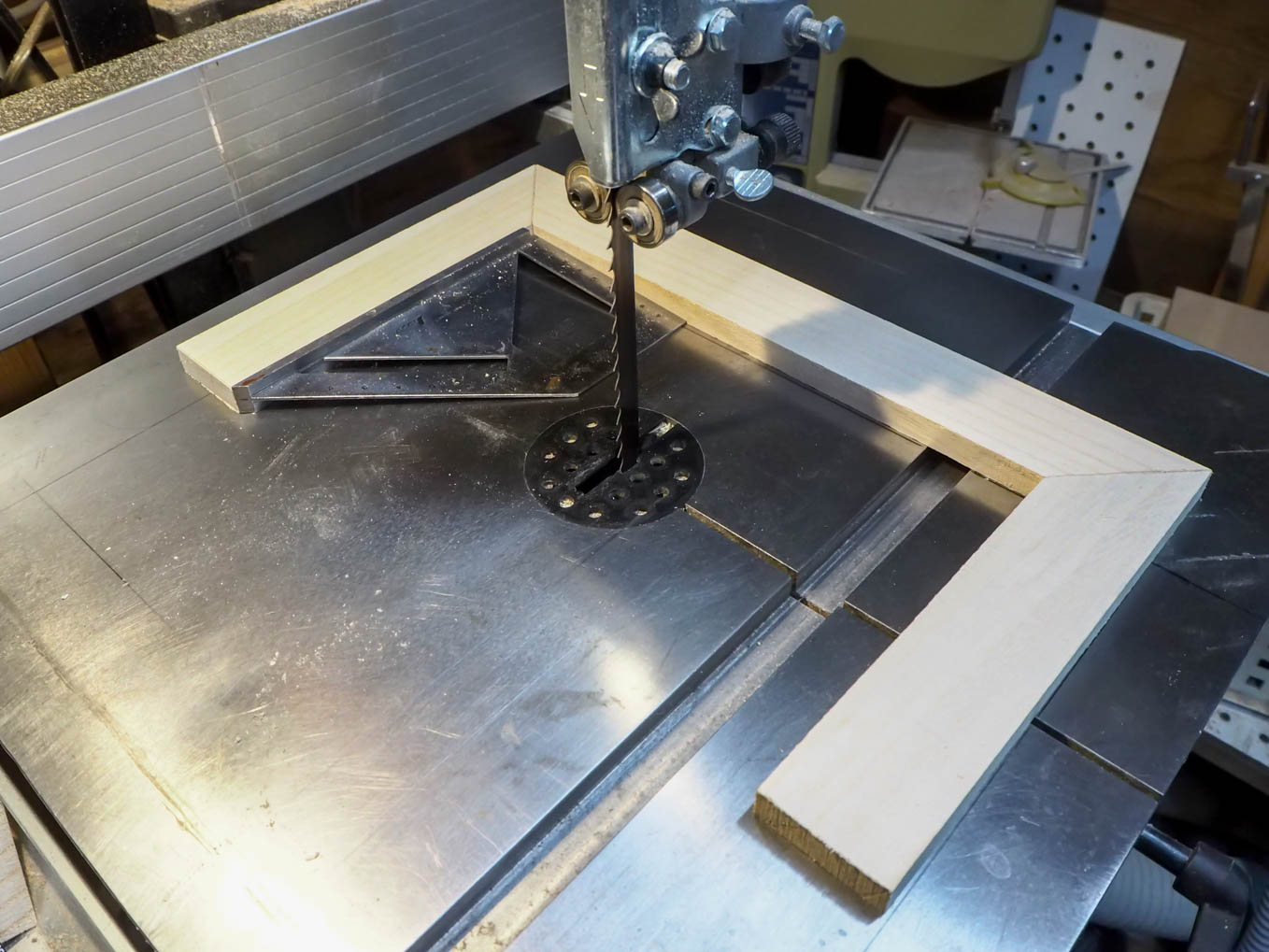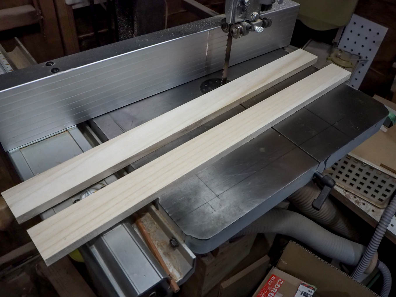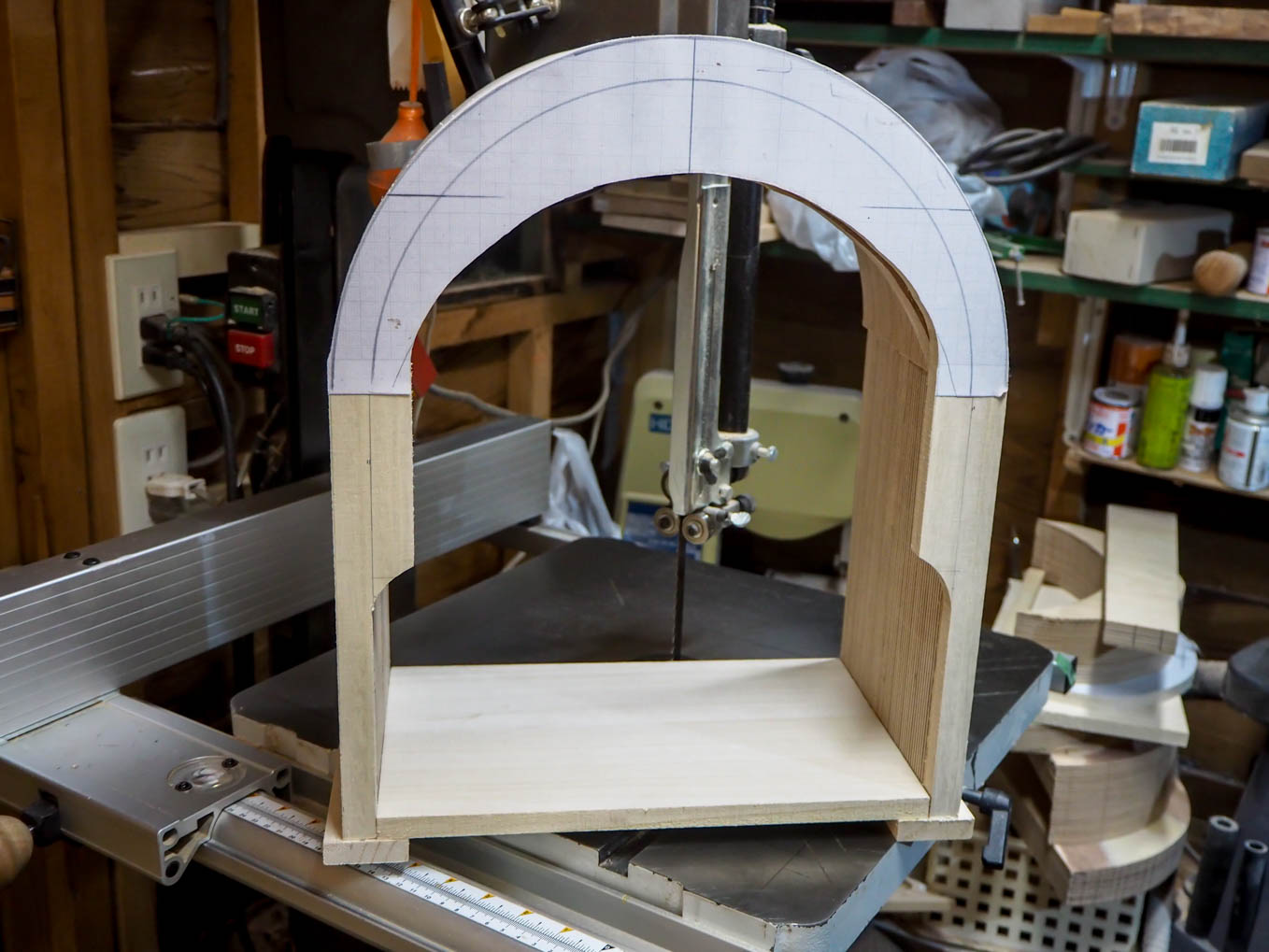 これを天板の両脇に継ぎ足すことになります。正確に継ぎ足すために、平らな台としてバンドソーの台を工作台替わりにして、台の表面に正確な位置を書き込み、それに合わせて天板と側板を置いて接着することにしました。木工作には公差という考え方がありません。大きなものであればおおよそ0.5mm以下の精度で工作しておけば、多少のことは現物を組み立てる段階での追加加工でどうにかなりますが、比較的に小さな作品は、0.2~0.3mm程度で押さえておかないと出来上がりに無理が来ます。今回のように平らな面の出た工作台に正確に位置を書き、ノギスで測った工作物を置いて行けばかなりの精度が出ます。これでラジオの枠組みが出来上がりです。