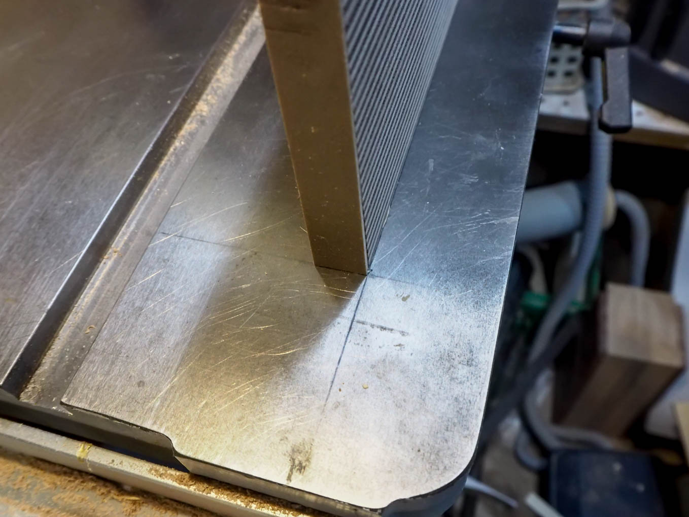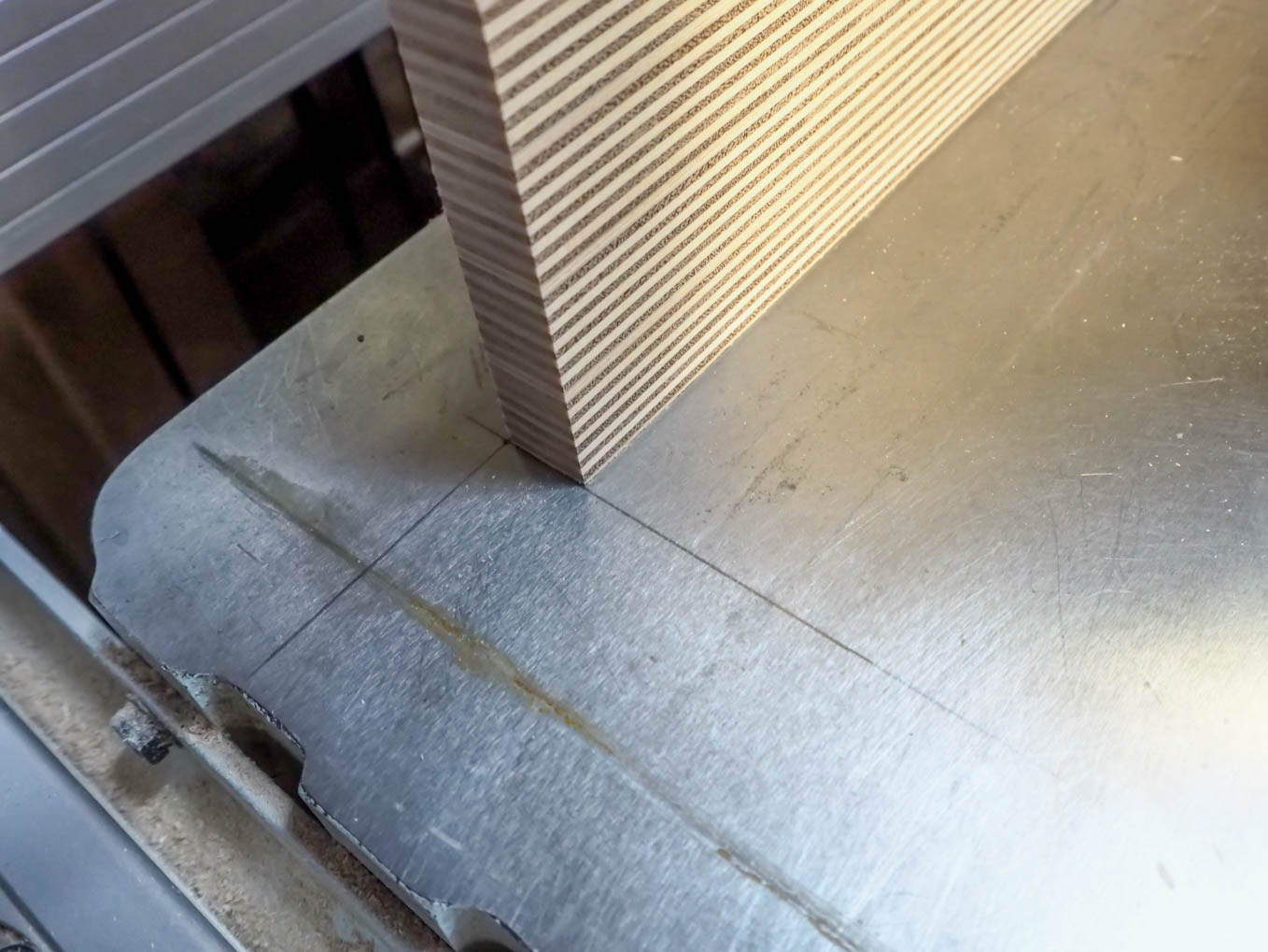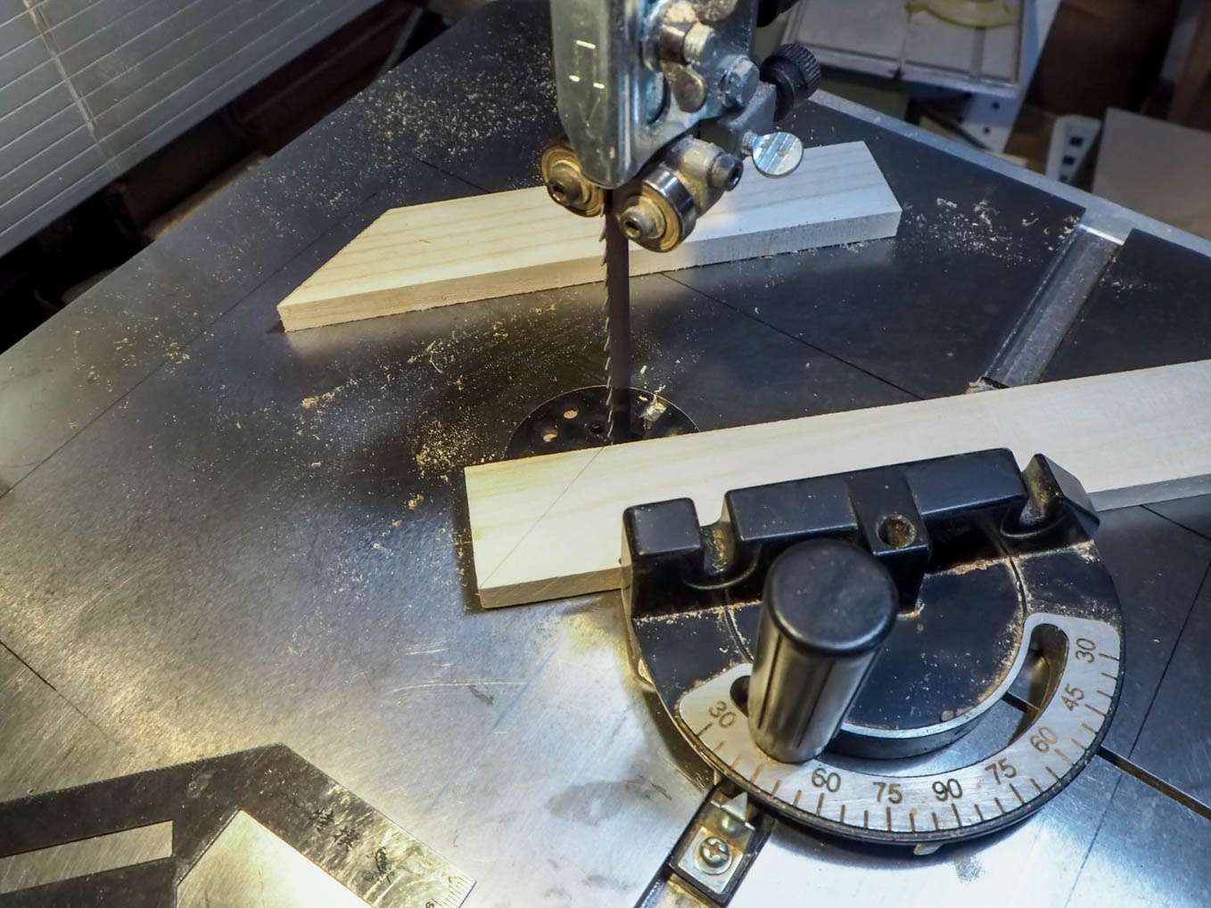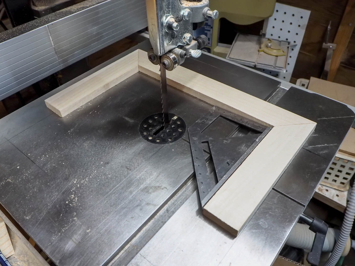 これを天板の両脇に継ぎ足すことになります。正確に継ぎ足すために、平らな台としてバンドソーの台を工作台替わりにして、台の表面に正確な位置を書き込み、それに合わせて天板と側板を置いて接着することにしました。木工作には公差という考え方がありません。大きなものであればおおよそ0.5mm以下の精度で工作しておけば、多少のことは現物を組み立てる段階での追加加工でどうにかなりますが、比較的に小さな作品は、0.2~0.3mm程度で押さえておかないと出来上がりに無理が来ます。今回のように平らな面の出た工作台に正確に位置を書き、ノギスで測った工作物を置いて行けばかなりの精度が出ます。これでラジオの枠組みが出来上がりです。