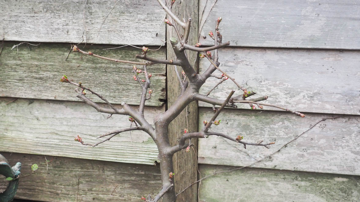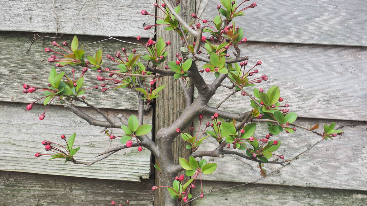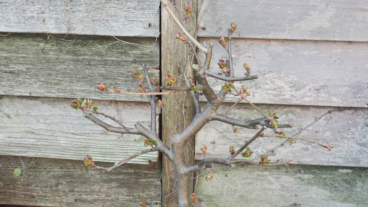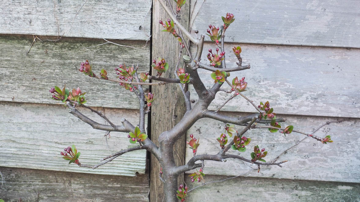 高さ30センチ程度で、盆栽風に枝が詰められていたので大きくなるかわかりませんが、秋に庭のむささび工房の壁際に下しました。年が明けてから芽吹きの兆しが見えてきました。ガーデニングは全くの素人ですが無事根付いたようで安心しました。