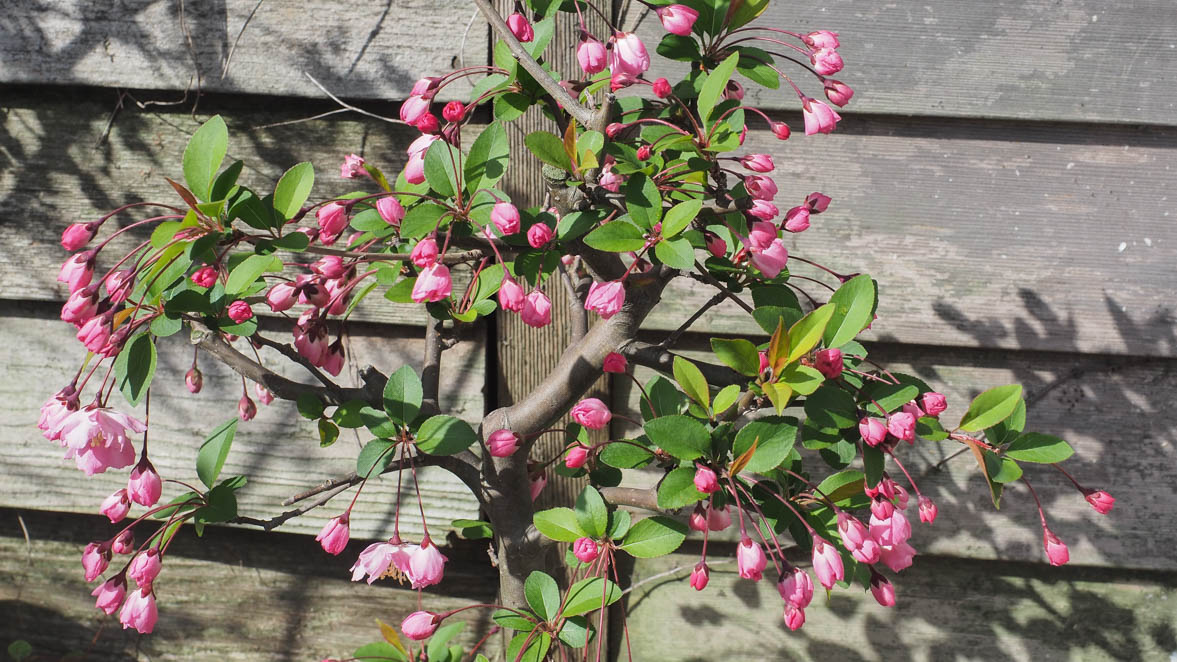 垂絲海棠(スイシカイドウ)というのは、垂れ下がって咲く花の美しさを表しているのでしょうか。「その花の美しさは、中国の唐の玄宗皇帝が酔って眠る楊貴妃をハナカイドウにたとえたように、昔から美人の代名詞として使われるほどです。」 とあります。まるで我が家の庭に楊貴妃が現れたようですね。ちなみに花言葉は「艶麗(えんれい)」だそうです。