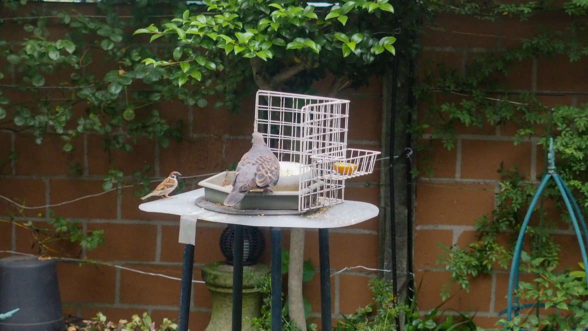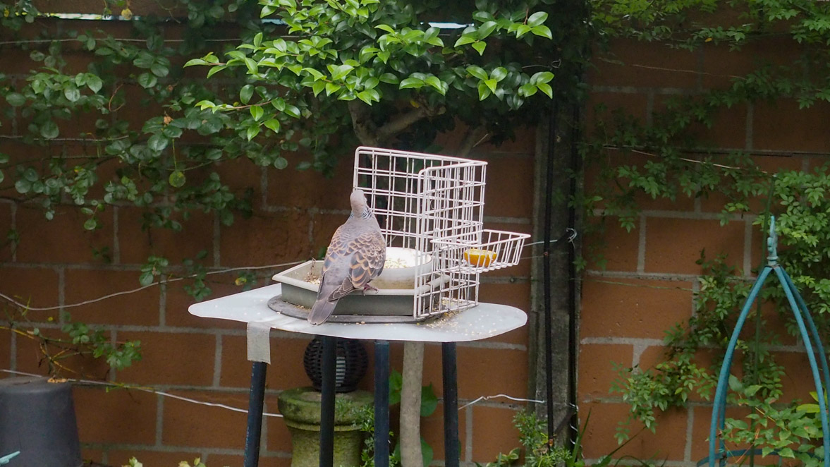 しばらくして庭を見るとエサ台に1羽のキジバトが止まっています。巣を見るとキジバトがいません。と言うことは、エサ台に止まっているのは親バトじゃんと思い、カメラを向けて観察を続けました。