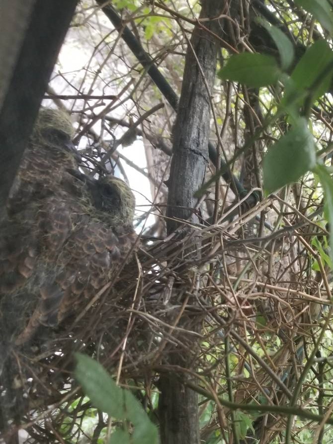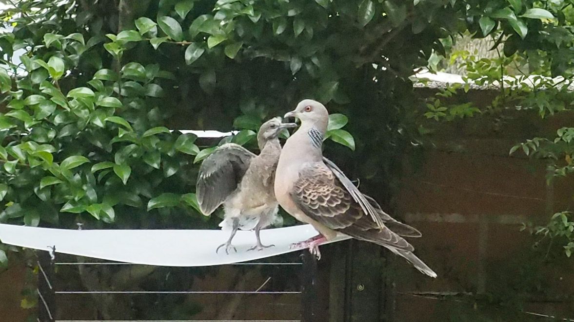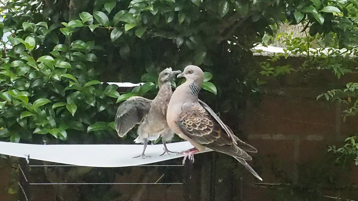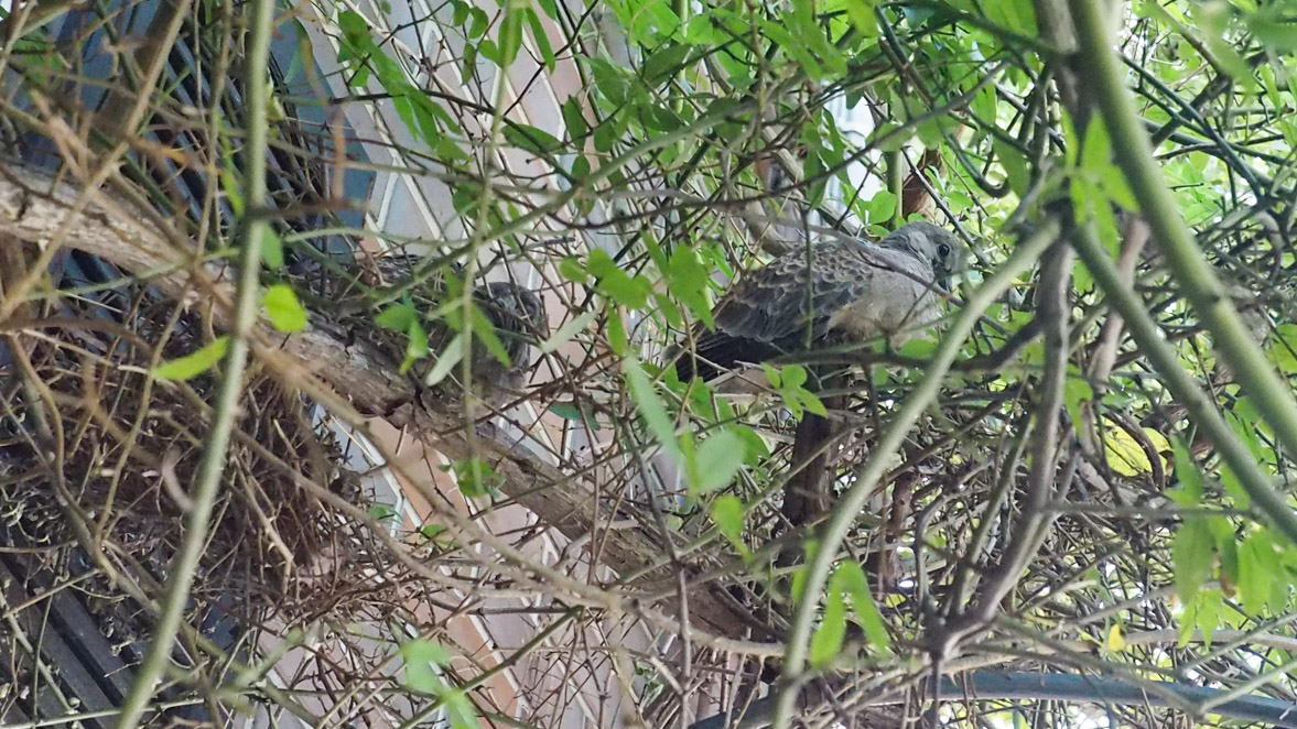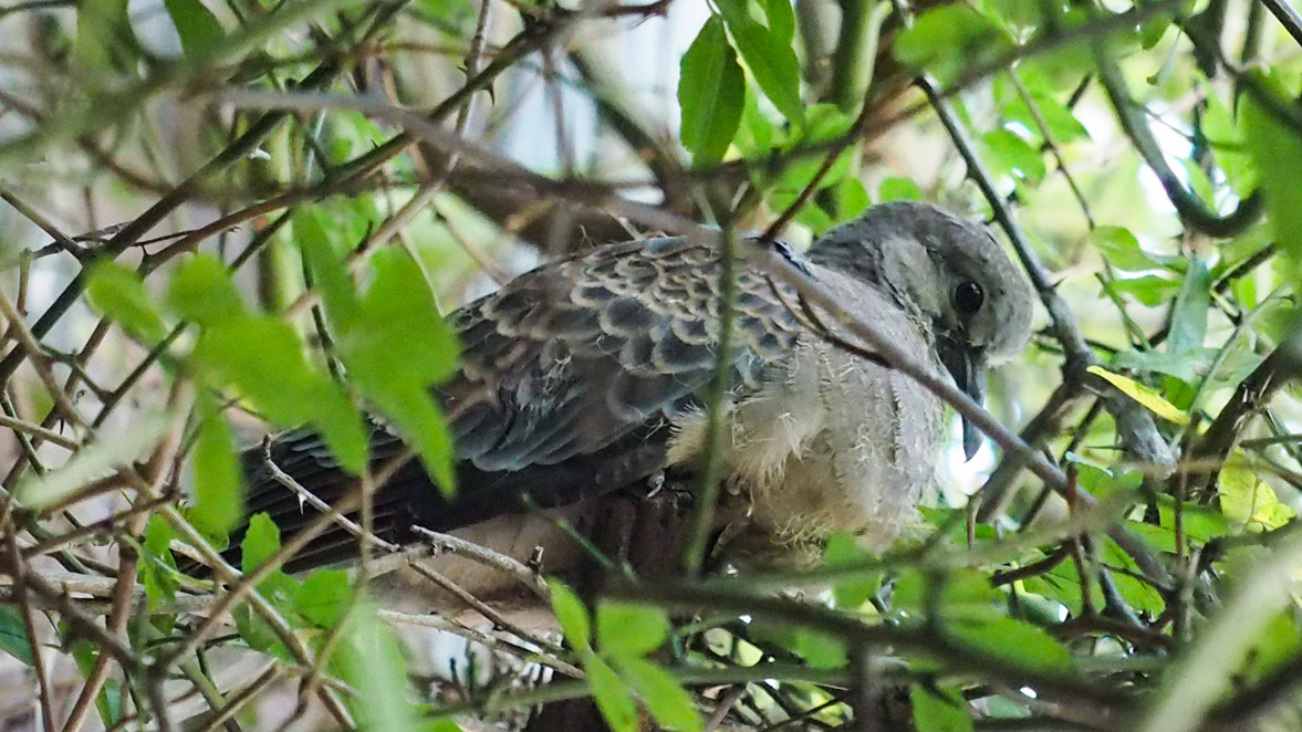 巣から出るようになって一週間ほどで羽はすっかりキジバト模様になりました。でも顔つきは幼く尾羽も短い、親バトを待つ子バトです。