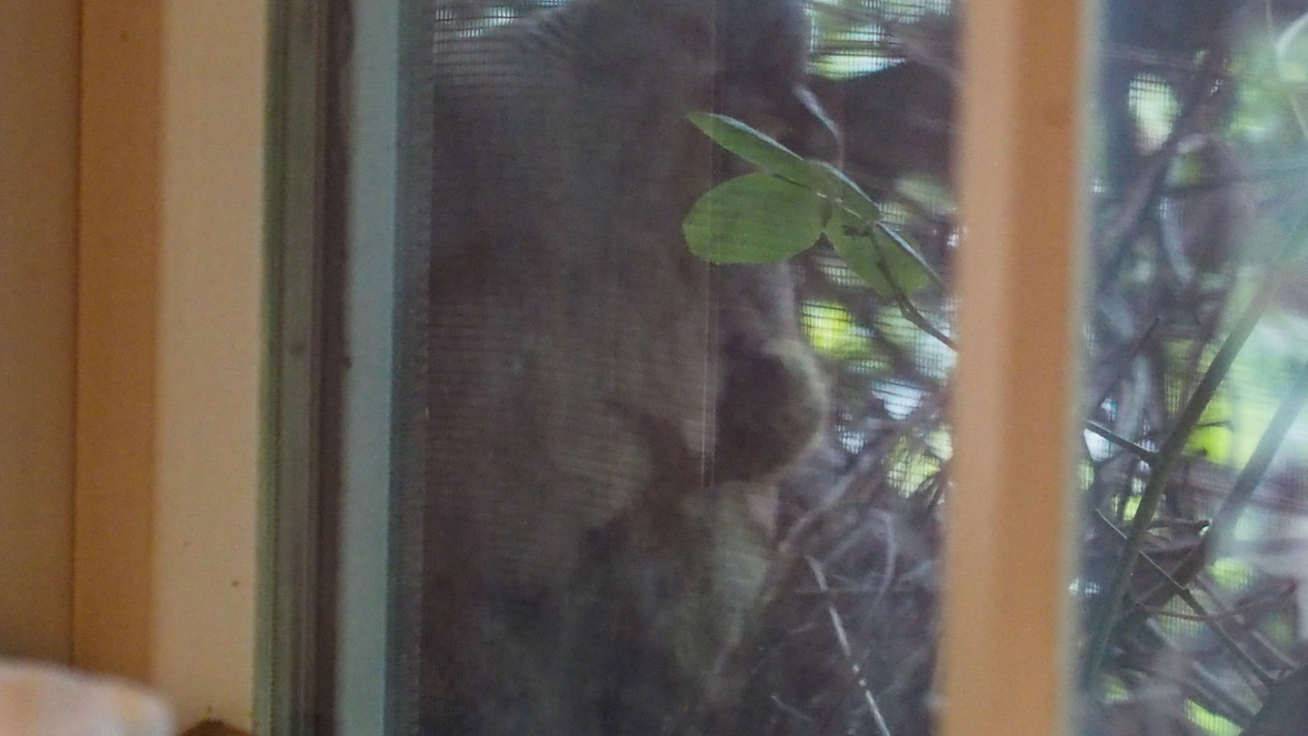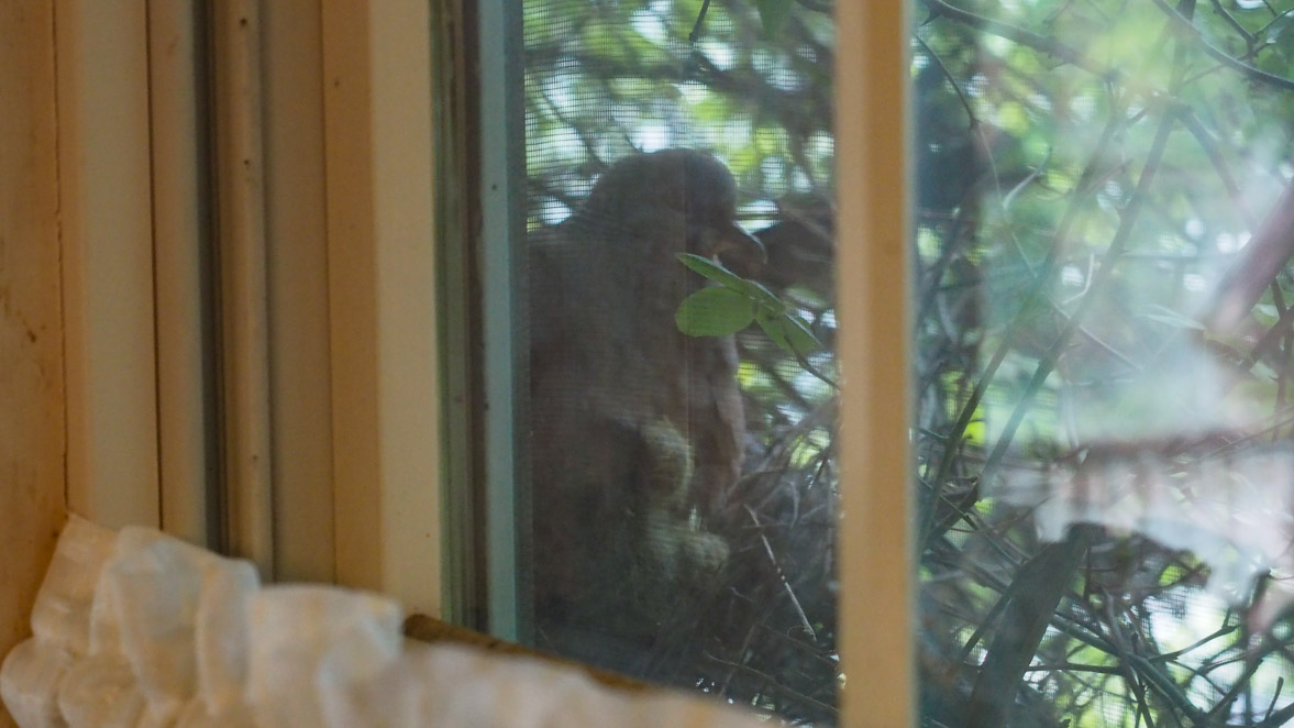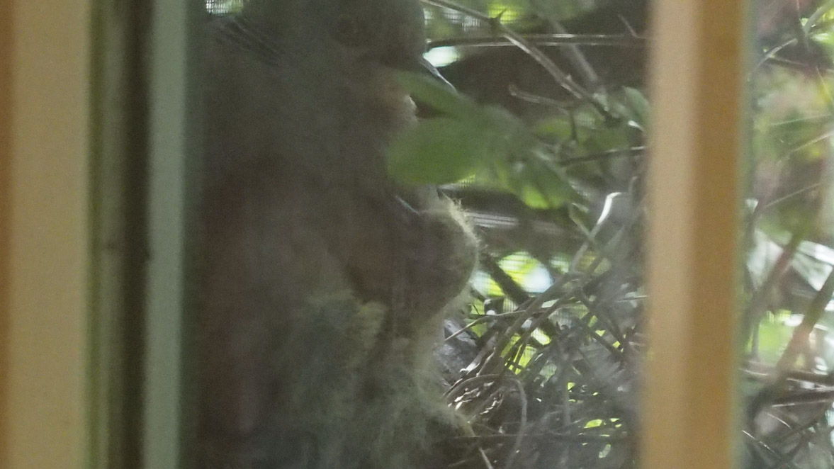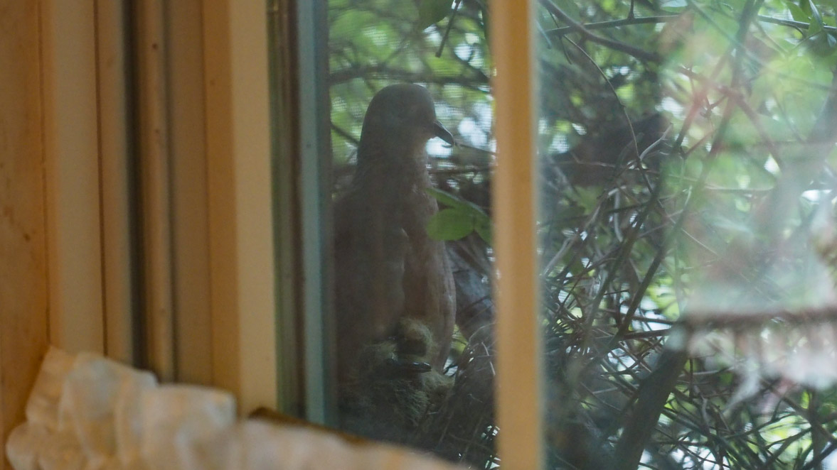 親バトが巣に戻る間隔が空いてきたのは、子バトに飛びし出してくるのを促しているのでしょうか。親バトが巣に戻ってきたときは子バトは喜びますが、親バトは「なにしてるの、早く飛び出しなさいよー」と言っているようにも見えます。でも、一回も練習しないで羽を広げて飛び出して落ちたらどうしようかと心配する日が続きました。