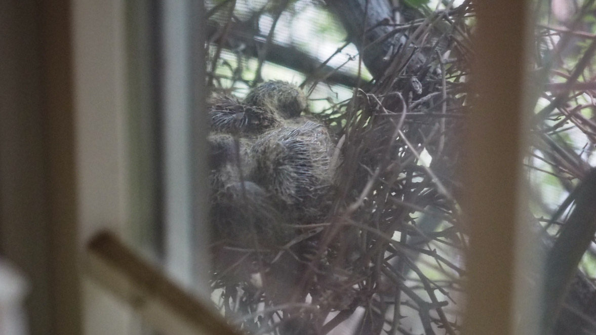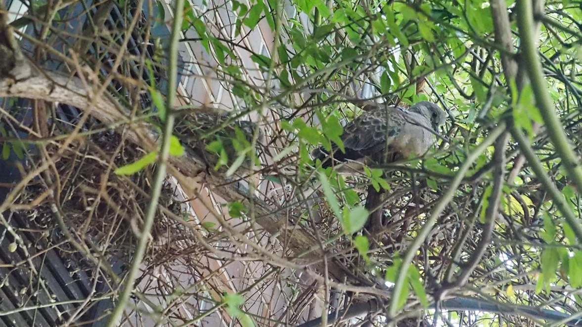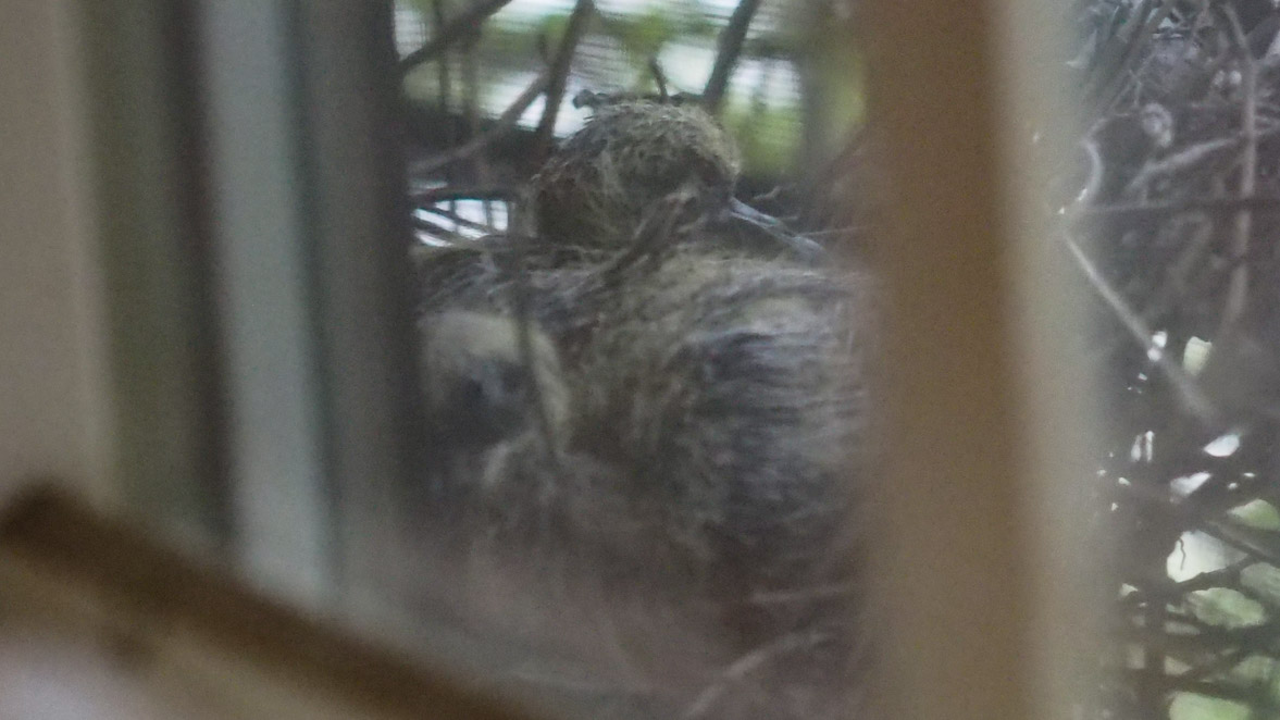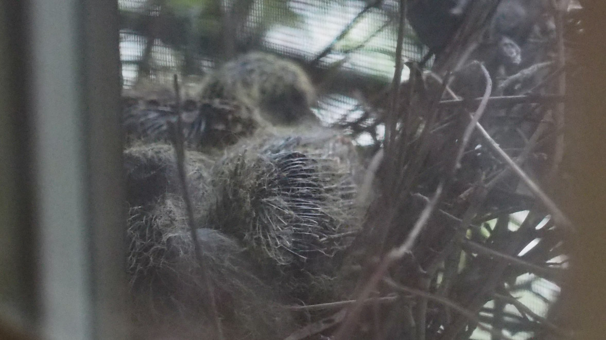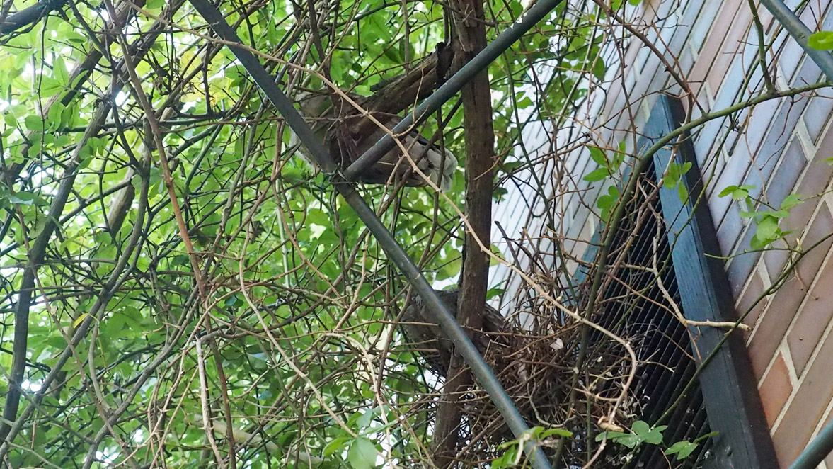 そして、数日後のある朝、妻に起こされました。「子バトが居なくなっちゃたよ、飛んで行ったみたい」私の返事は、「ちゃんと巣の下や庭の地面を見た? 落ちたりしてないよね」 そのあたりに落ちていたらすぐ巣に戻してあげないとカラスにやられてしまいます。