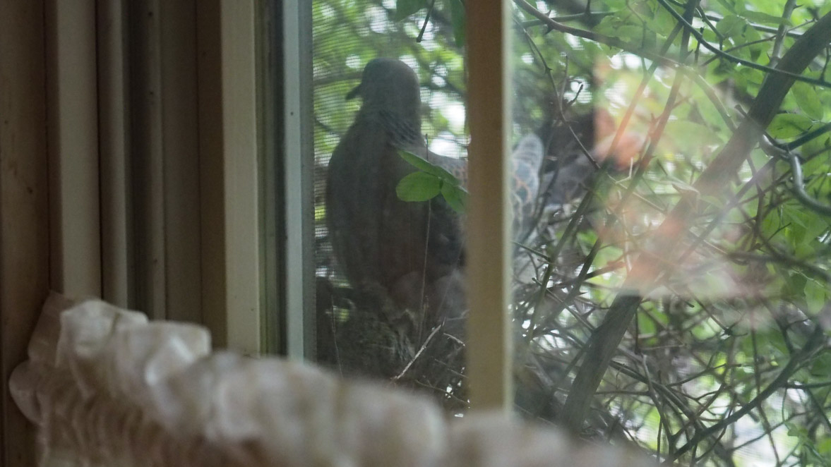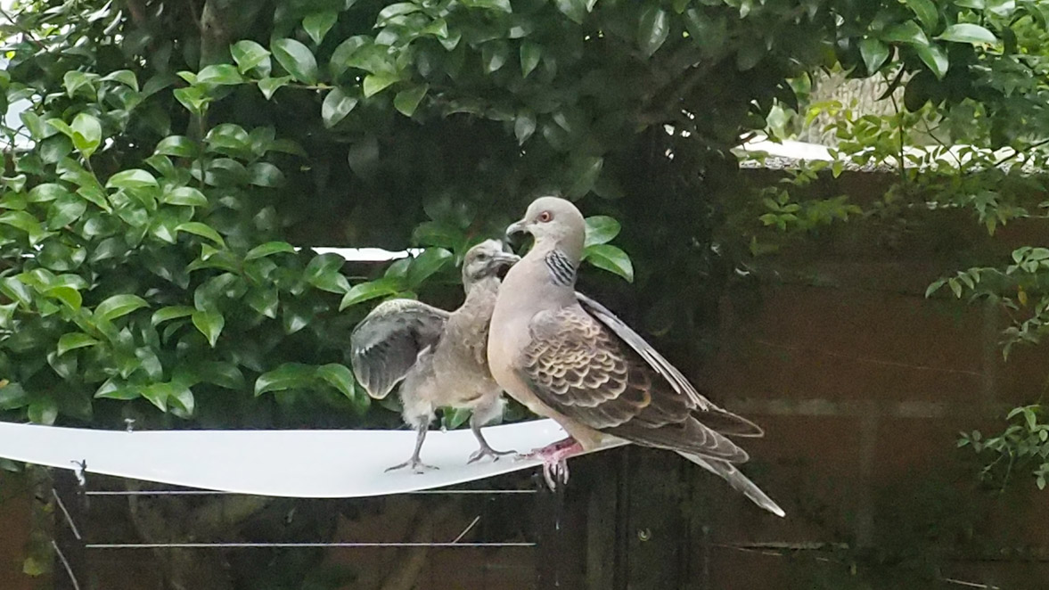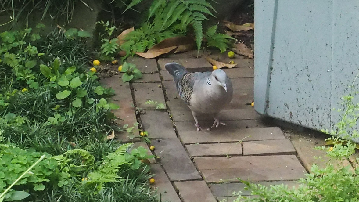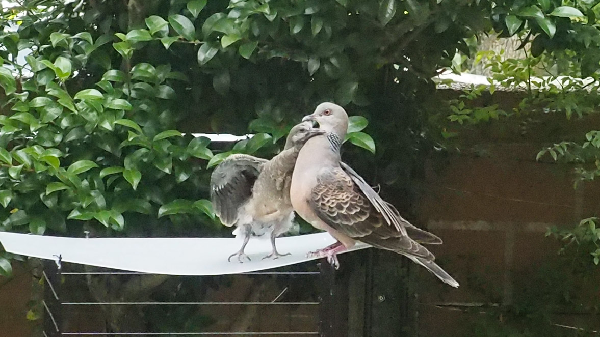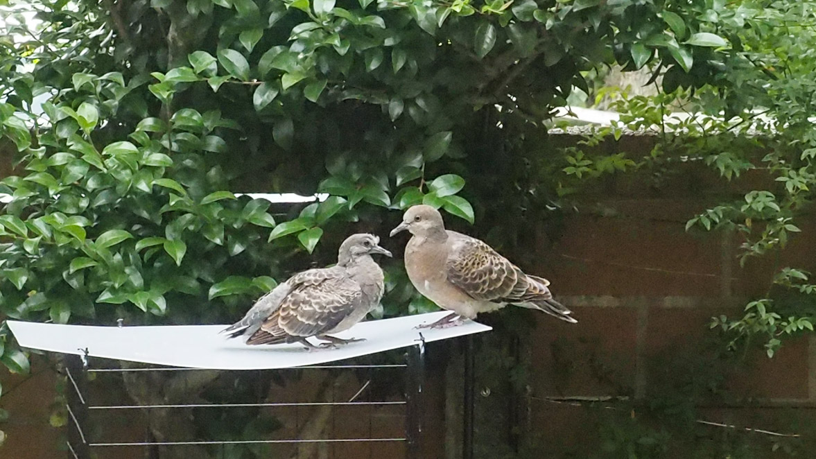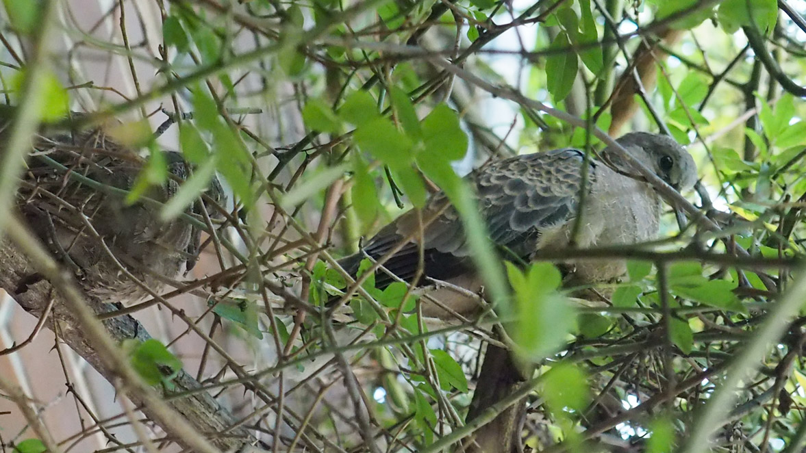 数週間前に巣の中で動き始めたひなを見つけた時には、とにかく無事に育って巣立っていってくれるようにと願っていました。こうして、立派なキジバトになって親子で庭に戻ってきてくれるとは思ってもいなかったので嬉しいかぎりです。抱卵を初めてから1か月ほどの間、ハラハラ、ドキドキと気をもみながらも楽しませてくれました。これからも時々会えると思うと嬉しいですね。