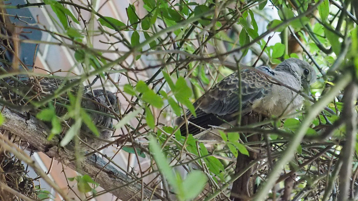 前回のブログ投稿の後、2羽のひなは順調に育ち、数日で羽毛に色がついてキジバトらしい姿になってきました。ひなはそろって首を巣から出していたのですが、そのうち1羽が巣から出て傍の枝に止まるようになってきました。