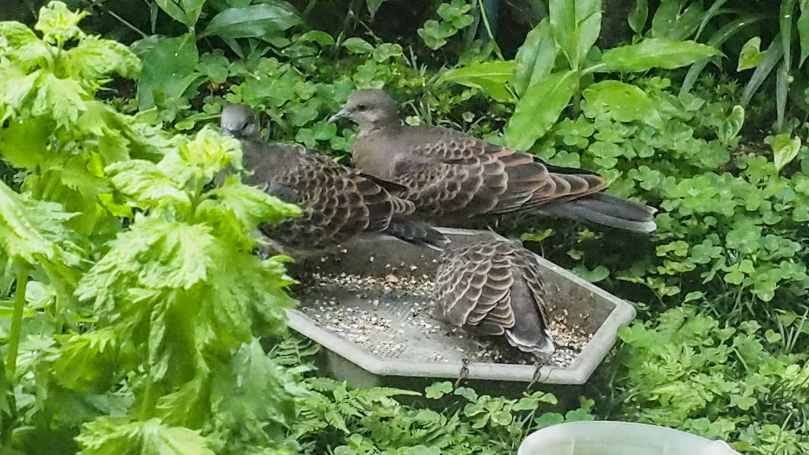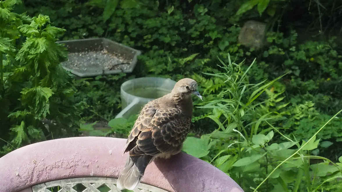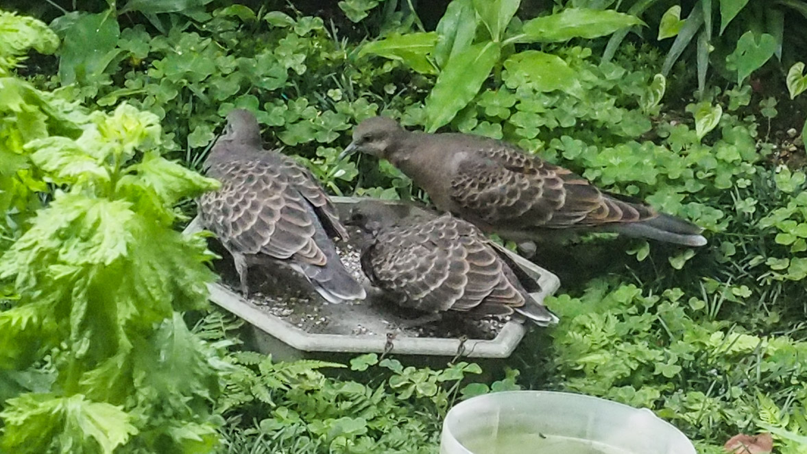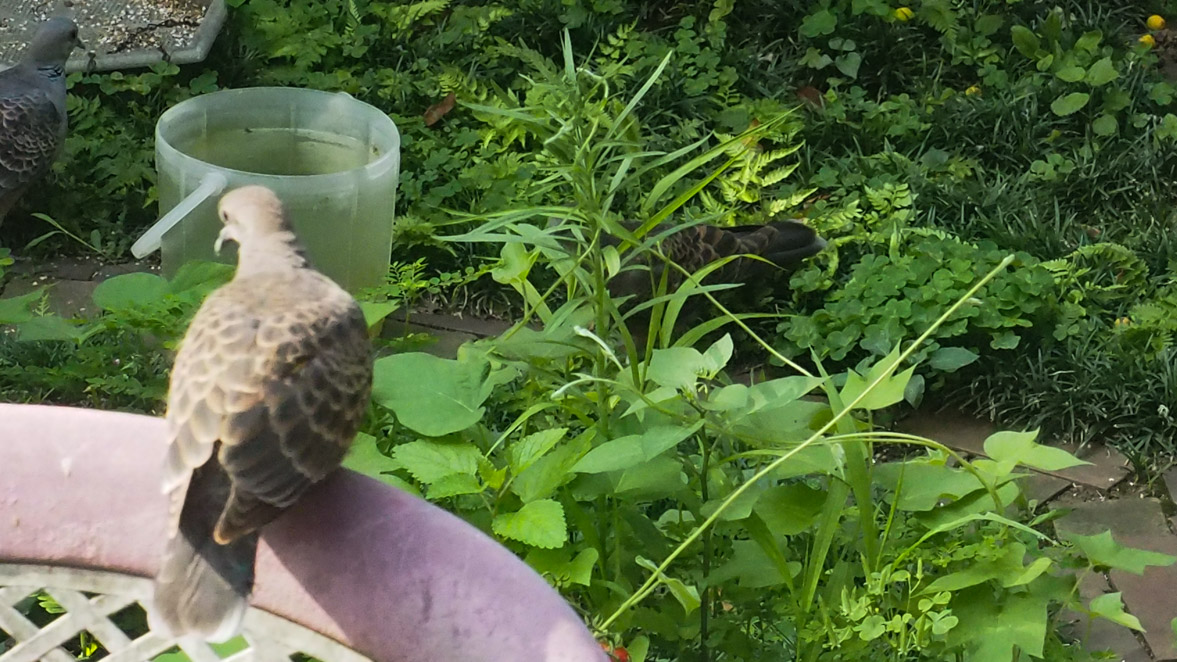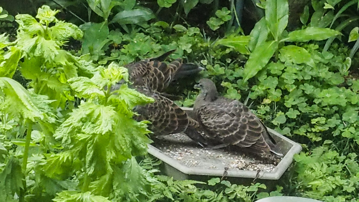 そんなハトポッポロスに陥っていたのですが、なんと、翌々日のお昼ごろ、気が抜けてボケっとしている私に、また妻が「キジバトがが来てる、あれ子バトじゃないの、早く早く来て」と少しハイテンションの呼びかけです。あわてて庭に見に行くと、確かに見慣れたキジバトの親よりは2割ほど小ぶりで、尾羽がまだ短いキジバトが庭の椅子の背もたれに止まっています。地面のエサ台の上にも1羽います。近くに一回り大きい親バトもエサをつついて歩いています、しばらくすると、野菜を植えたプランターのかげからもう1羽の子バトも現れ、エサのお皿に乗りました。親バトと一緒に帰って来たのです。思わず、ヨッシャー、お帰りハトポッポとつぶやきました。