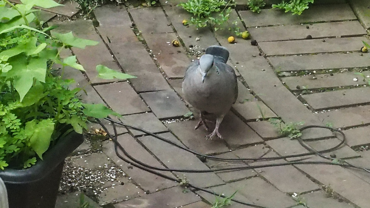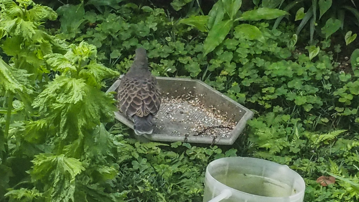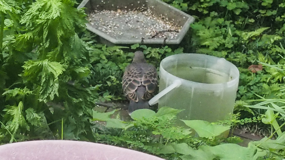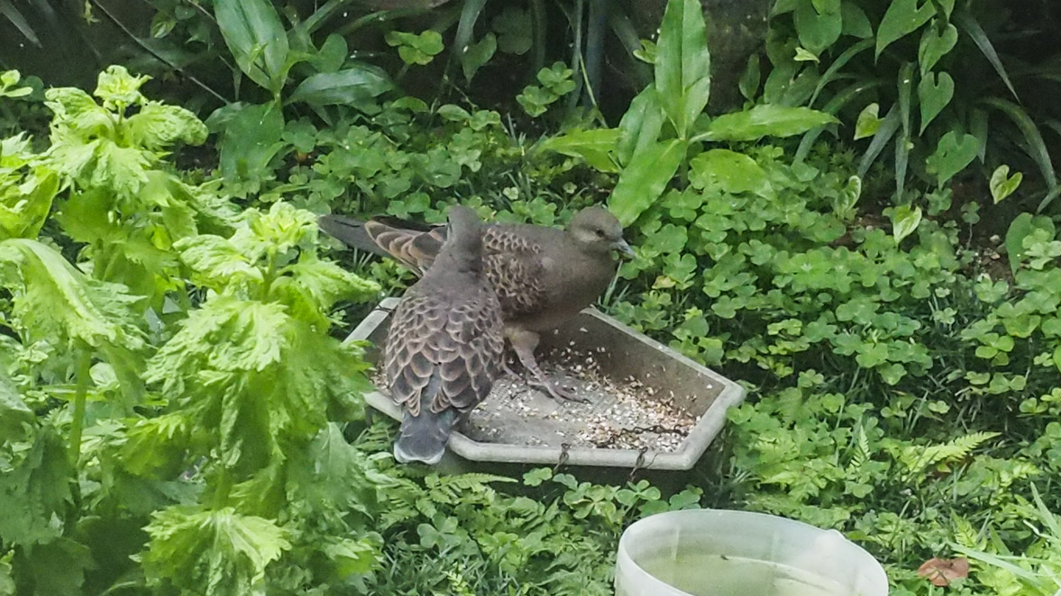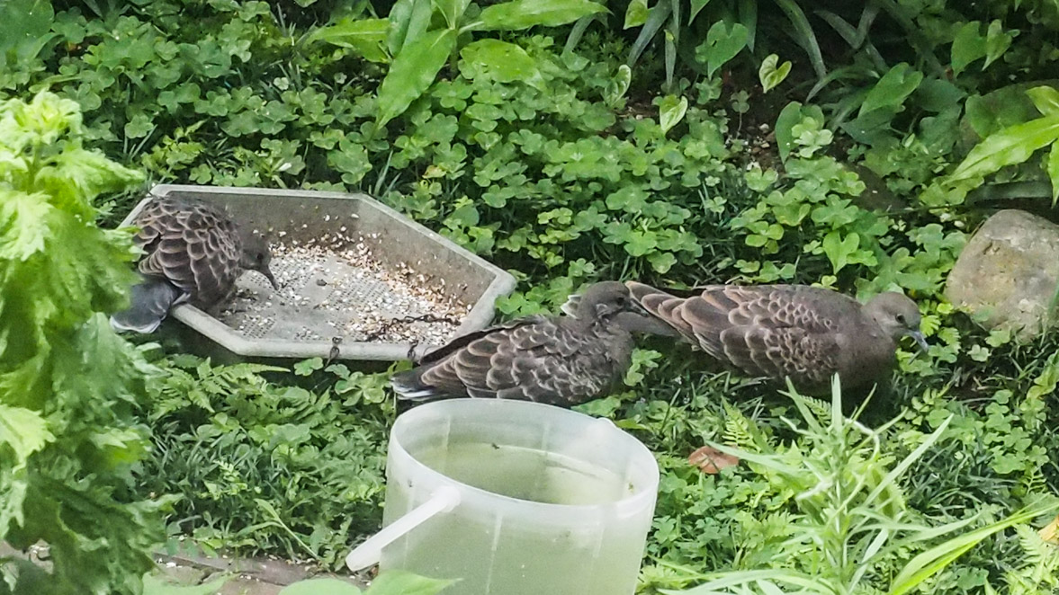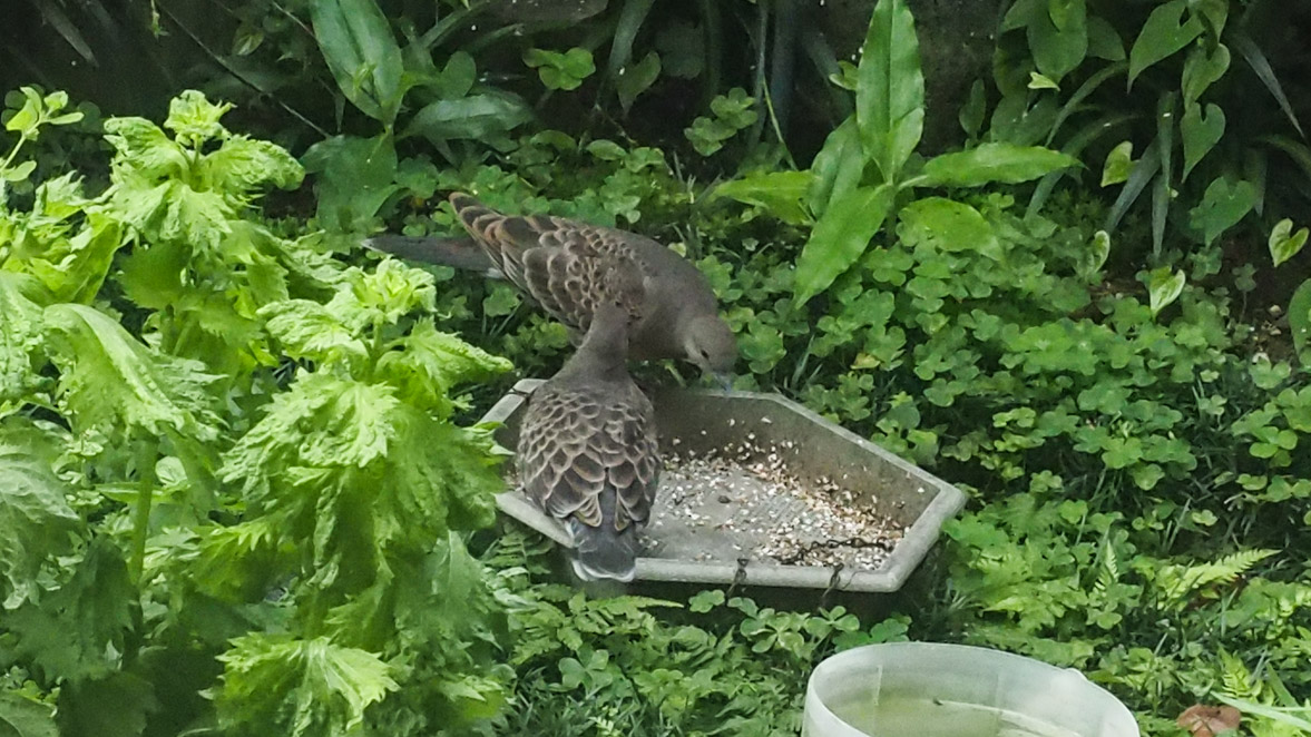 そんなハトポッポロスに陥っていたのですが、なんと、翌々日のお昼ごろ、気が抜けてボケっとしている私に、また妻が「キジバトがが来てる、あれ子バトじゃないの、早く早く来て」と少しハイテンションの呼びかけです。あわてて庭に見に行くと、確かに見慣れたキジバトの親よりは2割ほど小ぶりで、尾羽がまだ短いキジバトが庭の椅子の背もたれに止まっています。地面のエサ台の上にも1羽います。近くに一回り大きい親バトもエサをつついて歩いています、しばらくすると、野菜を植えたプランターのかげからもう1羽の子バトも現れ、エサのお皿に乗りました。親バトと一緒に帰って来たのです。思わず、ヨッシャー、お帰りハトポッポとつぶやきました。