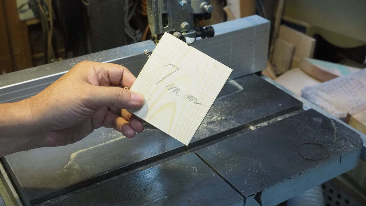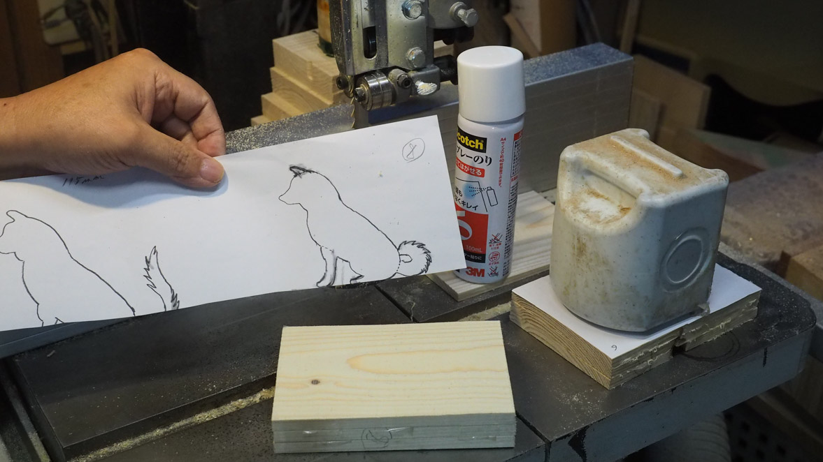 犬の両側面2枚と胴体部分1枚の計3枚を切り出します。厚さは試行錯誤しましたが7mm程度がバランスがよいようです。