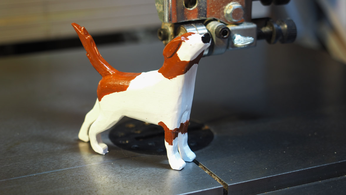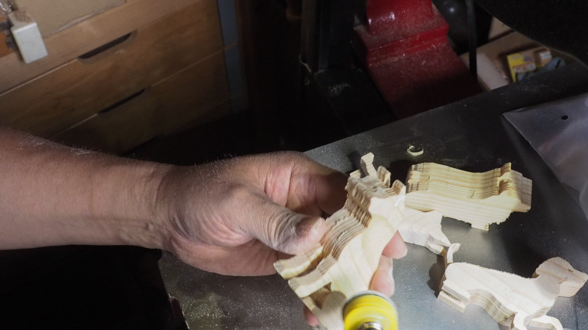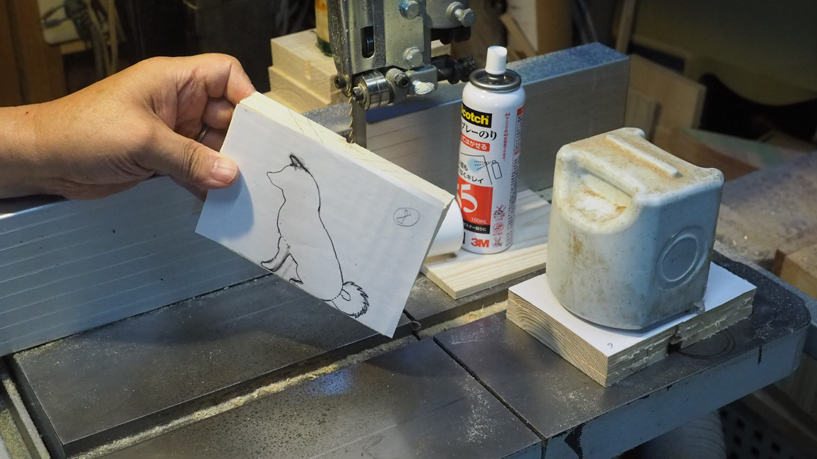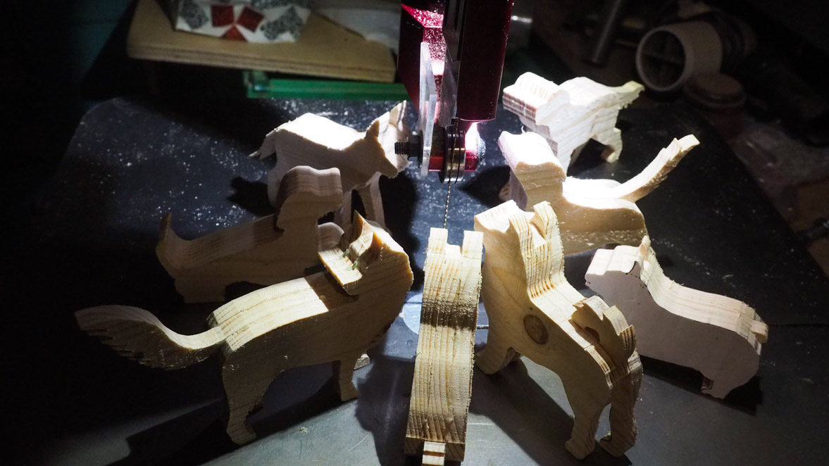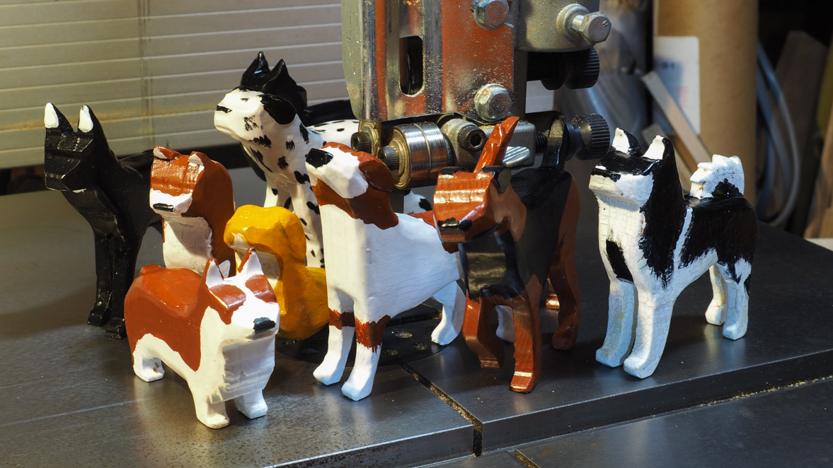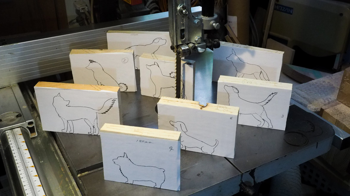 犬ブロックの切り出しにはぺガスのスクロール・ソーを使いました。やはりこの程度の細かい曲線ものになるとこのスクロール・ソーがいいですね。