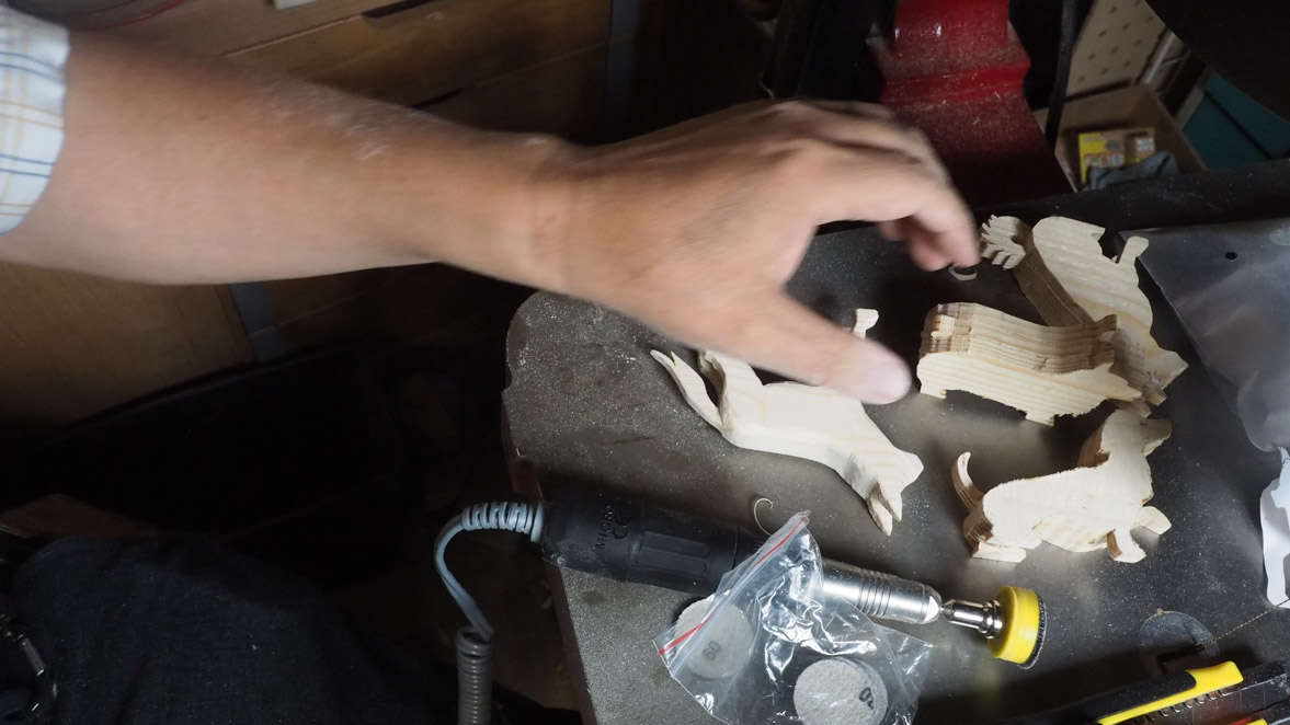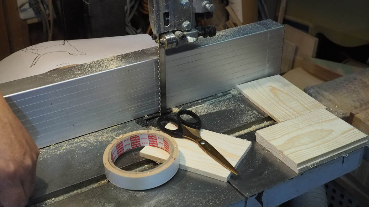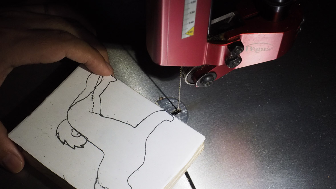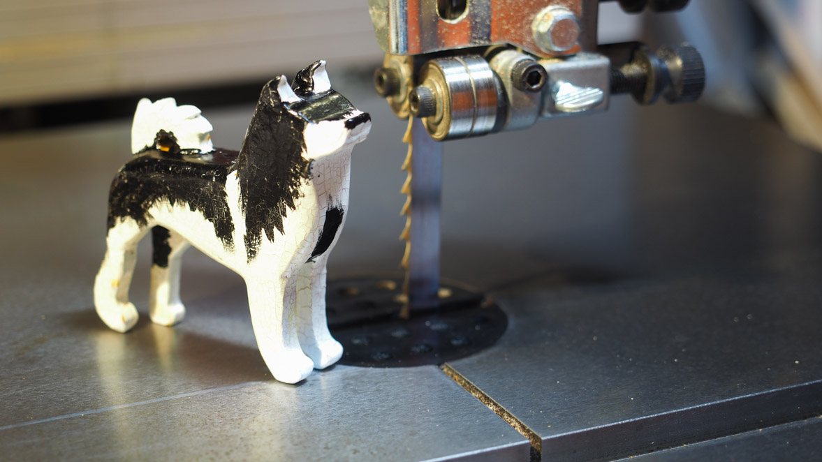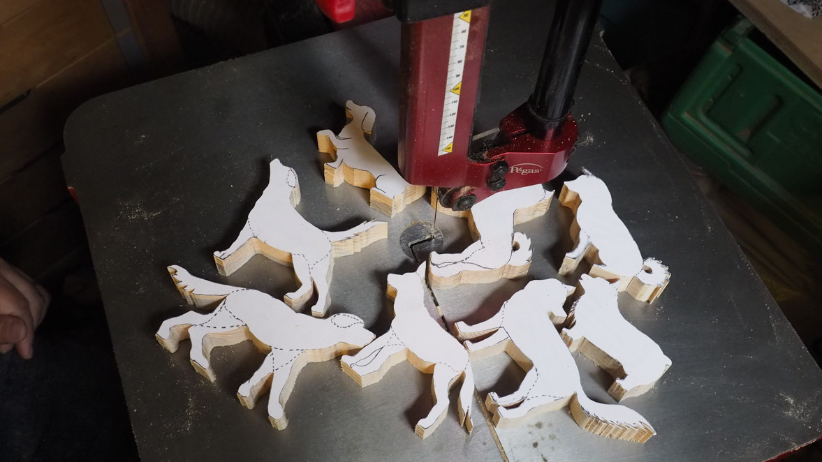 犬ブロックの切り出しにはぺガスのスクロール・ソーを使いました。やはりこの程度の細かい曲線ものになるとこのスクロール・ソーがいいですね。