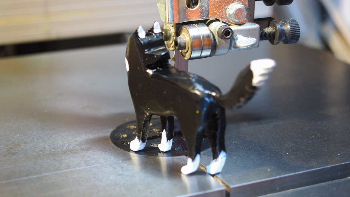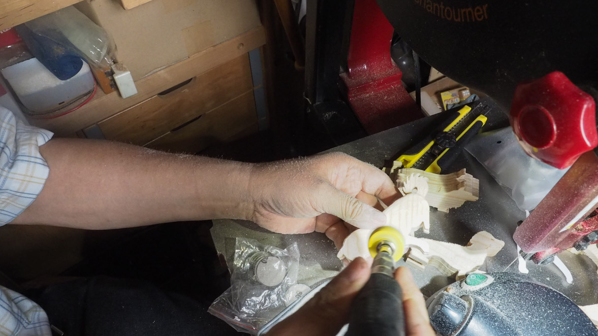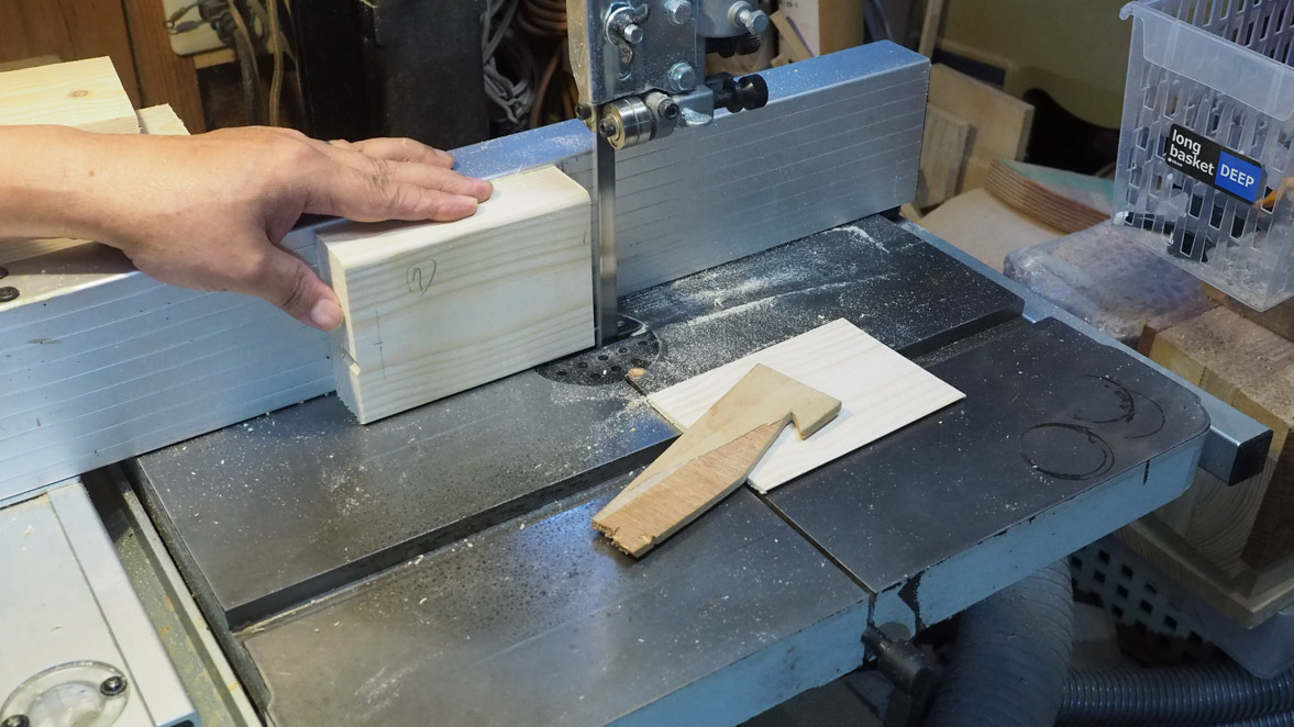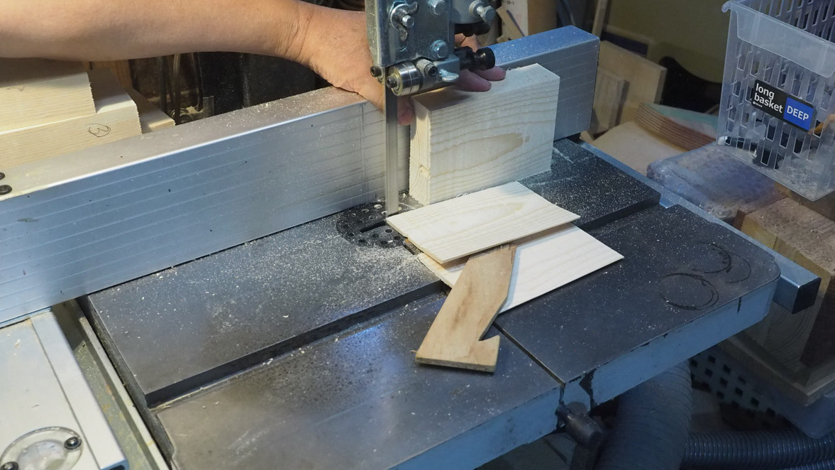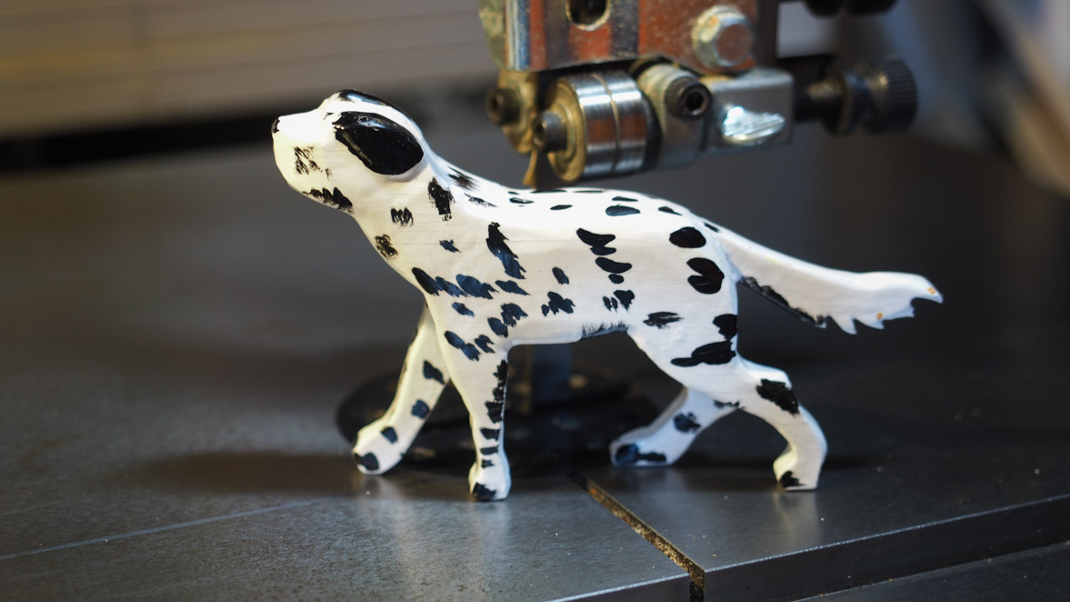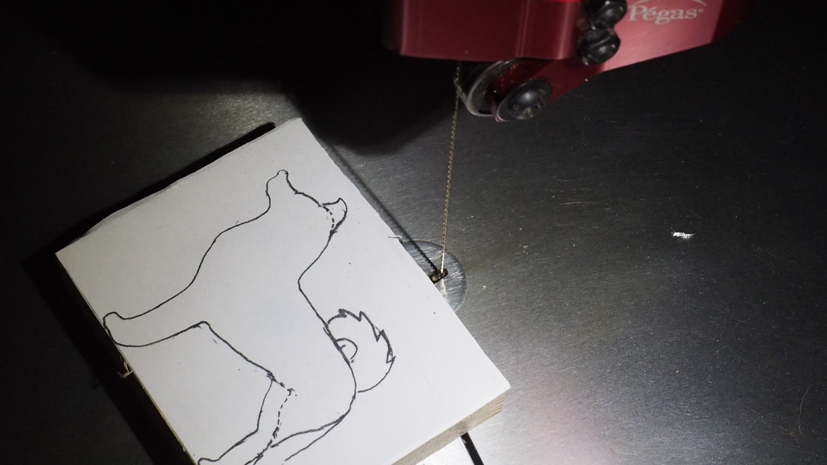 犬ブロックの切り出しにはぺガスのスクロール・ソーを使いました。やはりこの程度の細かい曲線ものになるとこのスクロール・ソーがいいですね。