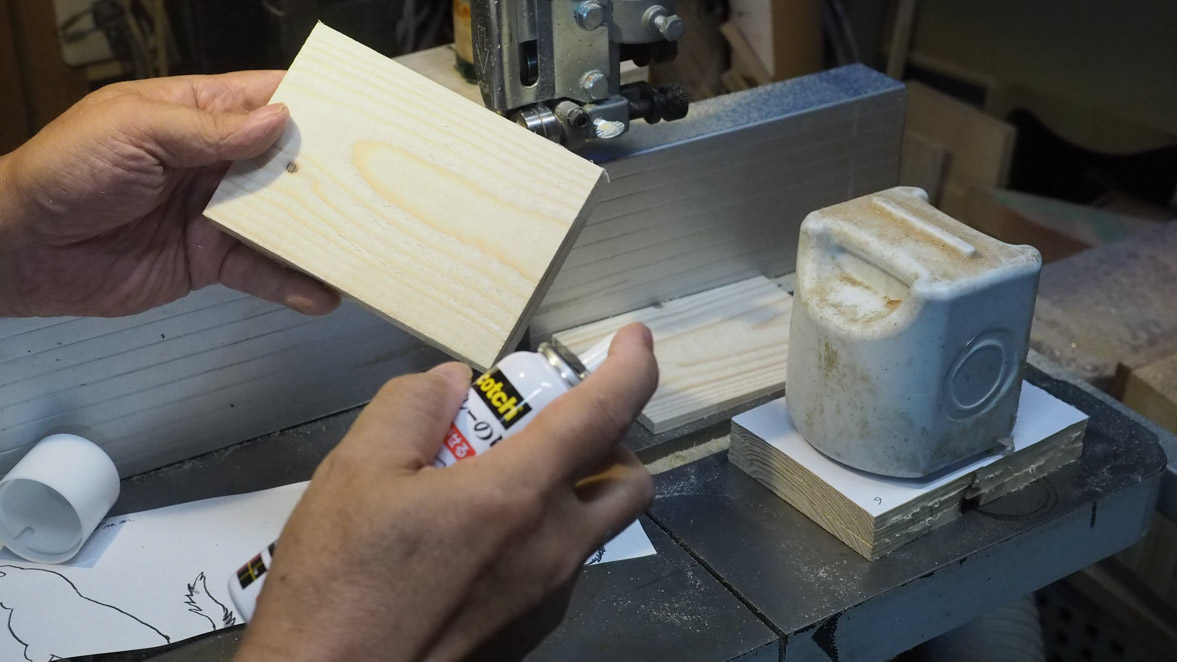 切り出した3枚を木目に気を付けて両面テープで張り付けます。その上に犬の原紙を張り付けます。