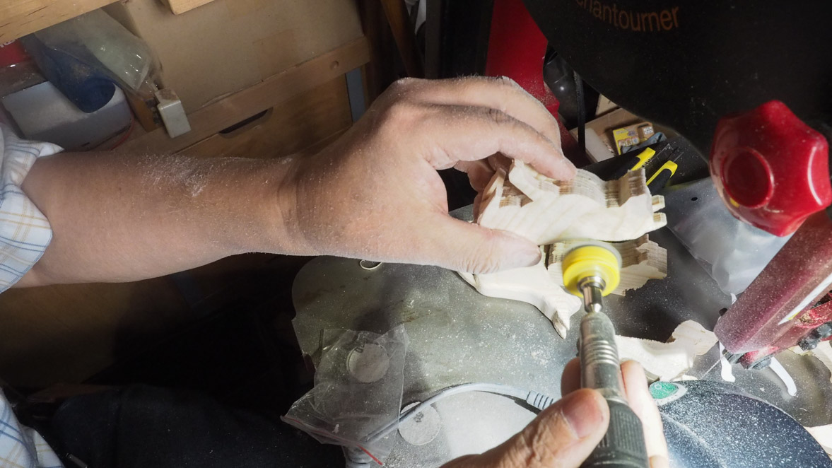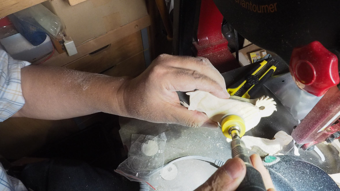 次はサンディングです。昨年導入したアルゴファイルのミニルータの出番です。面倒な作業ですが手を抜かずに頑張ります。