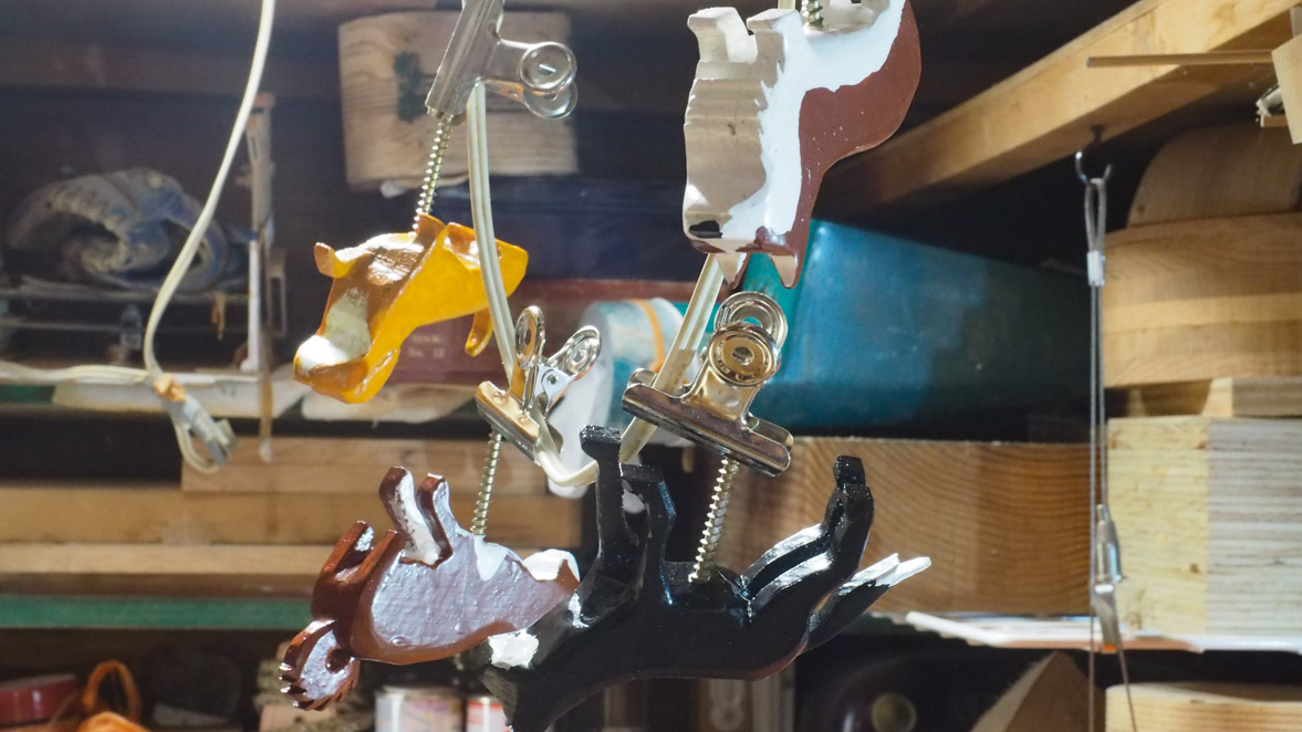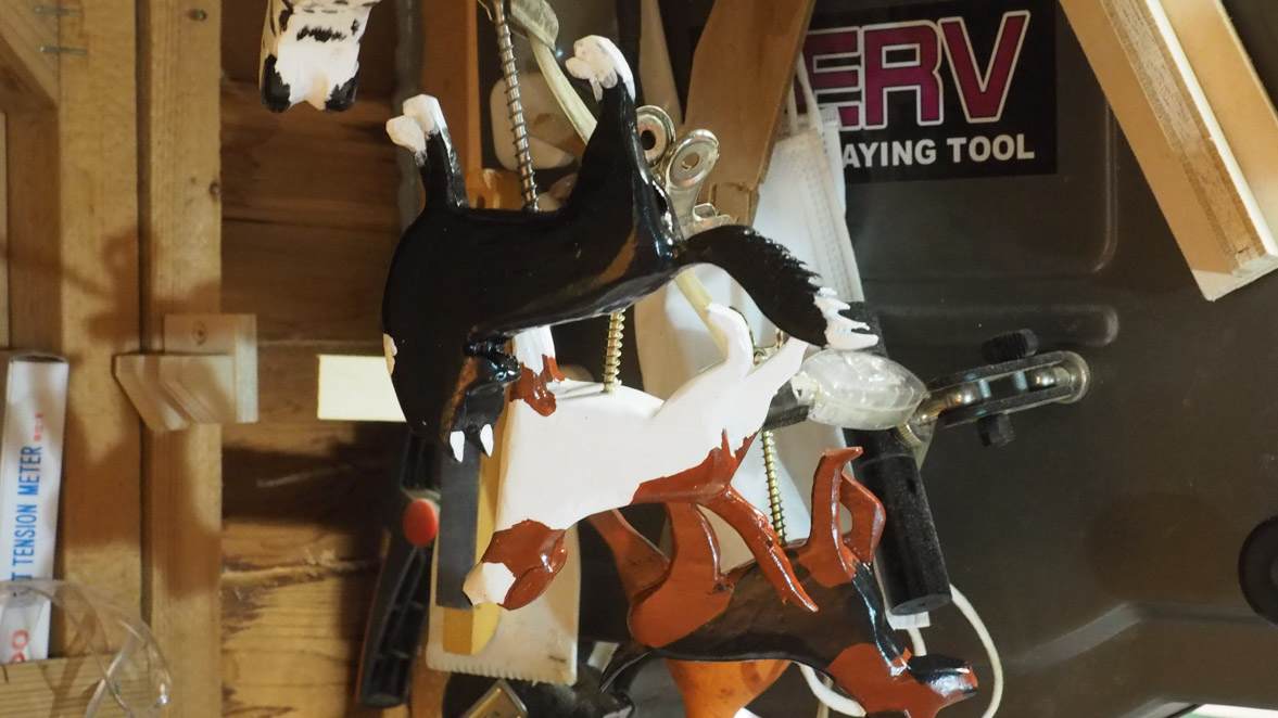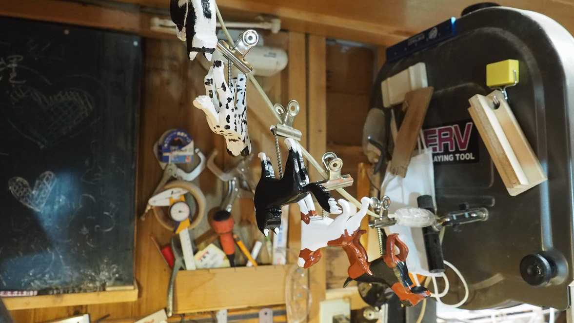 塗装中の写真撮影を忘れたようで、塗装済みのワンちゃんを吊るして乾燥している写真だけになってしまいました。
