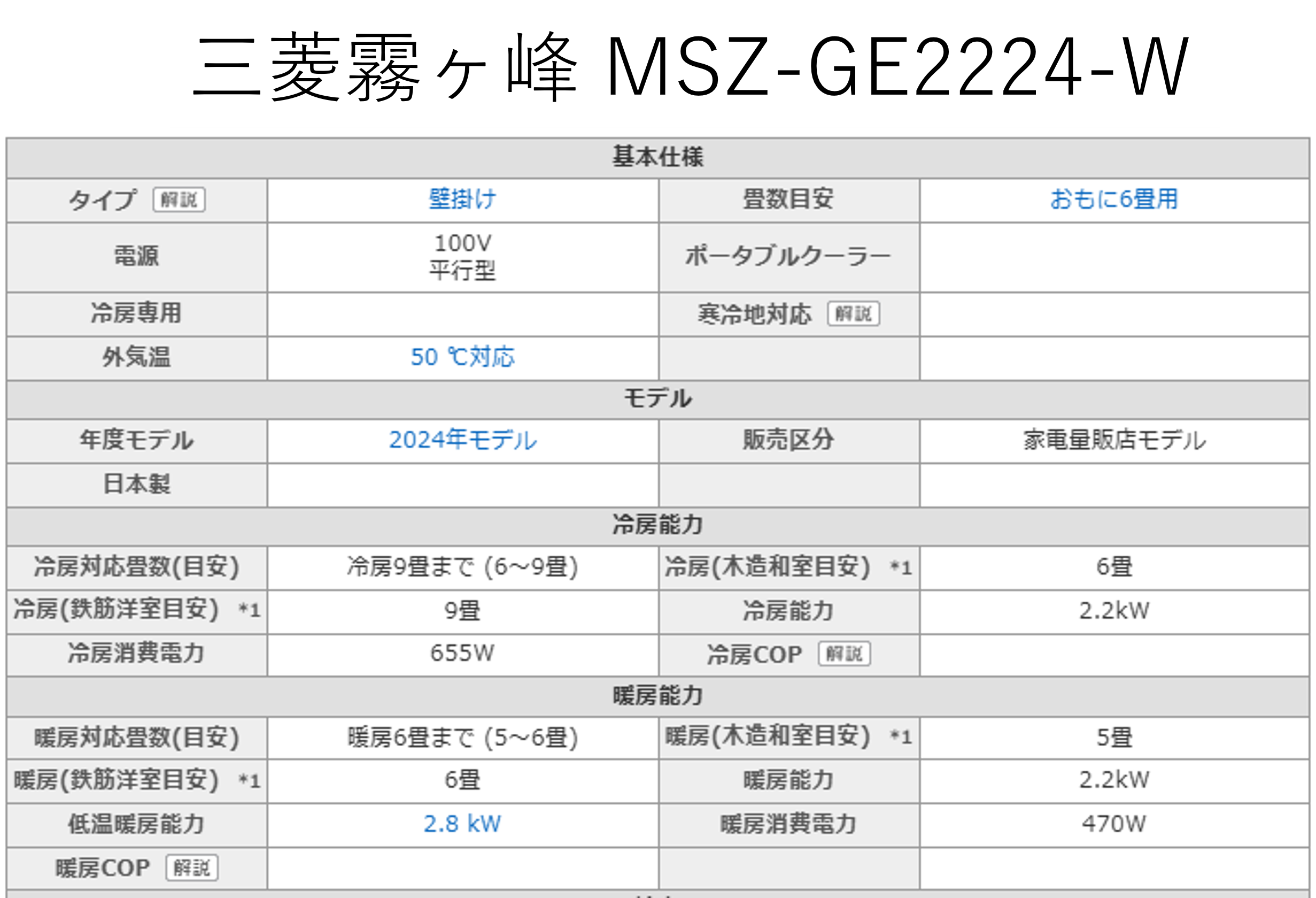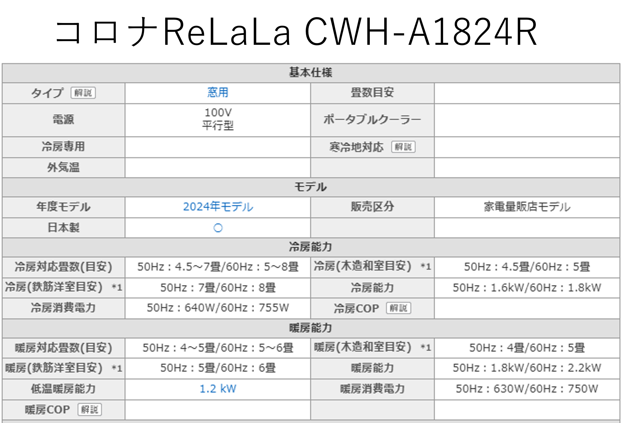 14インチのバンドソーの運転開始時(始動電流発生)にエアコンや他の容量の大きな機械が動いているとブレーカーが落ちます。したがって、現用機を温存しても2台同時には使えません。なので、現用機と同じようなウインドウエアコンを設置しても冷暖房能力不足の解決にはなりません。そこで、今回は、同程度の電流で能力が高いと思われる室内/外機の分離された普通の機械にします。と言っても最も容量の小さな6畳用となります。候補としているのは三菱の霧ヶ峰 MSZ-GE2224です。最新のコロナのウインドーエアコンReLaLa CWH-A1824Rとのスペックを比較してみます。