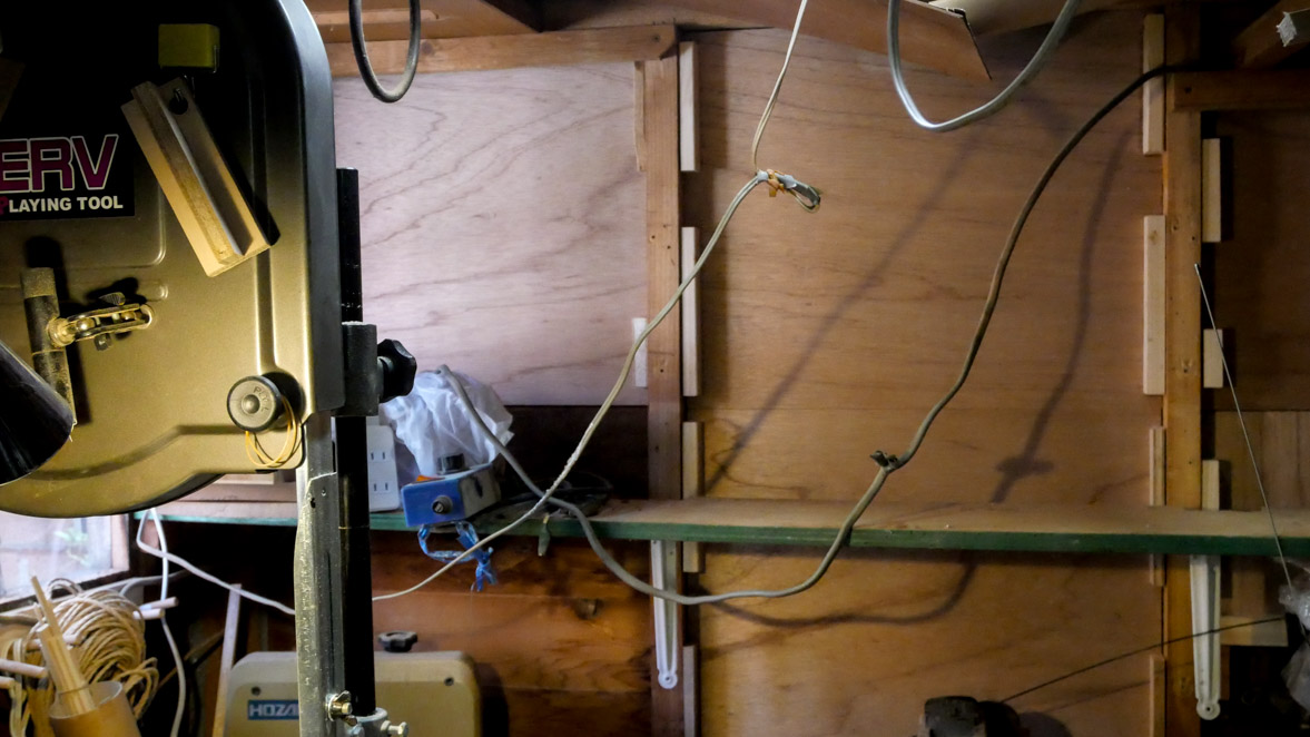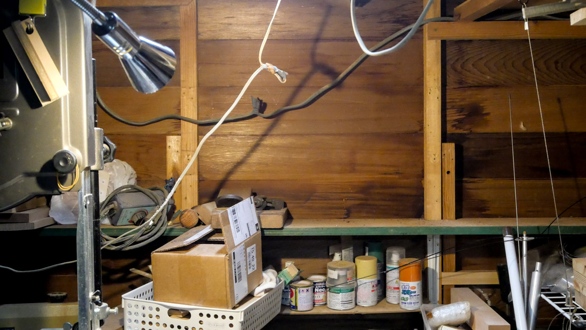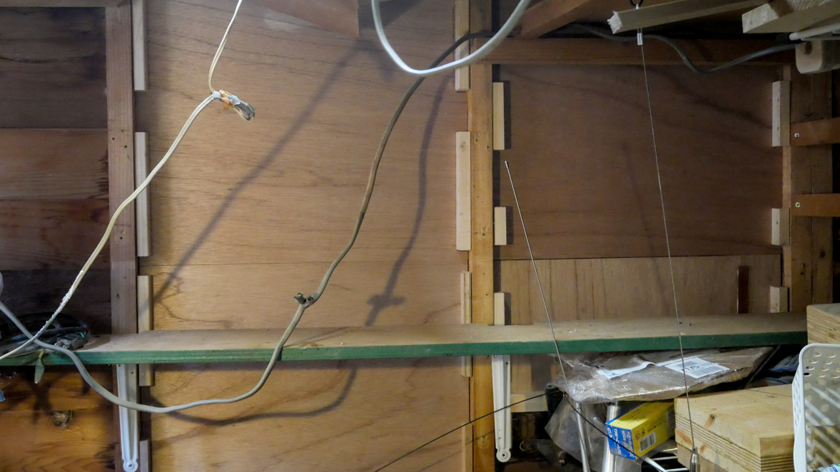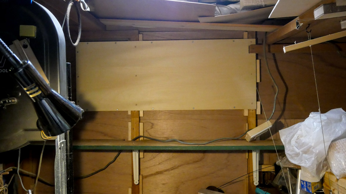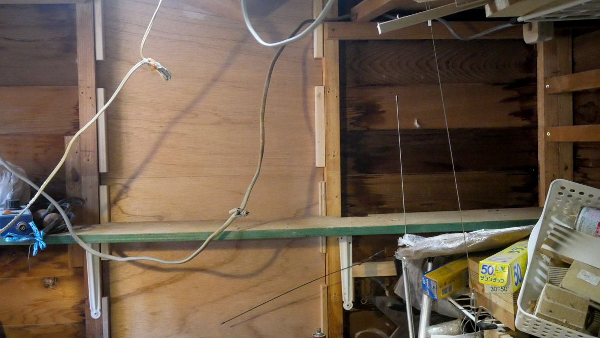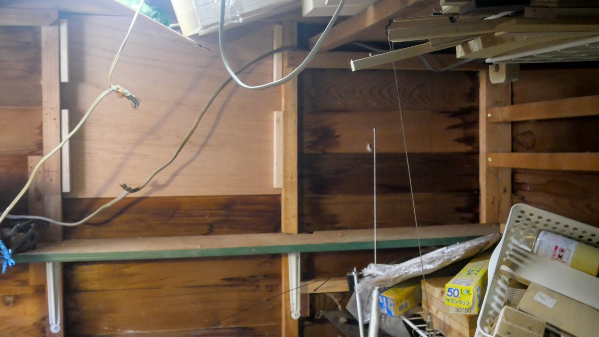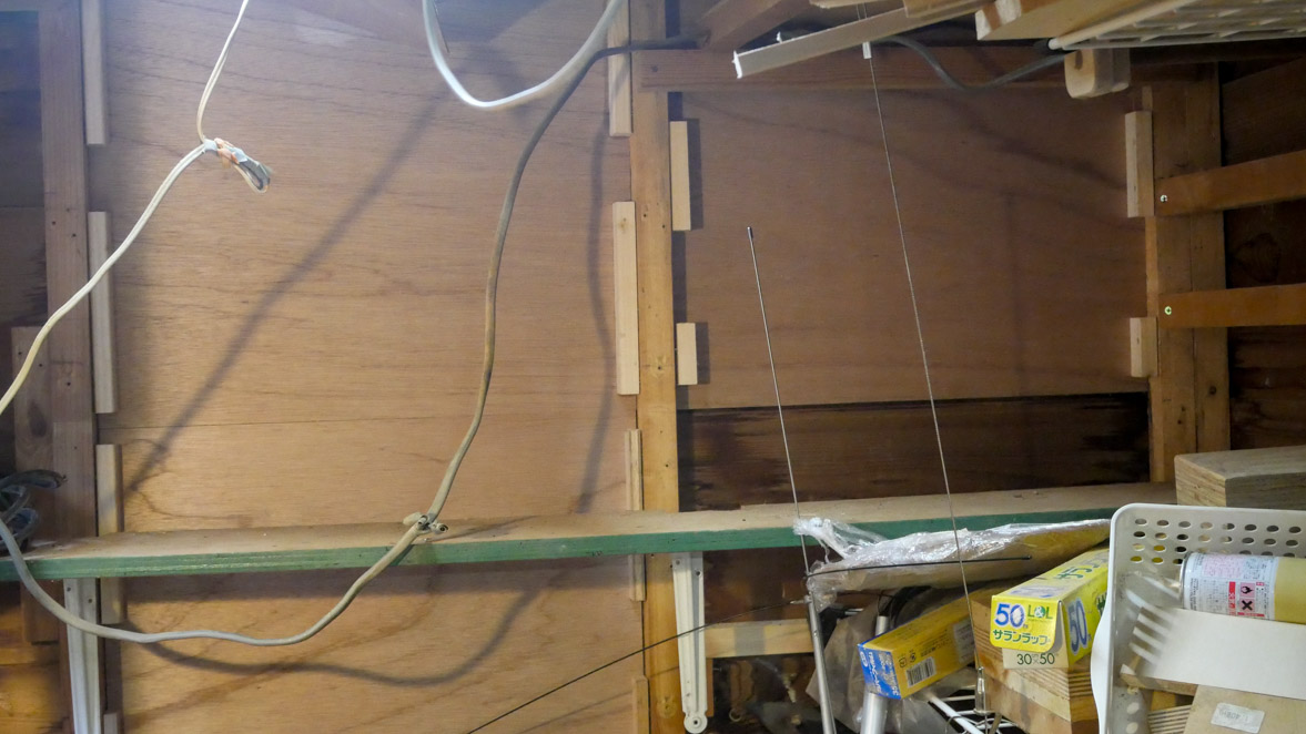 先ず初めに取り掛かったのは、室内機取り付けスペースの確保です。とにかく所狭しと棚を作ってあるので、室内機を取り付けるには、その面のかなりの棚を外して、壁面の補強等を施さなければなりません。普段から片付いていない状態が一層大変な状態になりましたが、とにかく壁面に5㎜厚のべニアを張りました。