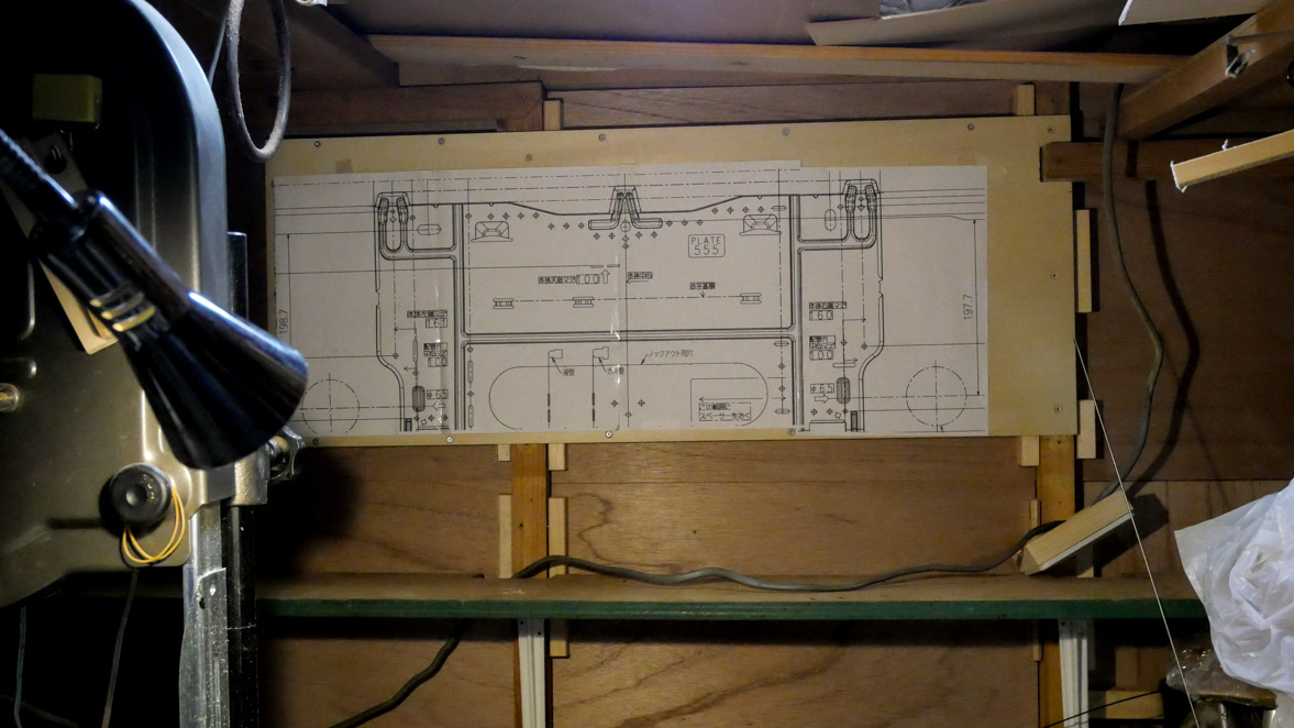 次に室外機を取り付ける場所に、9㎜厚のシナ合板(350㎜×900㎜)を取り付けました。MSZ-GE2224の背板のPdfをダウンロードして、実寸大の型紙を作って張り付けてみました。