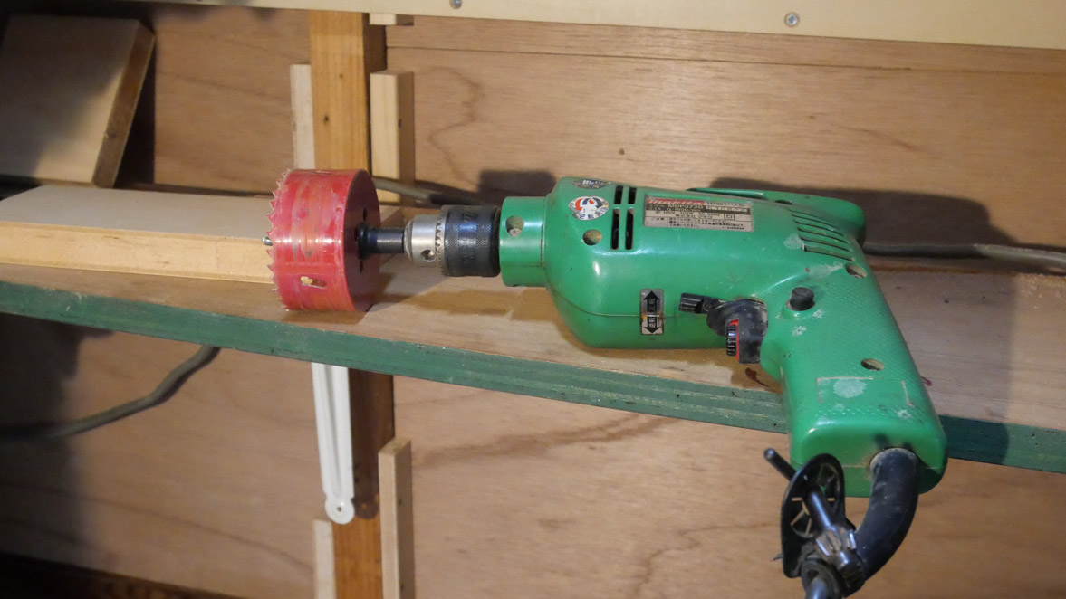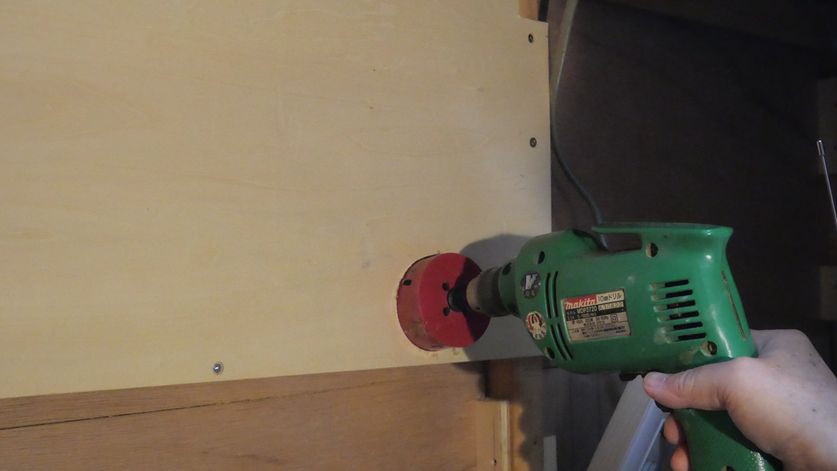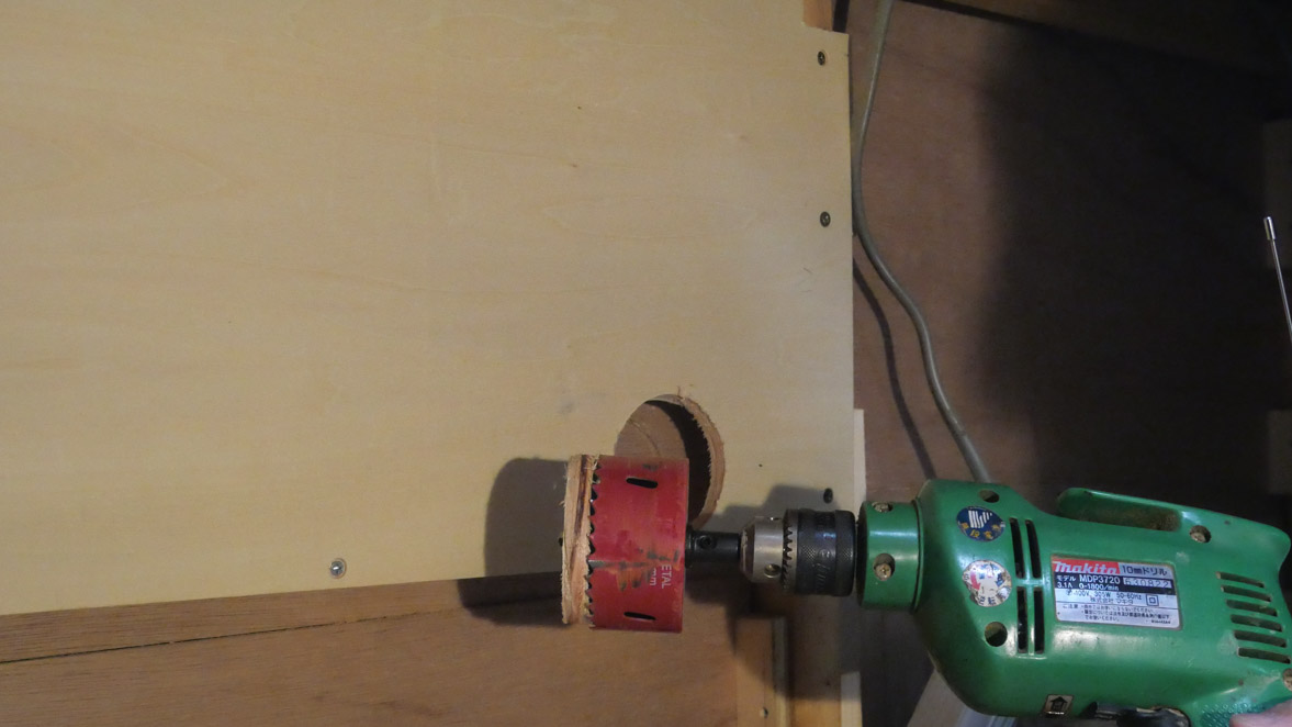 これで、室内機取り付け時のイメージがつかめるようになり、配管を通す孔を開けられる場所や送風方向や、周辺に改めて取り付ける棚の位置などを考慮して室内機の取り付け位置を決めました。これで配管を通す孔の位置が決まりました。65mmφの配管スリーブを取り付けるので、貫通孔は70mmφのホールソーを電動ドリルに付けて使いました。