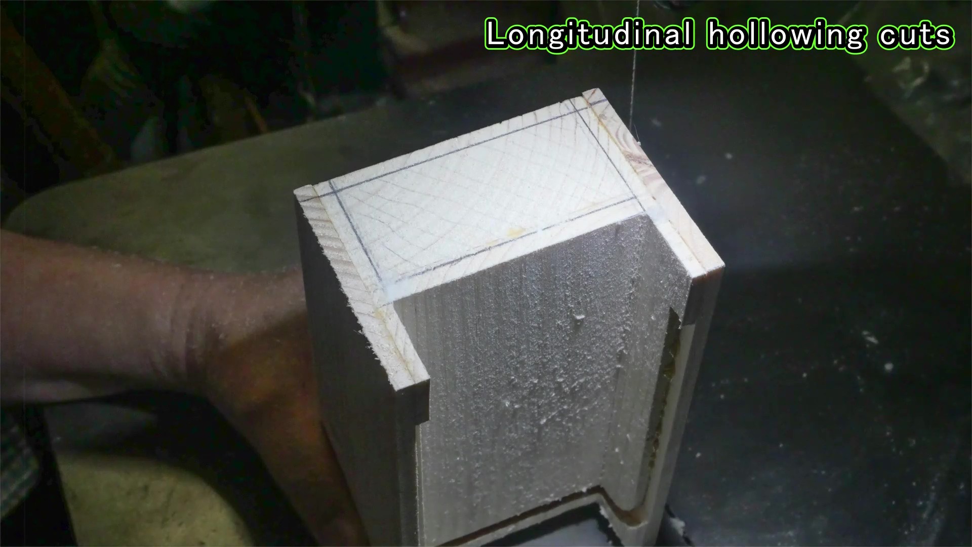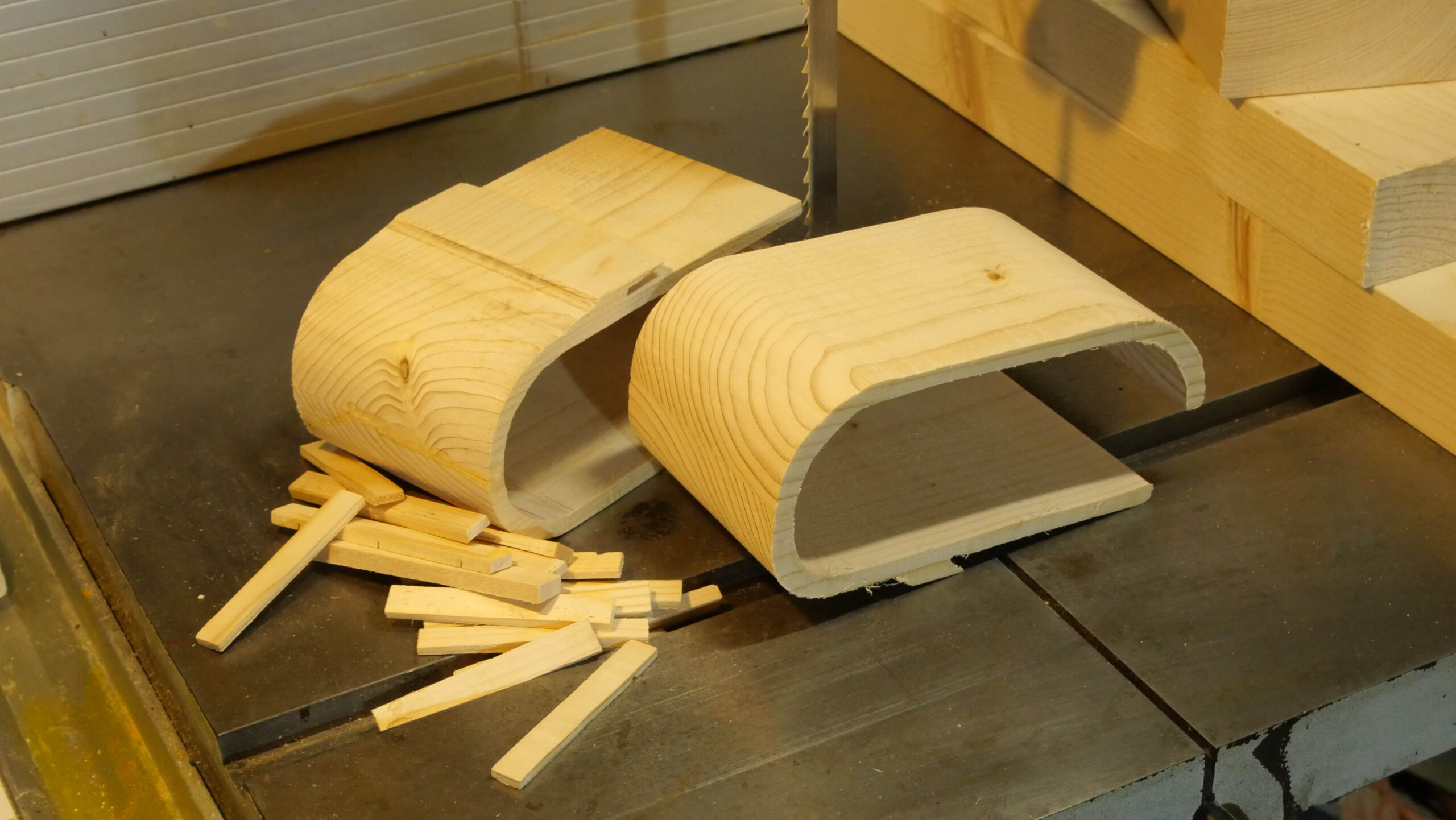 今回は、このタンボールBOXをどうにかして、バンドソーで作れないかと考えてみて、試行錯誤しました。基本は、通常のバンドソーボックスの制作方法を踏襲して、2×4材で作った基本ブロックをバンドソーでくり抜いていく手法ですが、蛇腹のレールになる溝の作り方が味噌です(上記写真)。詳細はネットにアップした動画で示します。