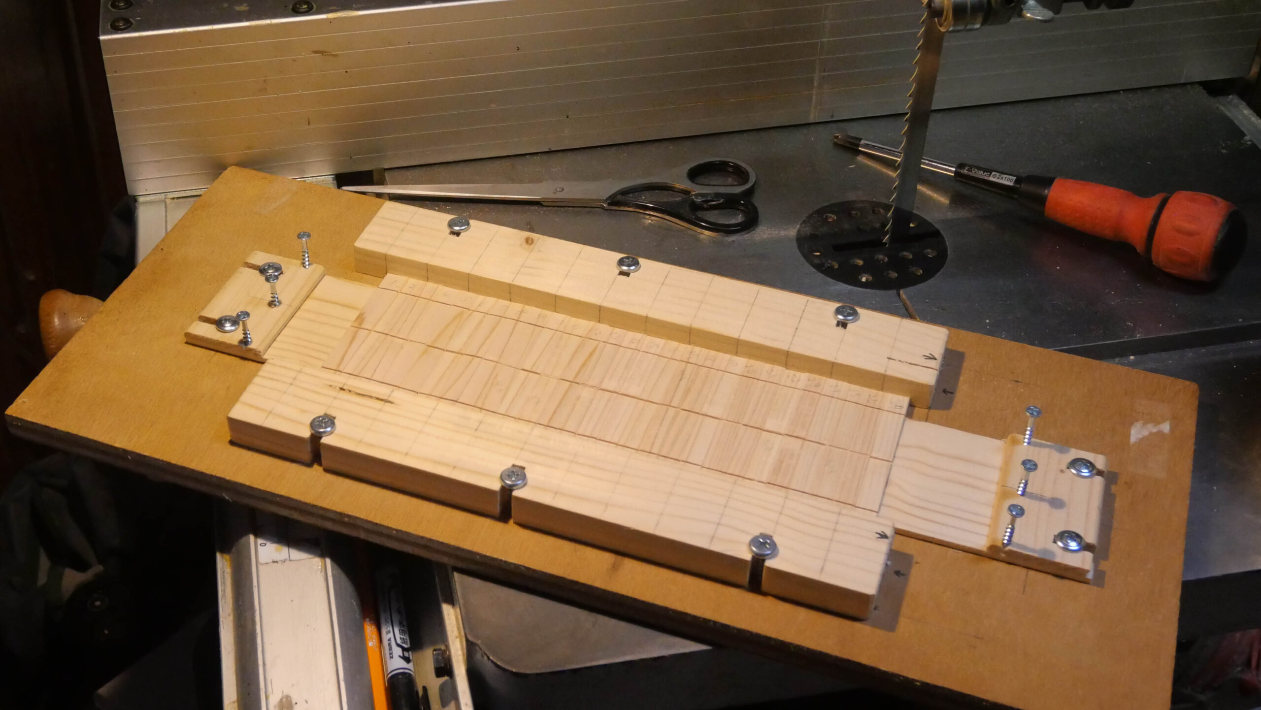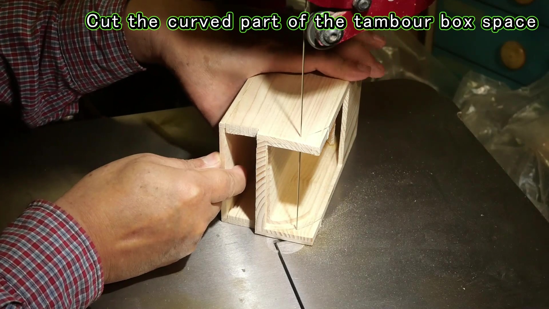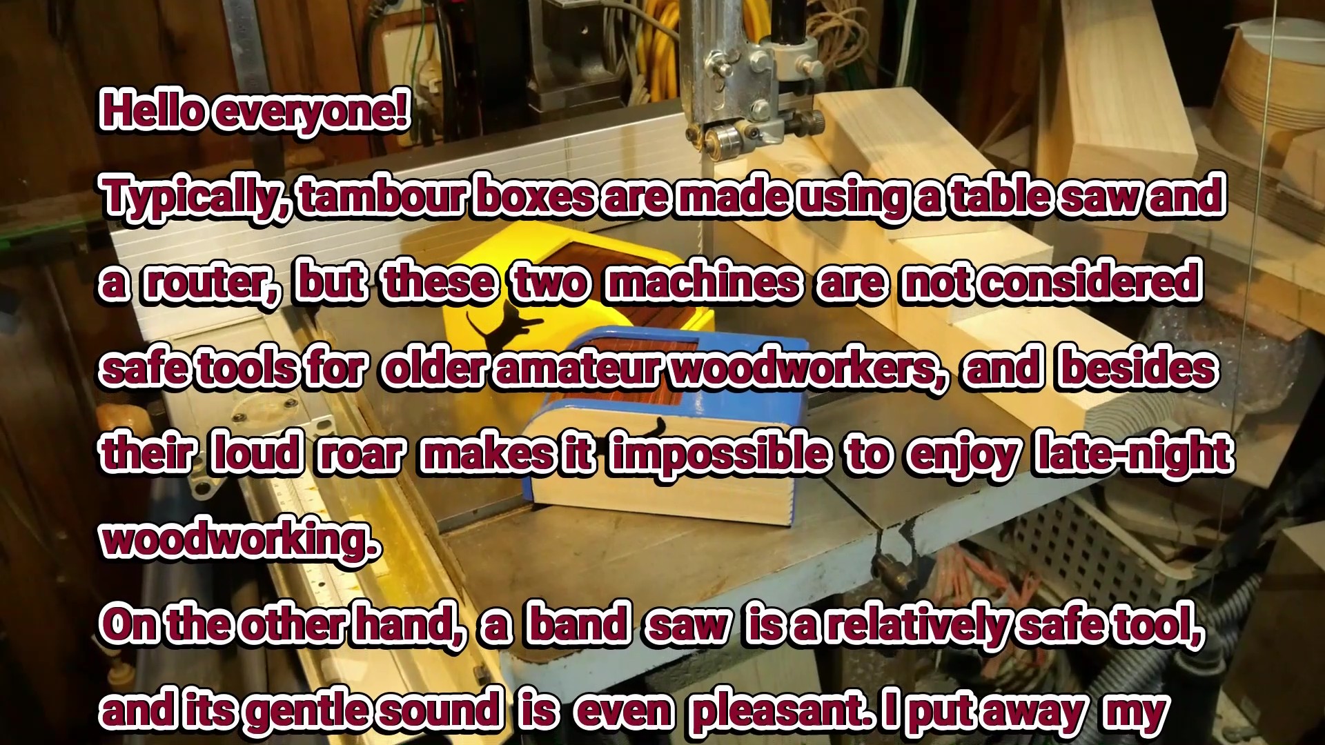 そこで、通常は、タンボールBOXは、テーブルソーとルーターを使って作られます。どちらも正確な加工が得意ですが、この二つの機械は、高齢のDIYerにとって安全なツールとは言えないし、なにしろその爆音は夜中の楽しい木工作を許してくれません。一方、バンドソーは比較的安全なツールであり、加えて、その軽やかな音は心地良くさえ聞こえます(私の主観です)。私は25年前にテーブルソーとルーターを片付けてしまい、バンドソーを中心に木工作を楽しんでいます。もちろん、真夜中の作業は至福の一時です。